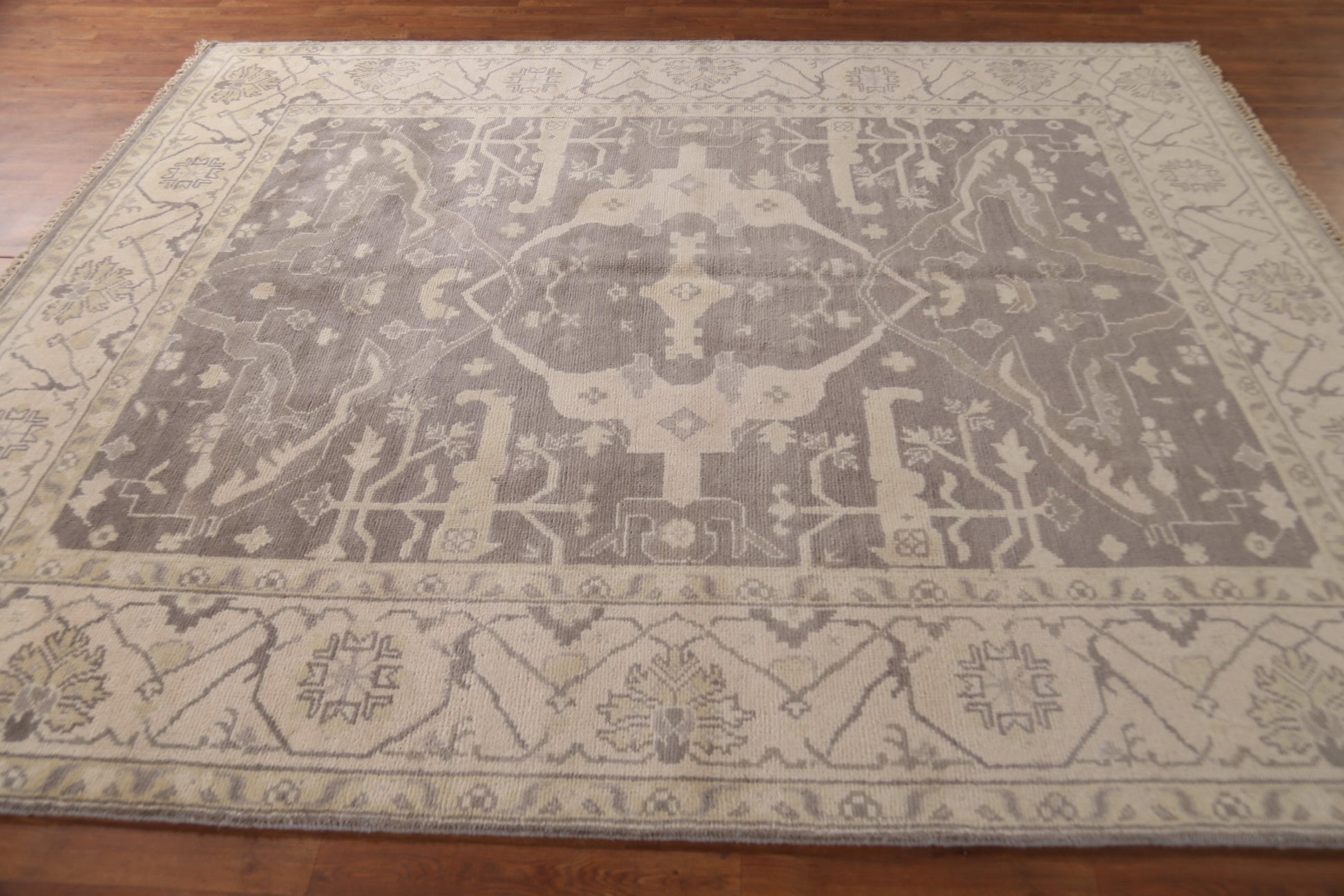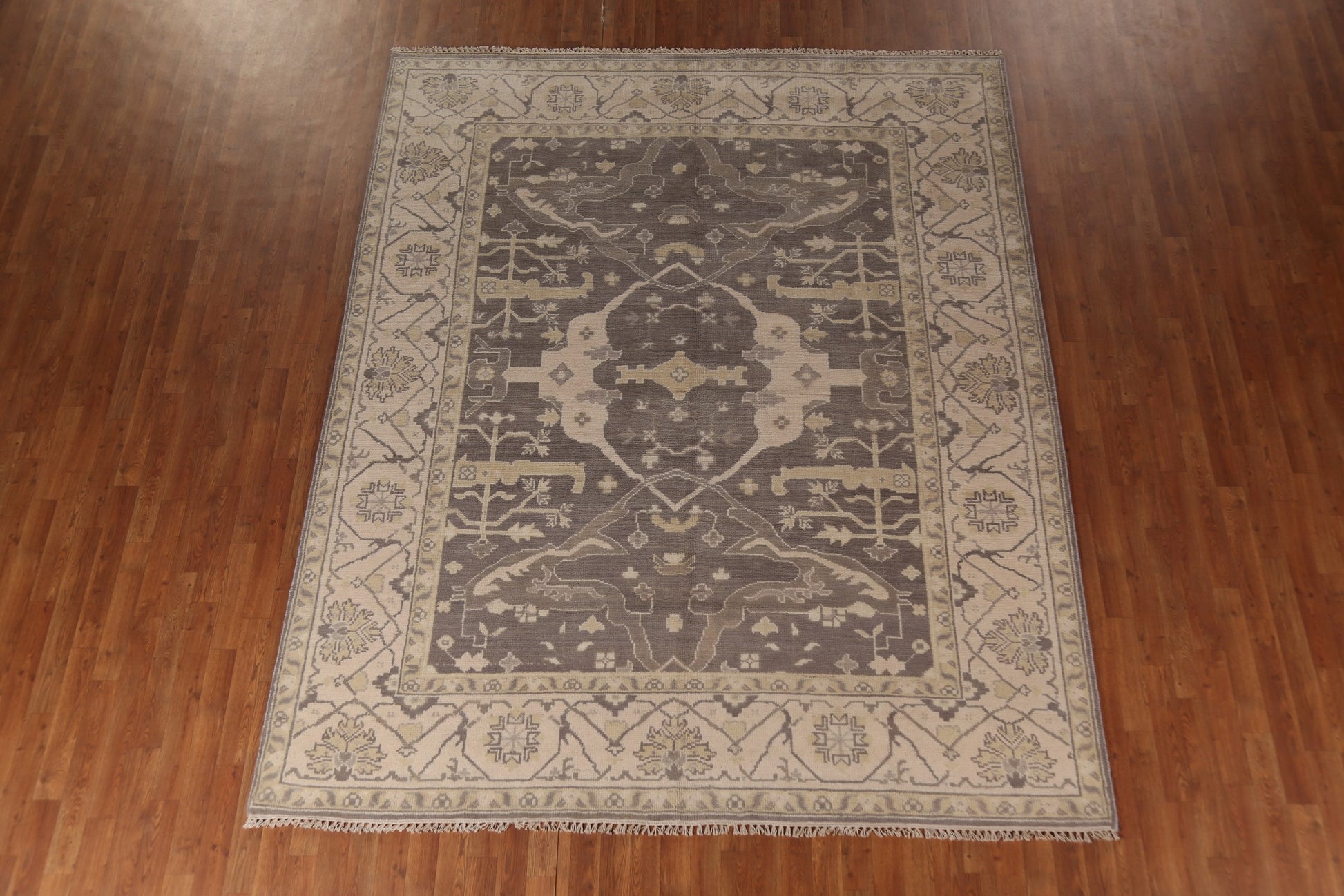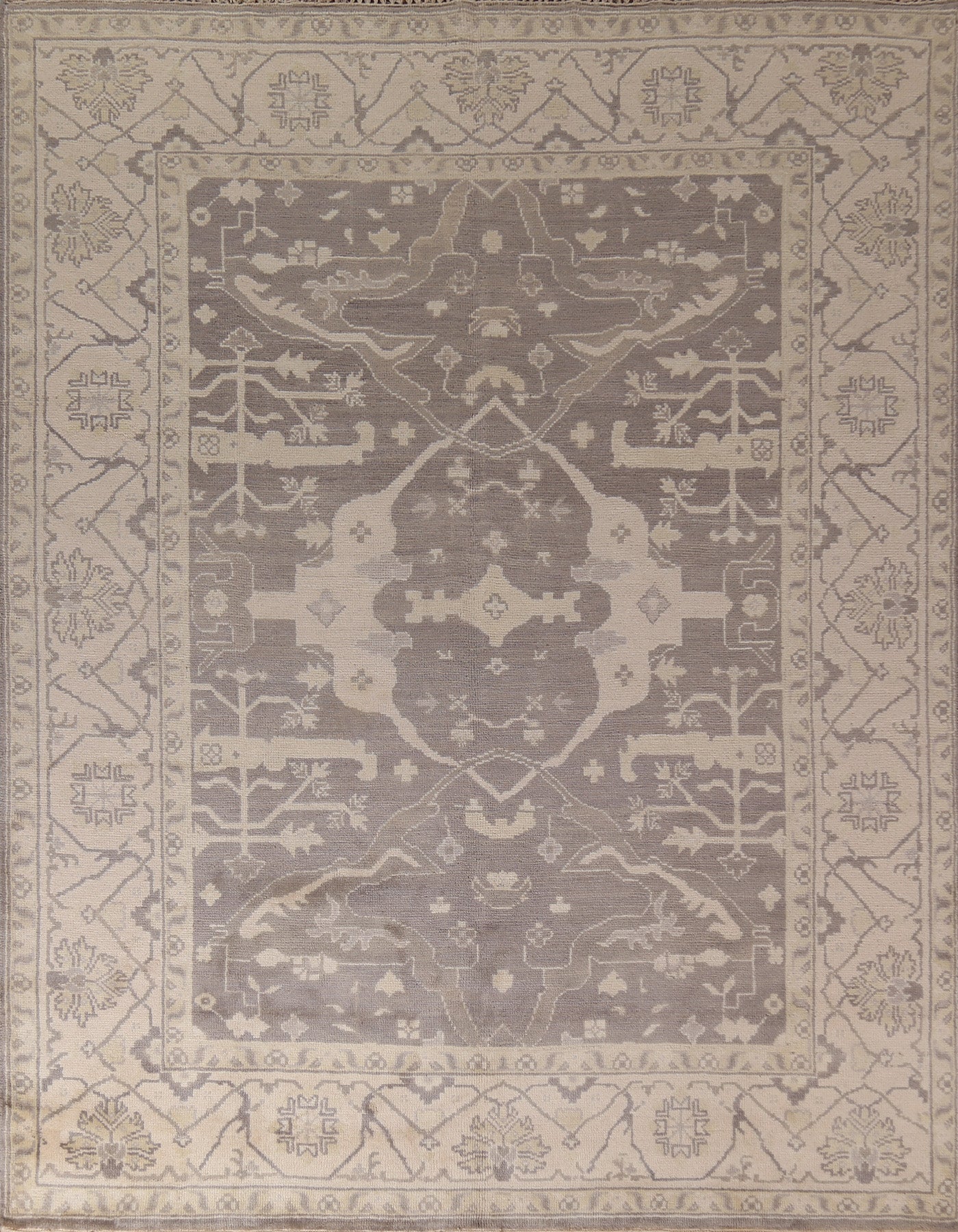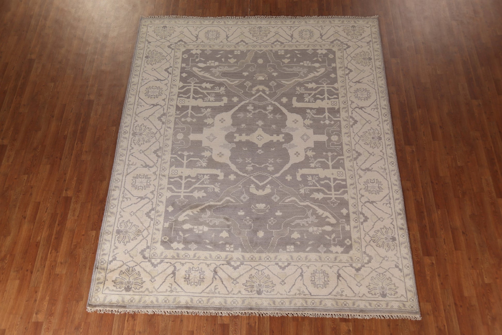 A Beautiful Genuine India Oushak rug is Hand Knotted by skillful weavers in India with 100% Wool Material. This rug is in New, First Quality condition. dimensions are 9' 9'' X 8' 0'' in foot and 297 X 244 in centimeter. the primary color is Greys & Charcoal.