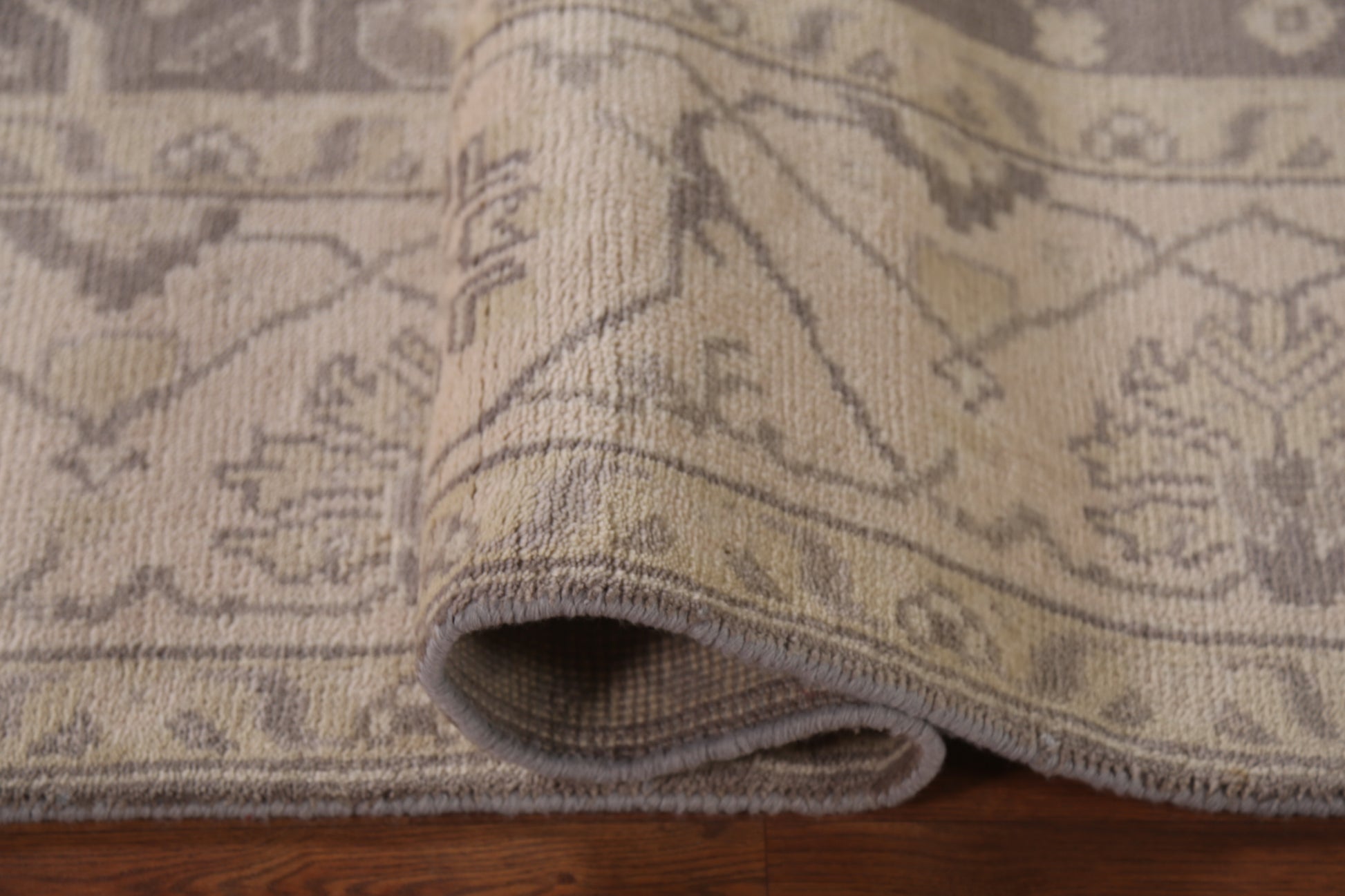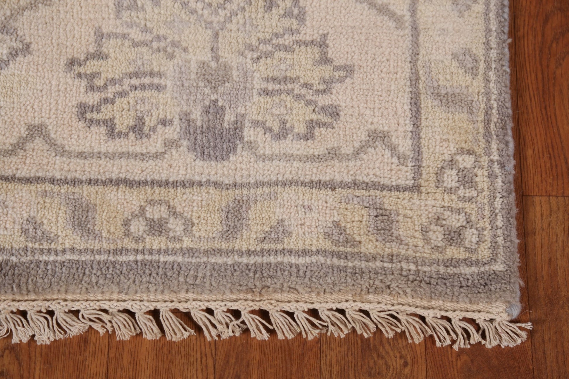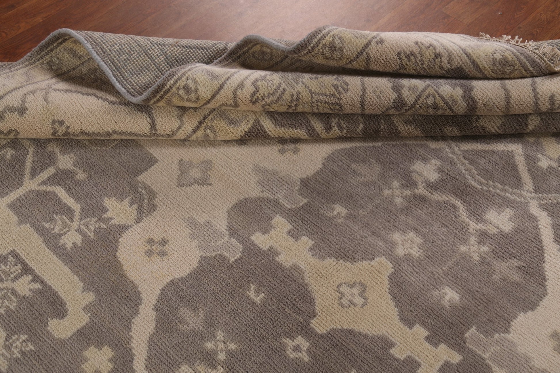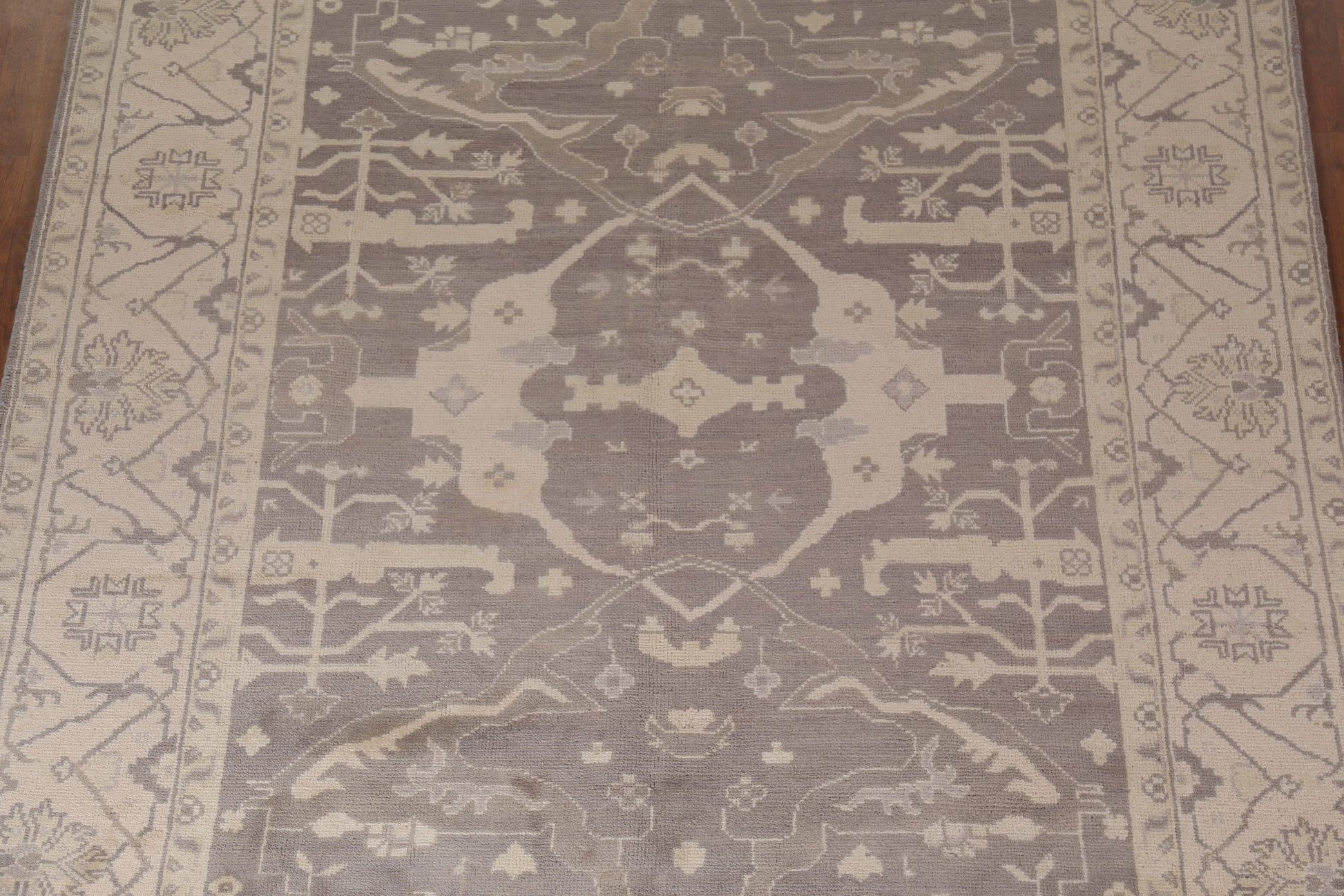 A Beautiful Genuine India Oushak rug is Hand Knotted by skillful weavers in India with 100% Wool Material. This rug is in New, First Quality condition. dimensions are 9' 9'' X 8' 0'' in foot and 297 X 244 in centimeter. the primary color is Greys & Charcoal.