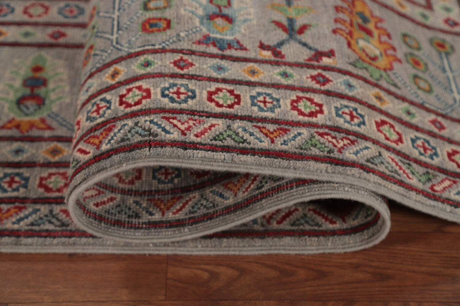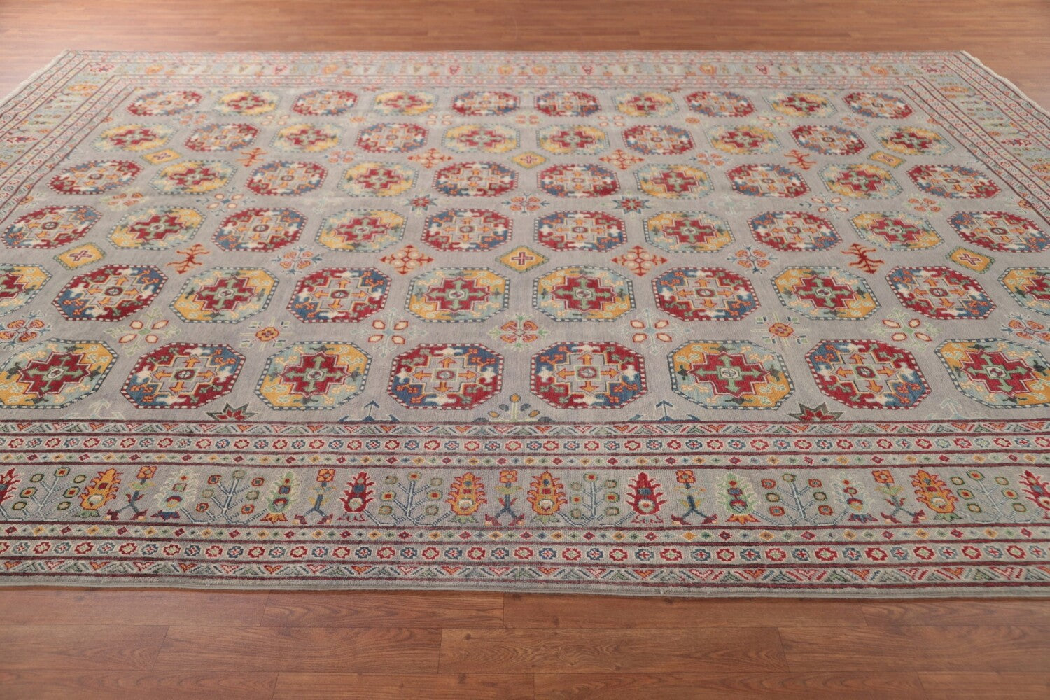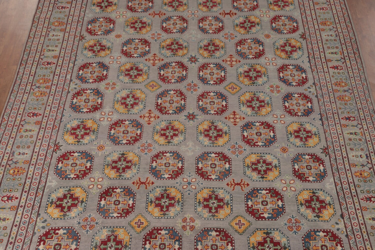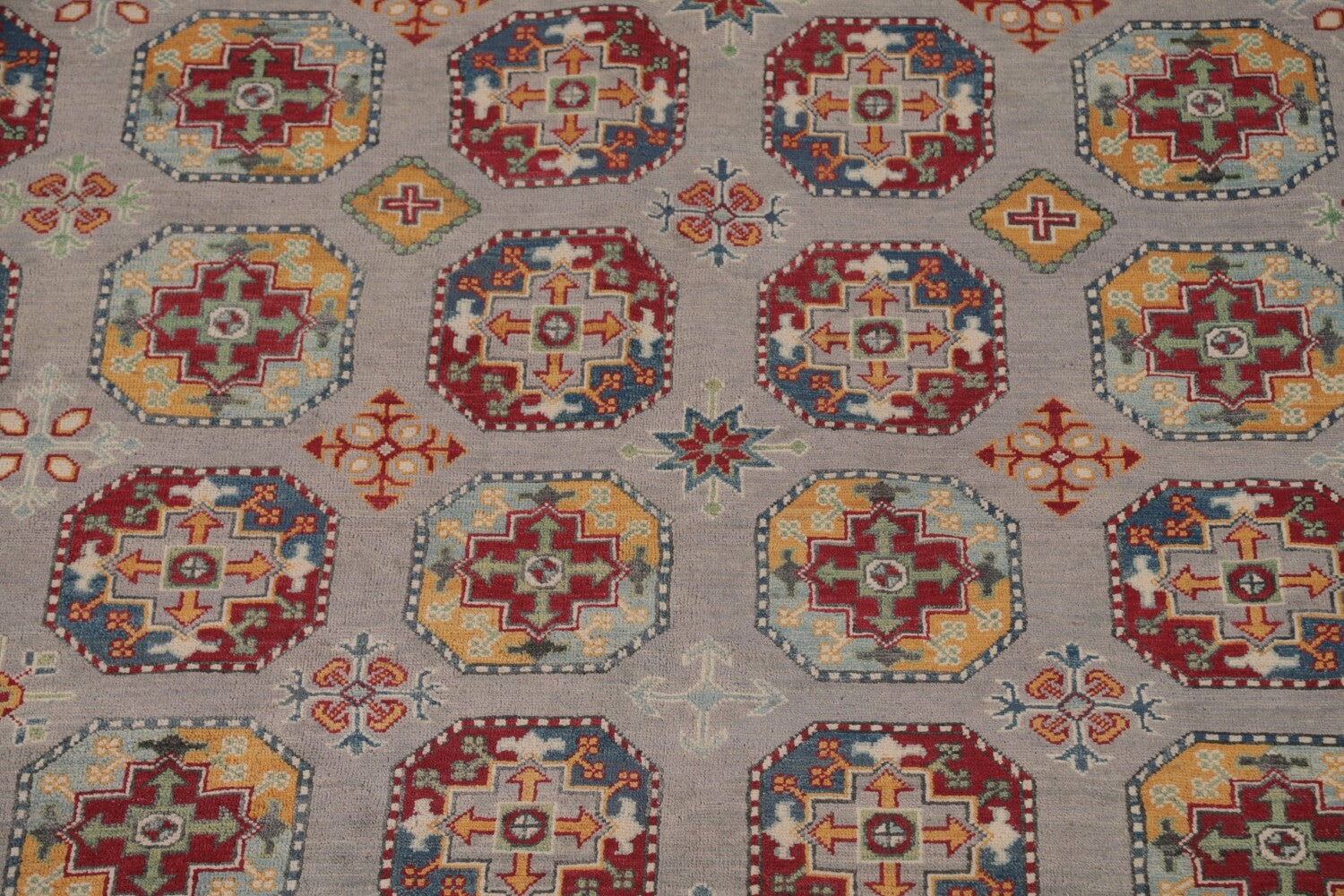 A Beautiful Genuine Pakistan Kazak rug is Hand Knotted by skillful weavers in Pakistan with 100% Wool Material. This rug is in New, First Quality condition. dimensions are 13' 1'' X 9' 7'' in foot and 399 X 292 in centimeter. the primary color is Greys & Charcoal.