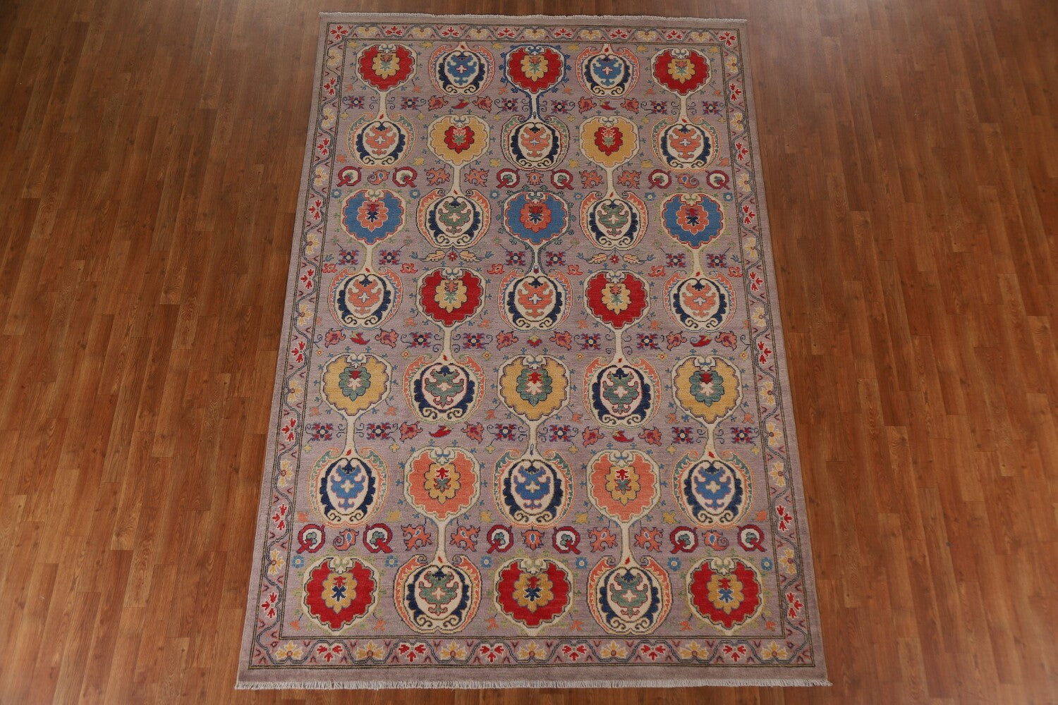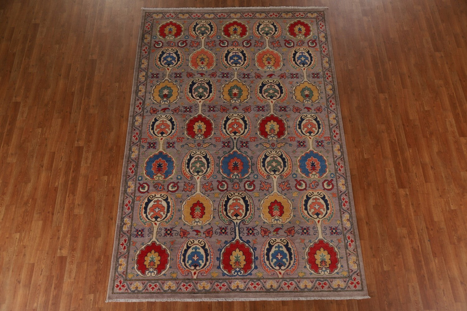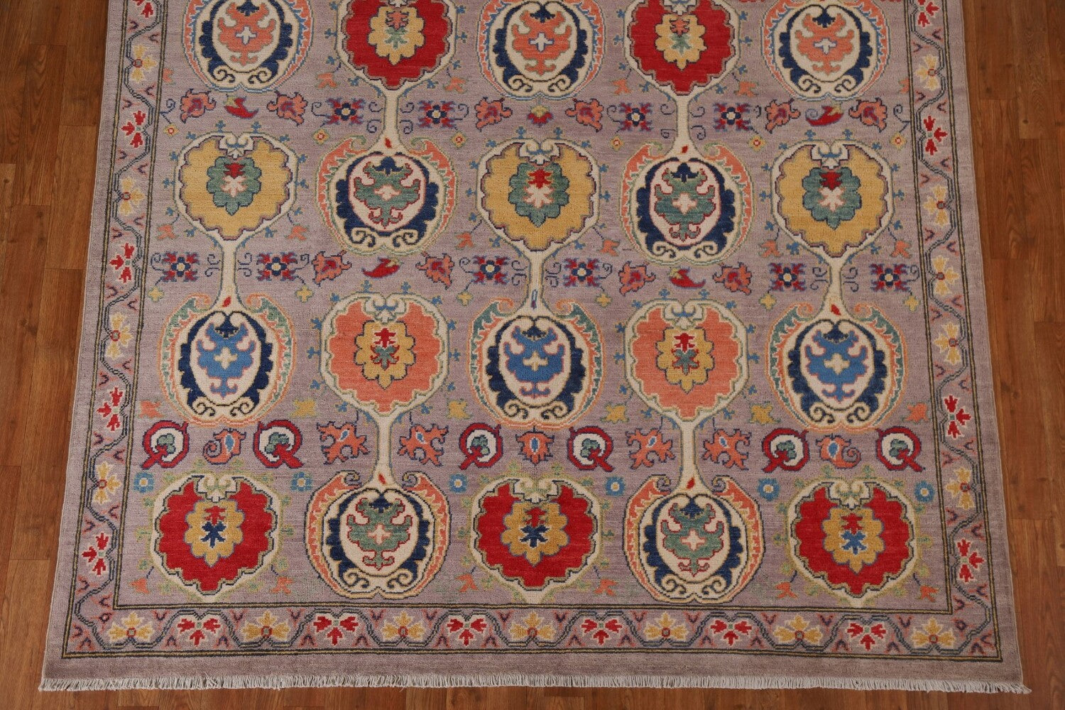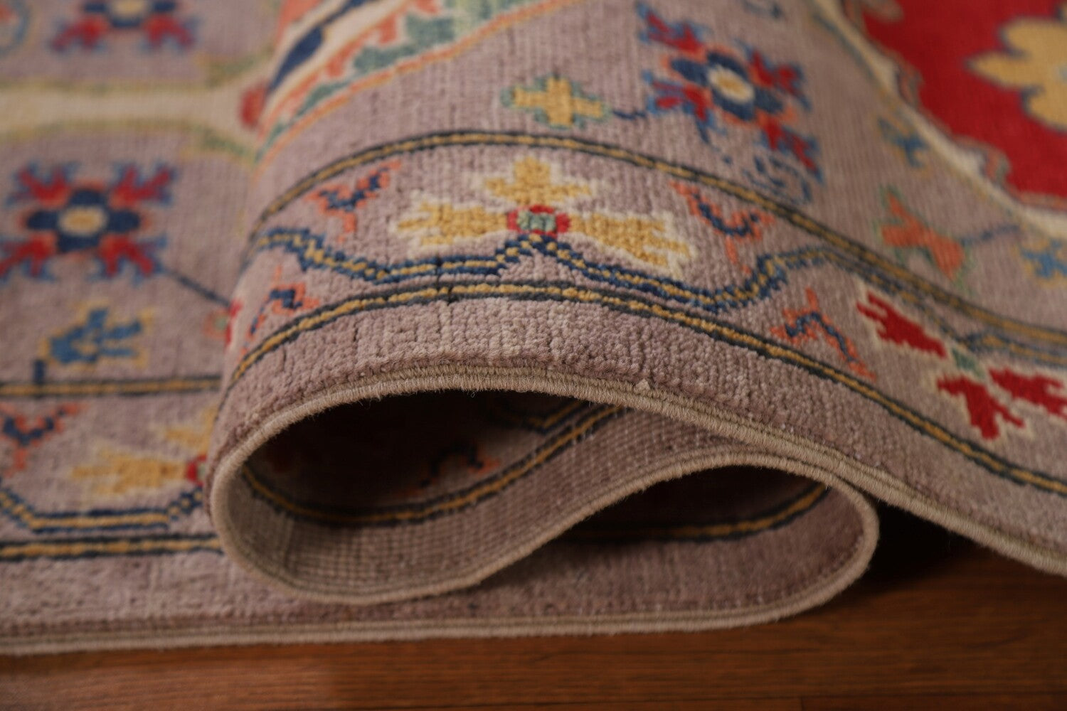 A Beautiful Genuine Pakistan Kazak rug is Hand Knotted by skillful weavers in Pakistan with 100% Wool Material. This rug is in New, First Quality condition. dimensions are 9' 11'' X 6' 7'' in foot and 302 X 201 in centimeter. the primary color is Purples.