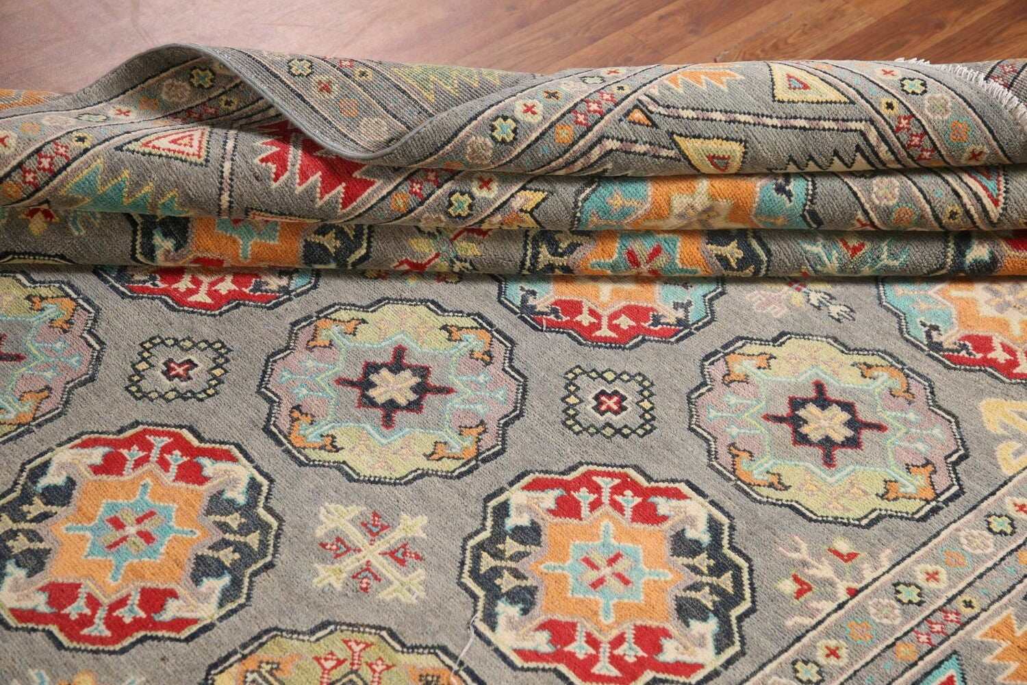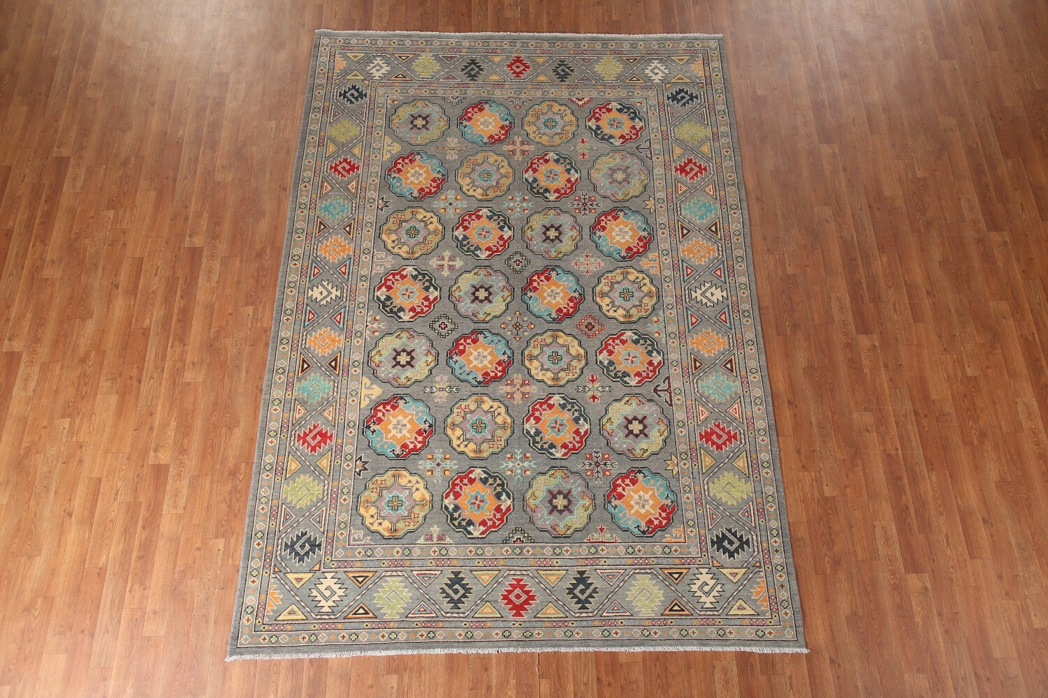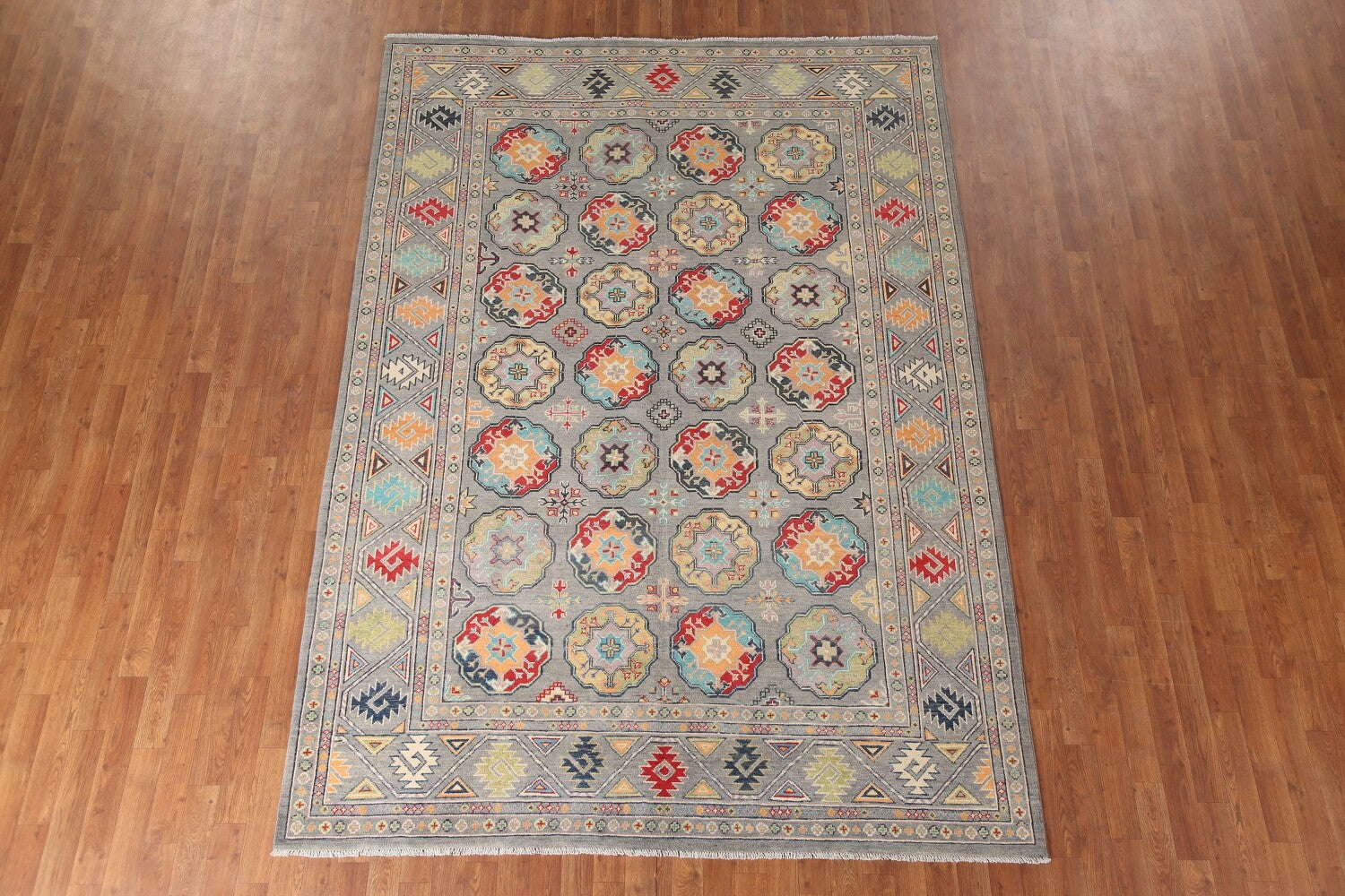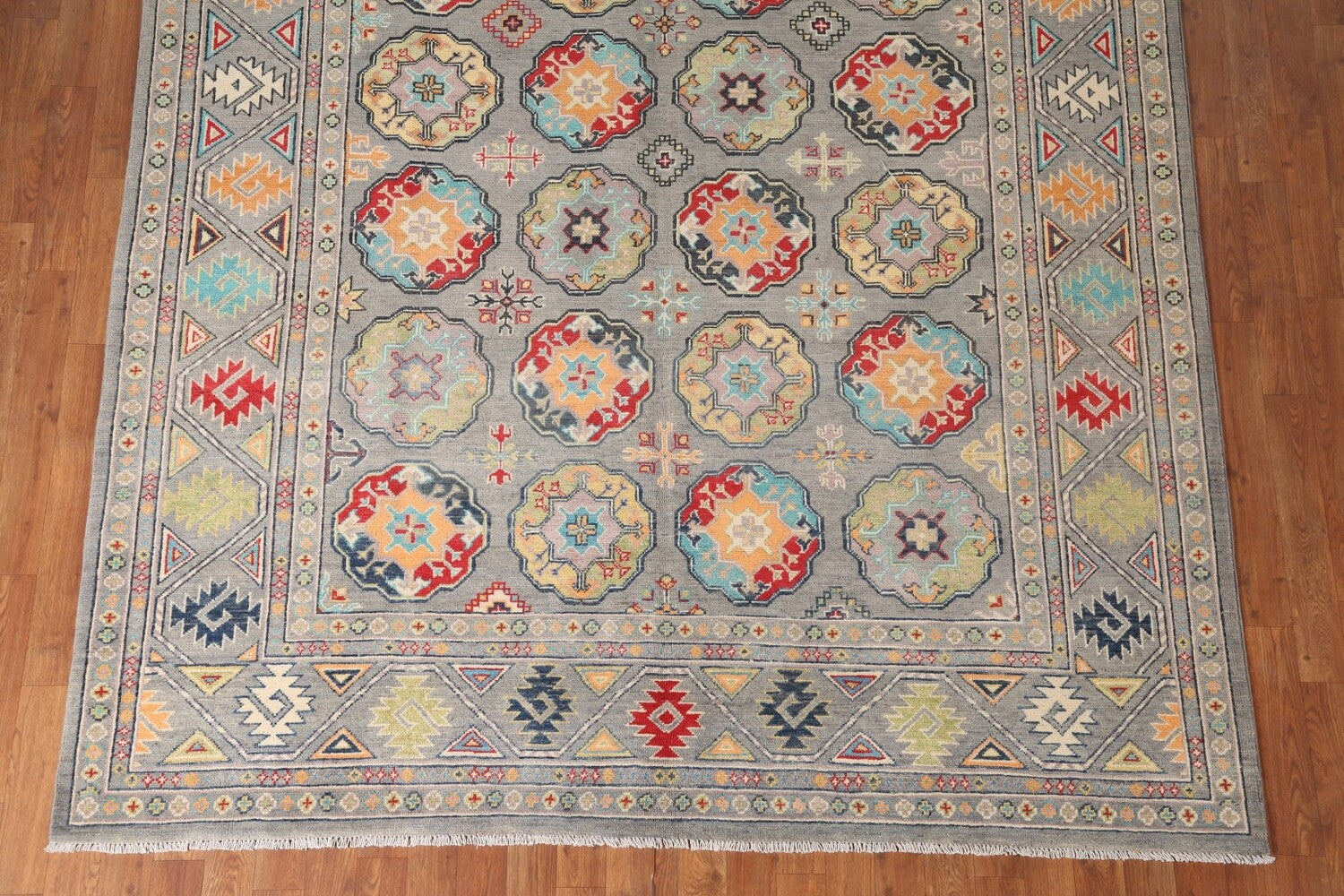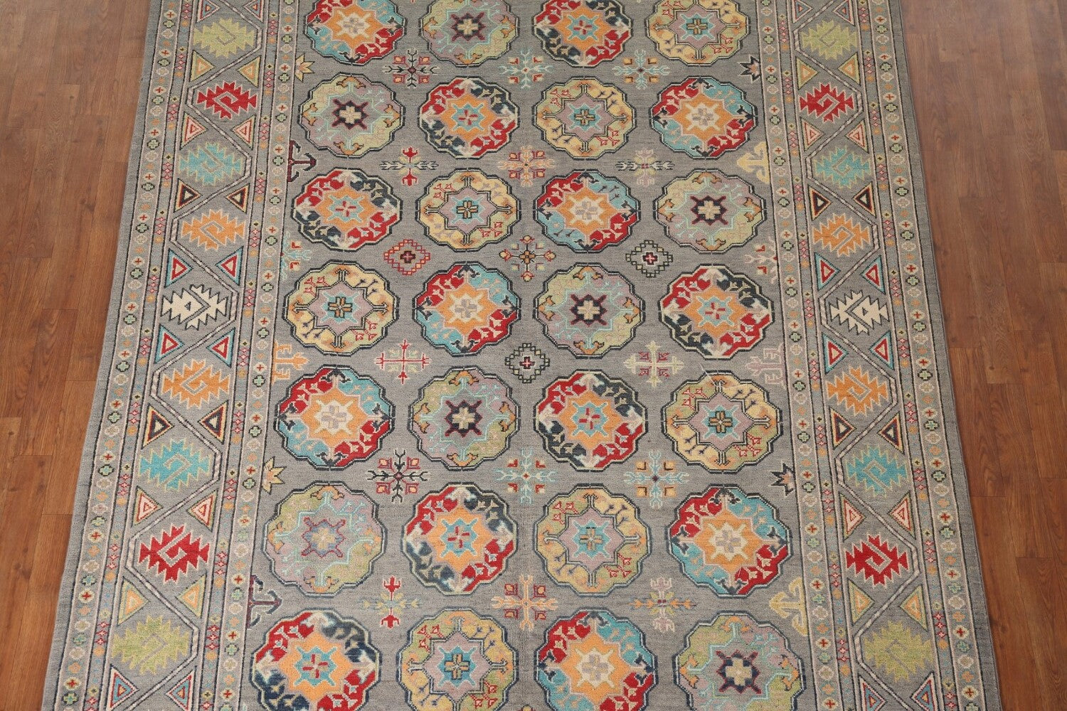 A Beautiful Genuine Pakistan Kazak rug is Hand Knotted by skillful weavers in Pakistan with 100% Wool Material. This rug is in New, First Quality condition. dimensions are 9' 8'' X 6' 9'' in foot and 295 X 206 in centimeter. the primary color is Greys & Charcoal.