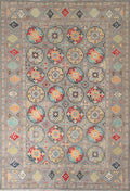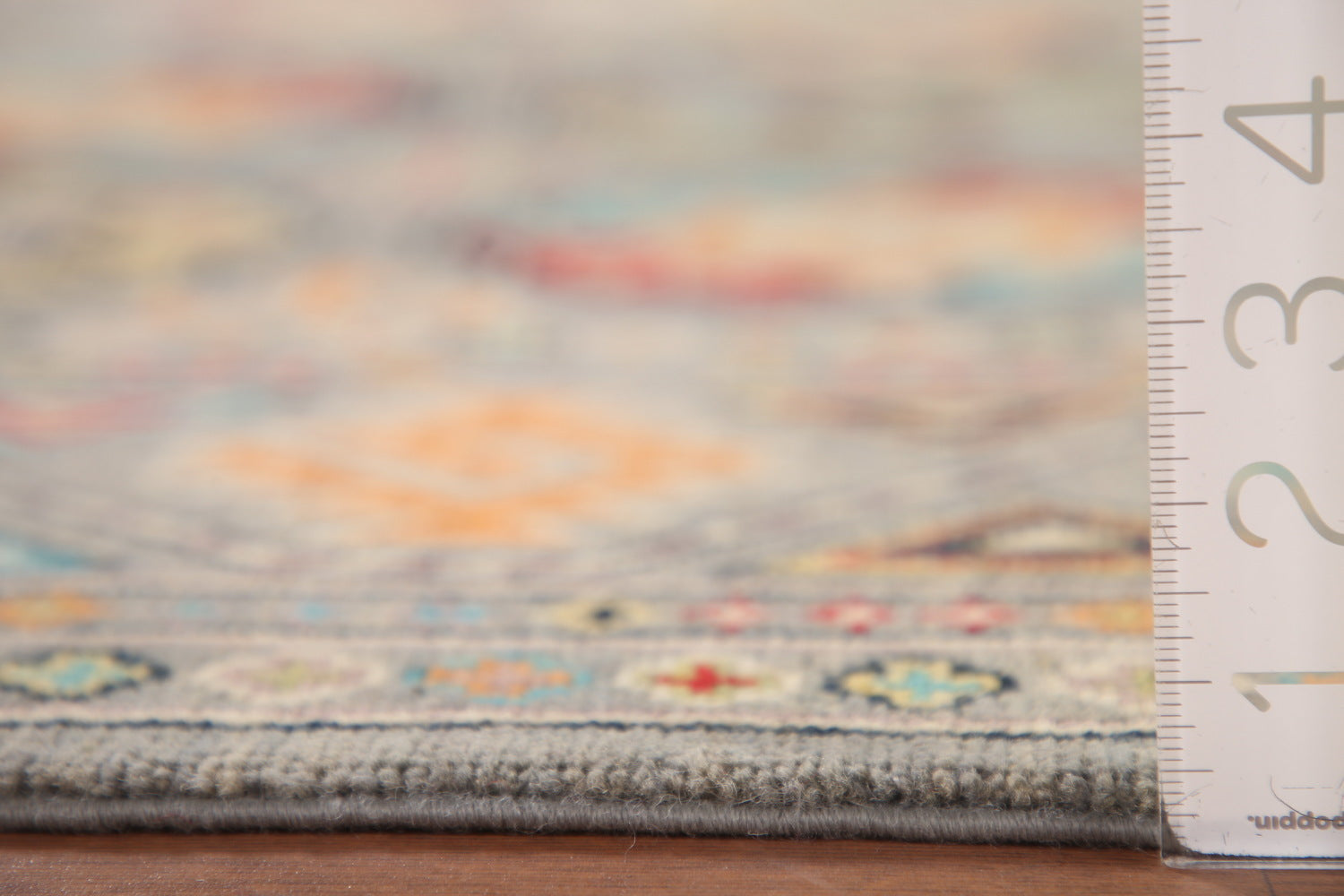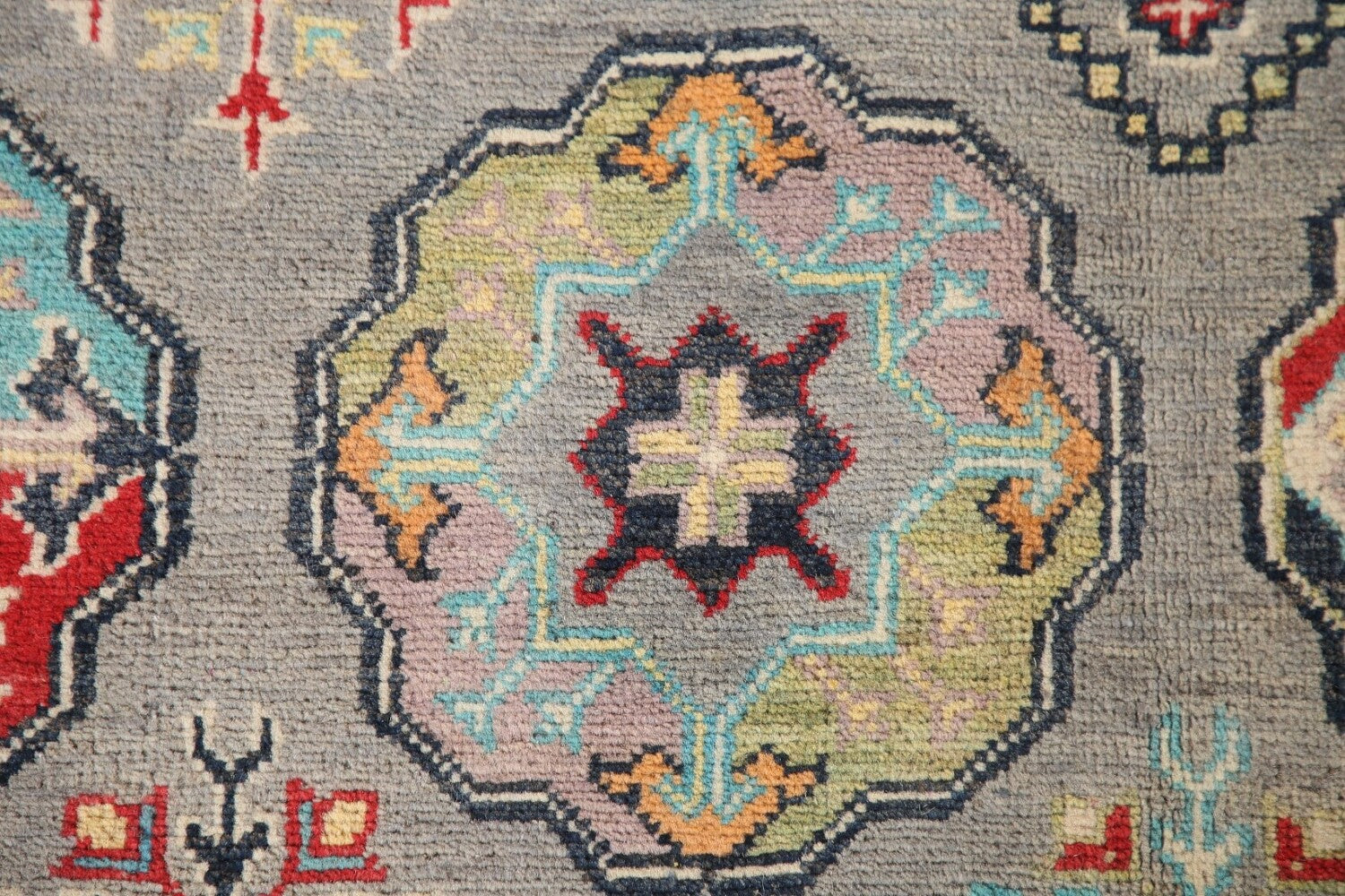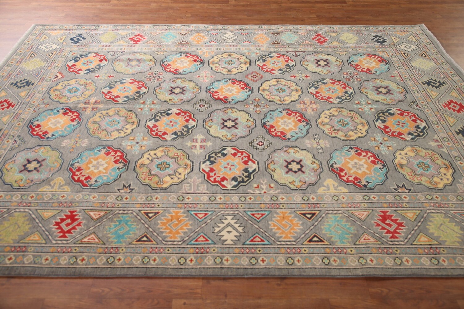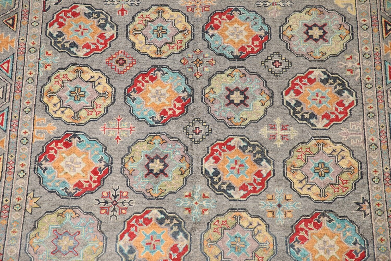 A Beautiful Genuine Pakistan Kazak rug is Hand Knotted by skillful weavers in Pakistan with 100% Wool Material. This rug is in New, First Quality condition. dimensions are 9' 8'' X 6' 9'' in foot and 295 X 206 in centimeter. the primary color is Greys & Charcoal.