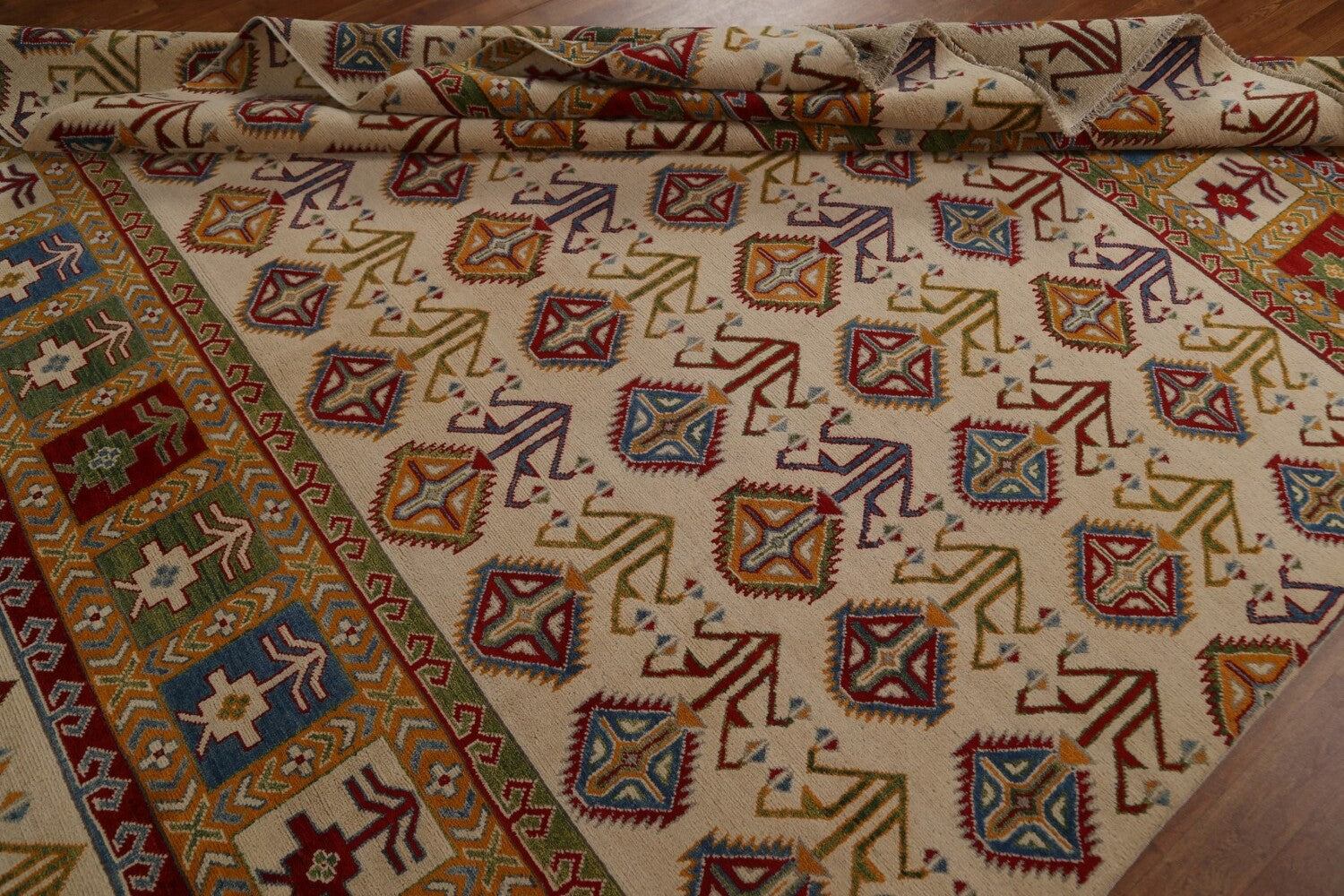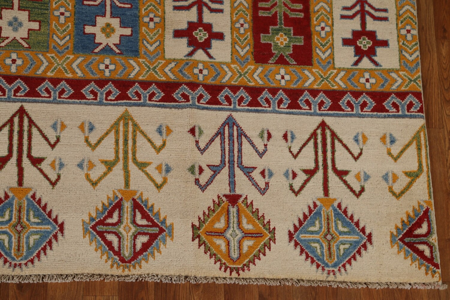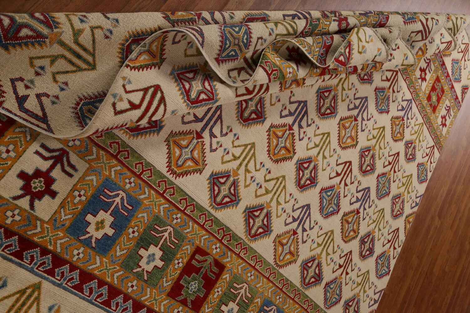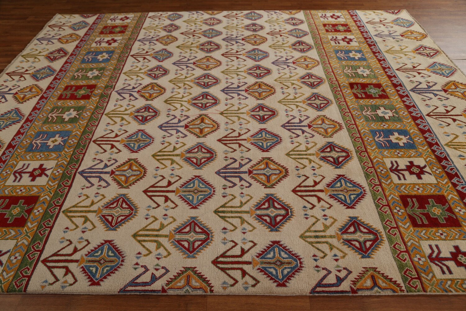 A Beautiful Genuine Pakistan Kazak rug is Hand Knotted by skillful weavers in Pakistan with 100% Wool Material. This rug is in condition. dimensions are 9' 10'' X 8' 3'' in foot and 300 X 251 in centimeter. the primary color is Beige & Ivories.