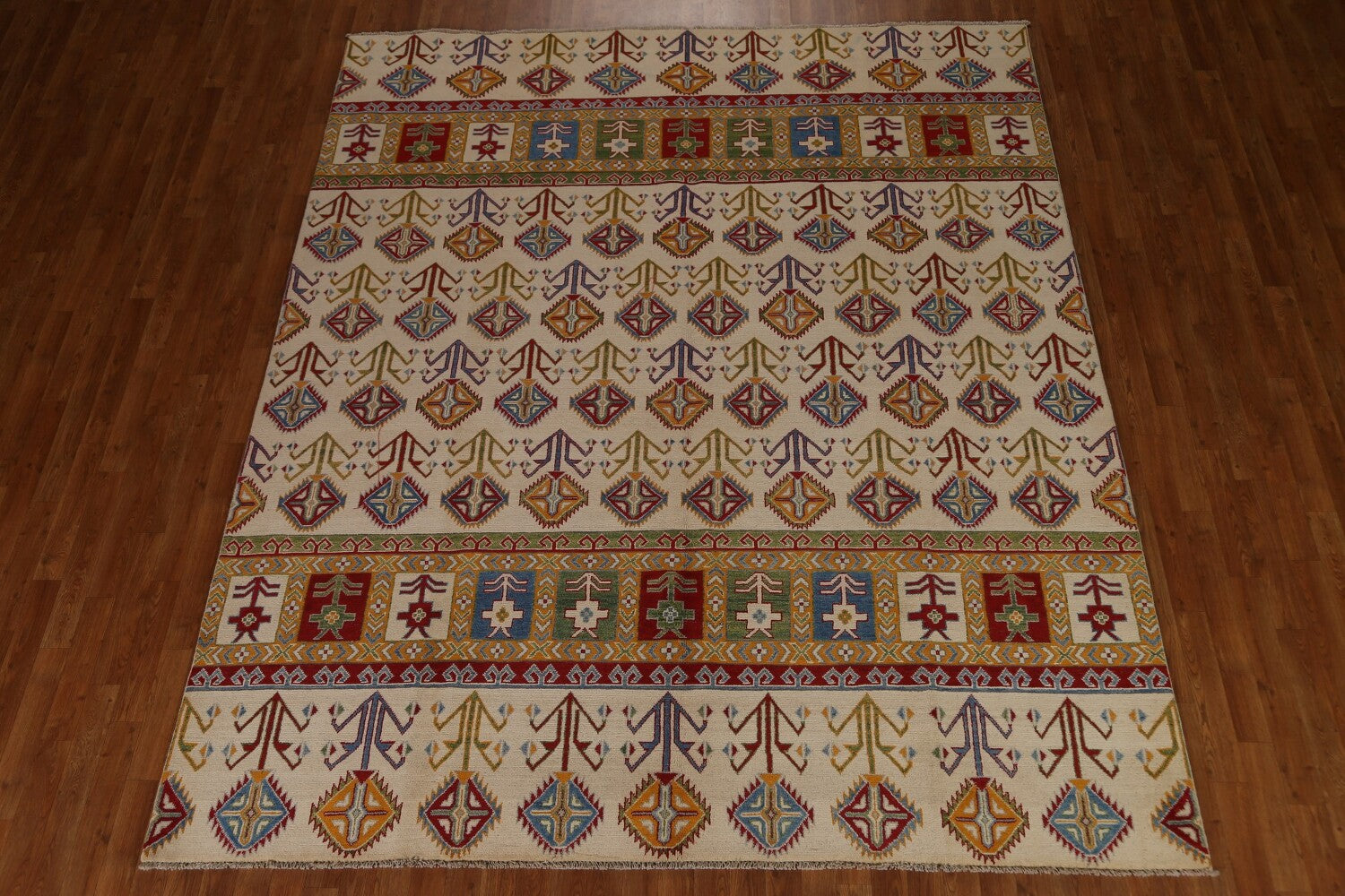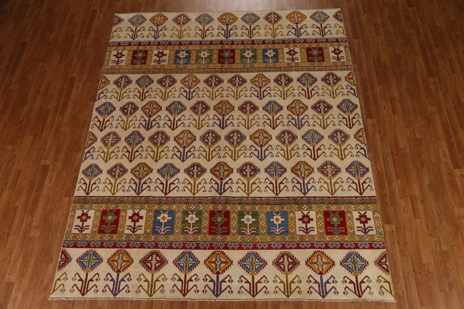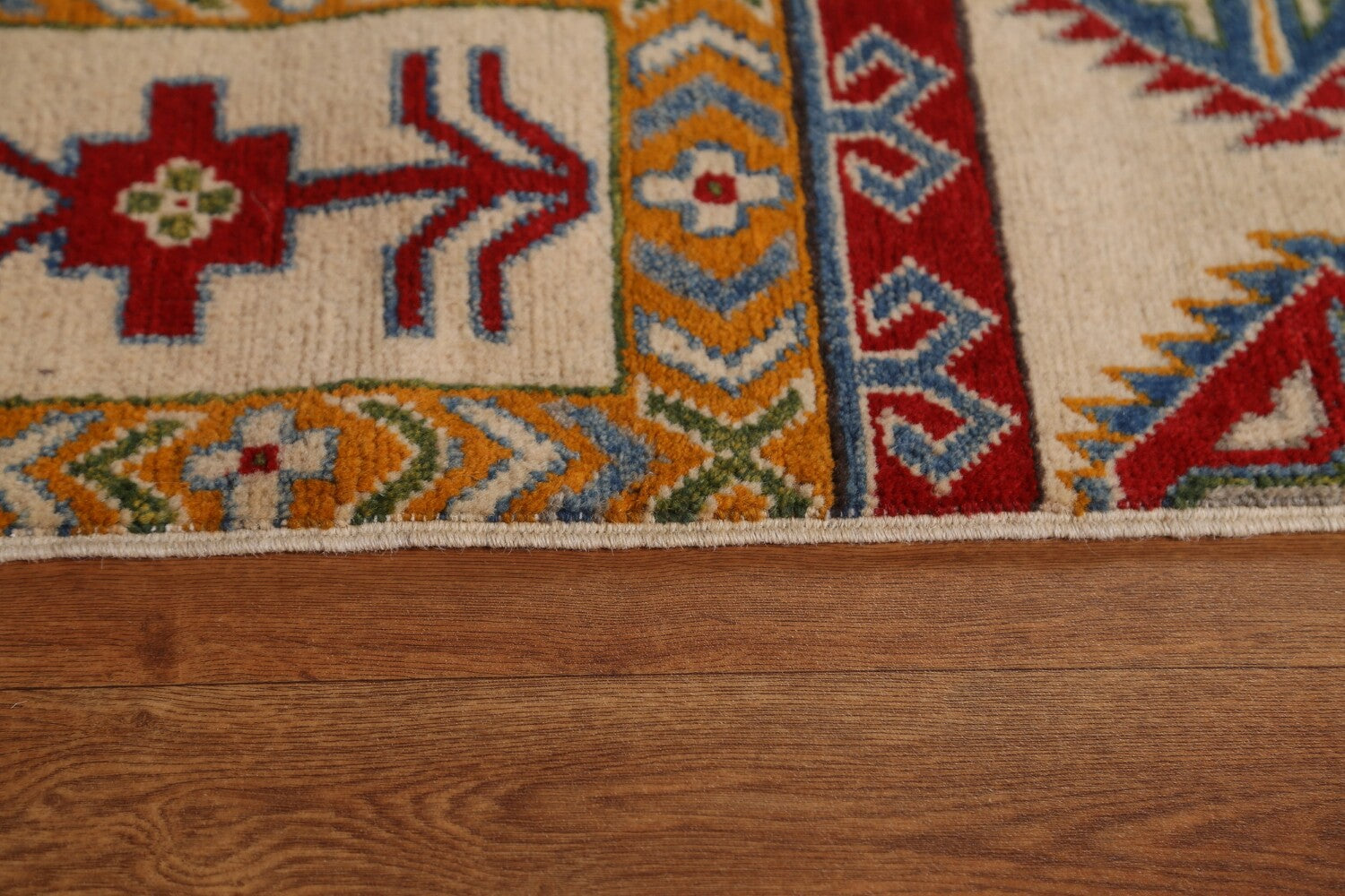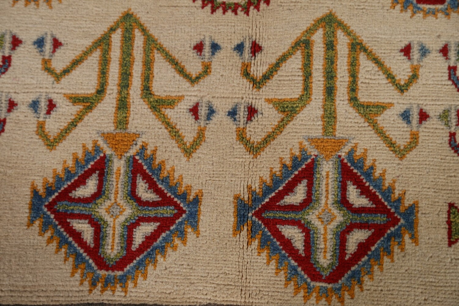 A Beautiful Genuine Pakistan Kazak rug is Hand Knotted by skillful weavers in Pakistan with 100% Wool Material. This rug is in condition. dimensions are 9' 10'' X 8' 3'' in foot and 300 X 251 in centimeter. the primary color is Beige & Ivories.