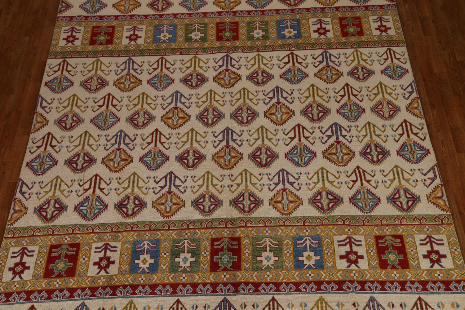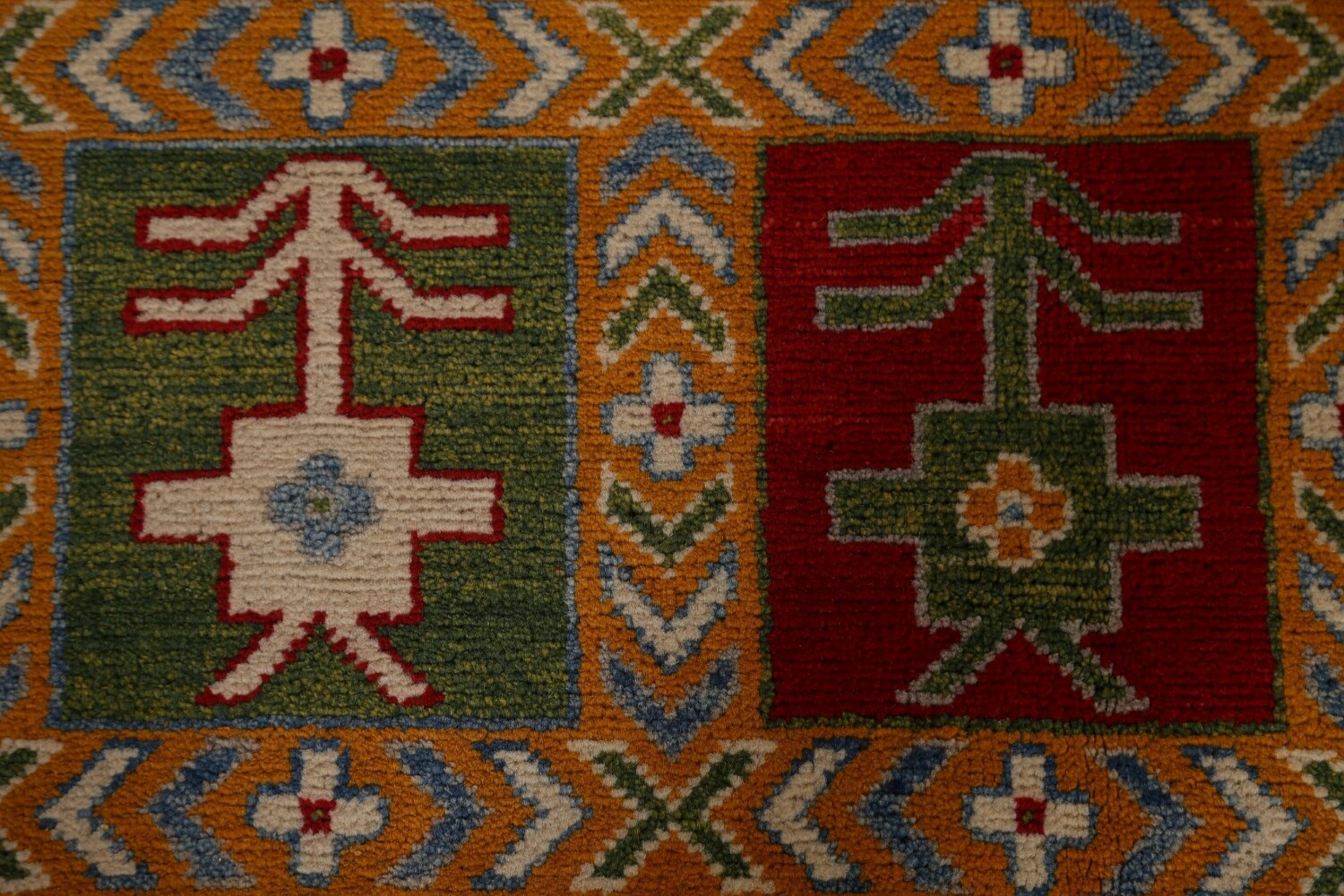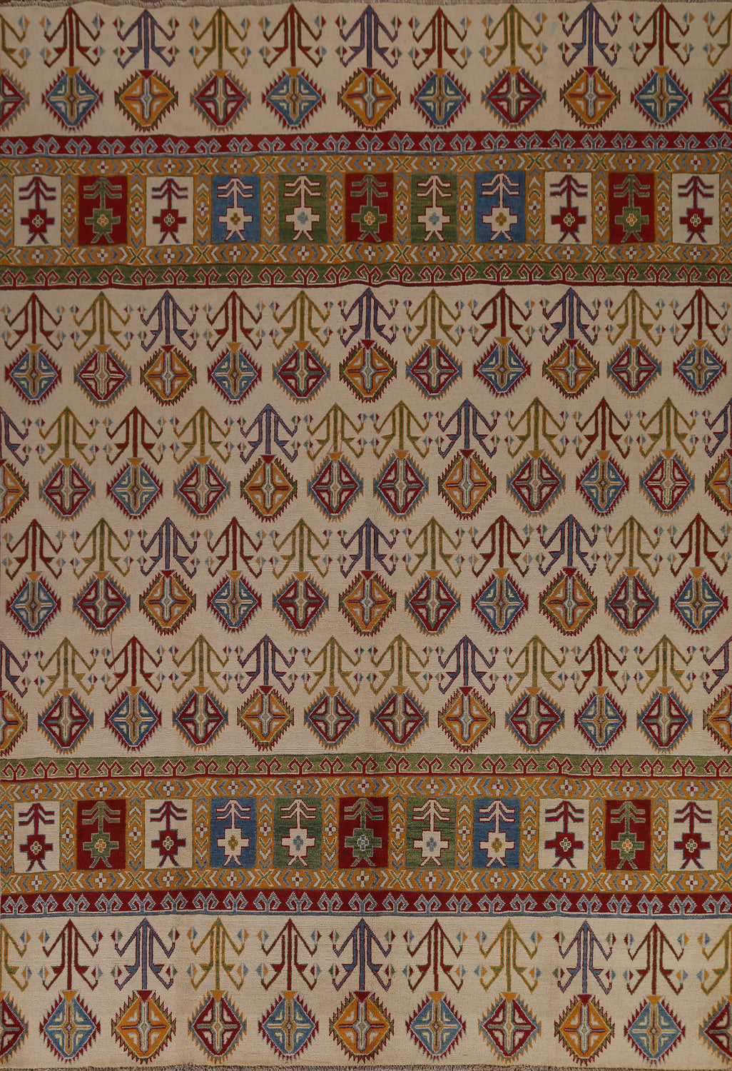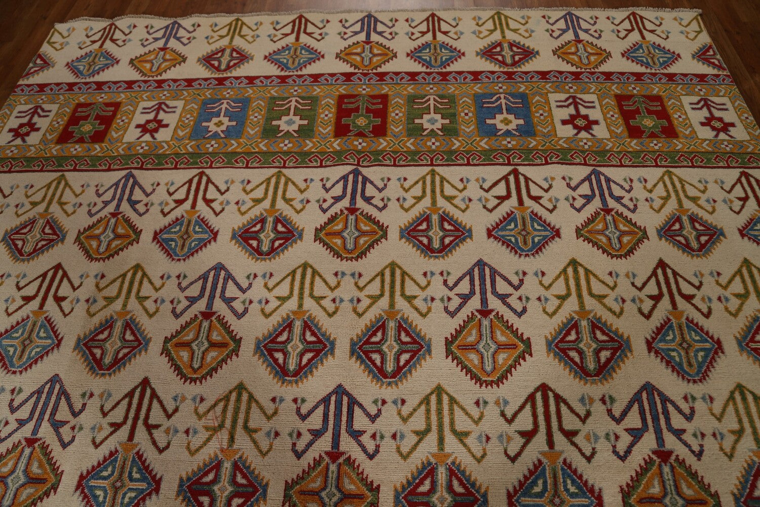 A Beautiful Genuine Pakistan Kazak rug is Hand Knotted by skillful weavers in Pakistan with 100% Wool Material. This rug is in condition. dimensions are 9' 10'' X 8' 3'' in foot and 300 X 251 in centimeter. the primary color is Beige & Ivories.