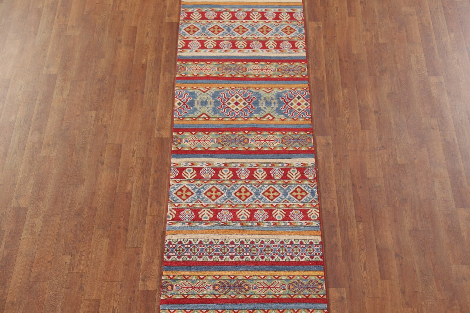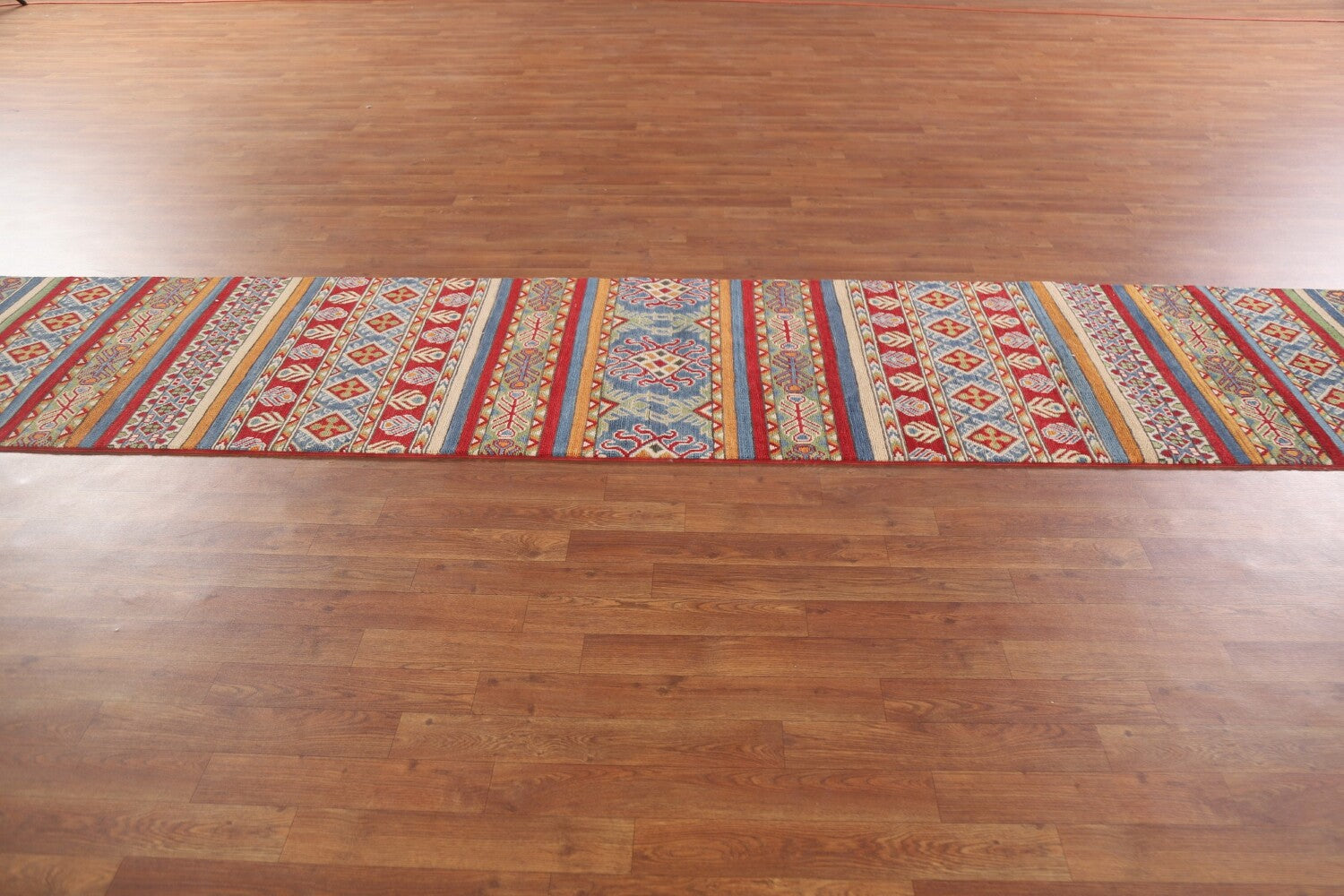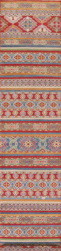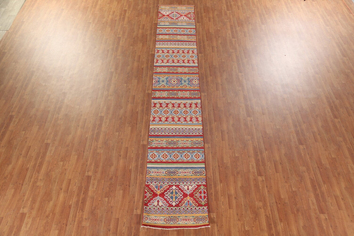 A Beautiful Genuine Pakistan Kazak rug is Hand Knotted by skillful weavers in Pakistan with 100% Wool Material. This rug is in New, First Quality condition. dimensions are 13' 11'' X 2' 6'' in foot and 424 X 76 in centimeter. the primary color is Multi-Colored.