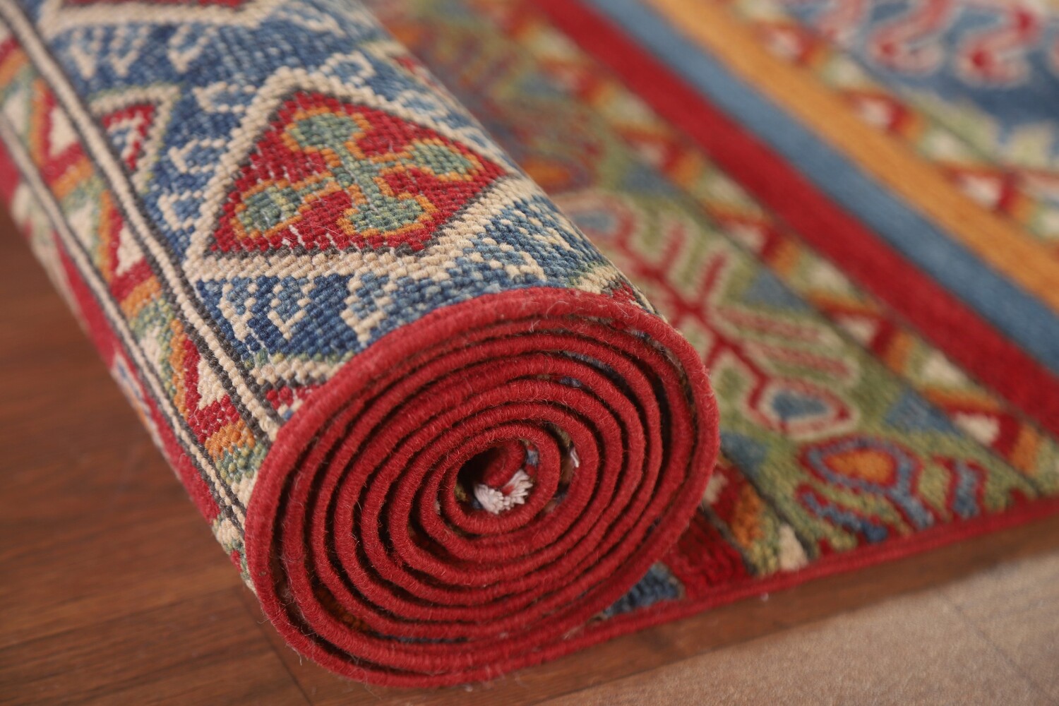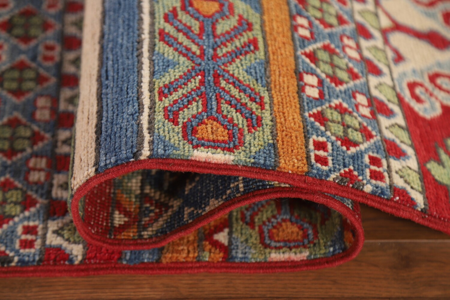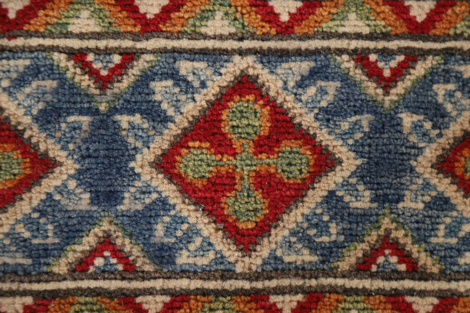 A Beautiful Genuine Pakistan Kazak rug is Hand Knotted by skillful weavers in Pakistan with 100% Wool Material. This rug is in New, First Quality condition. dimensions are 13' 11'' X 2' 6'' in foot and 424 X 76 in centimeter. the primary color is Multi-Colored.