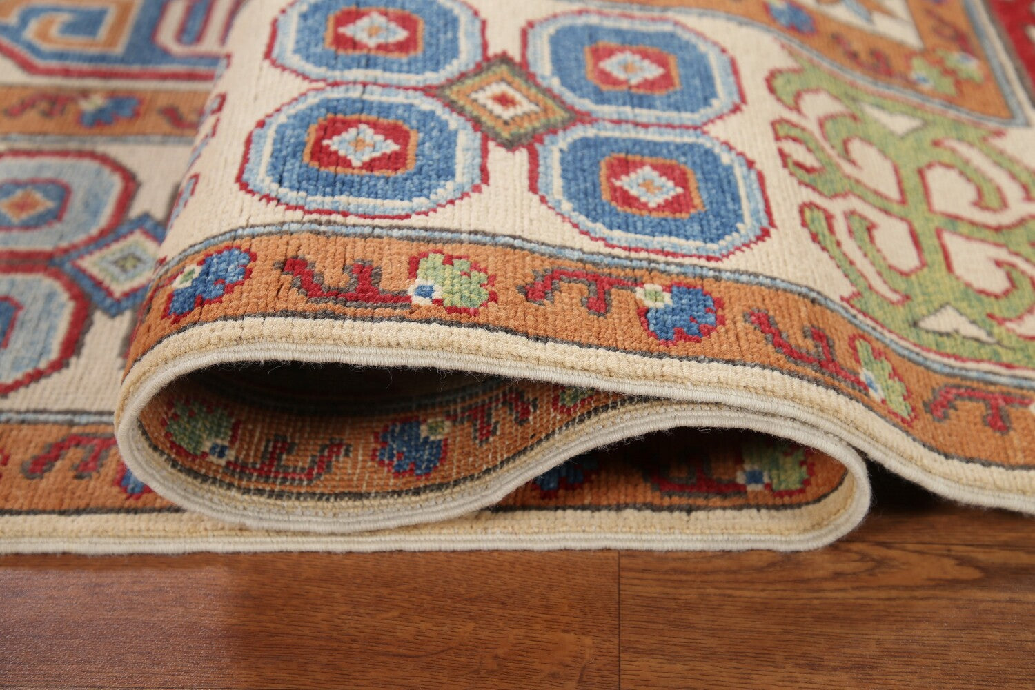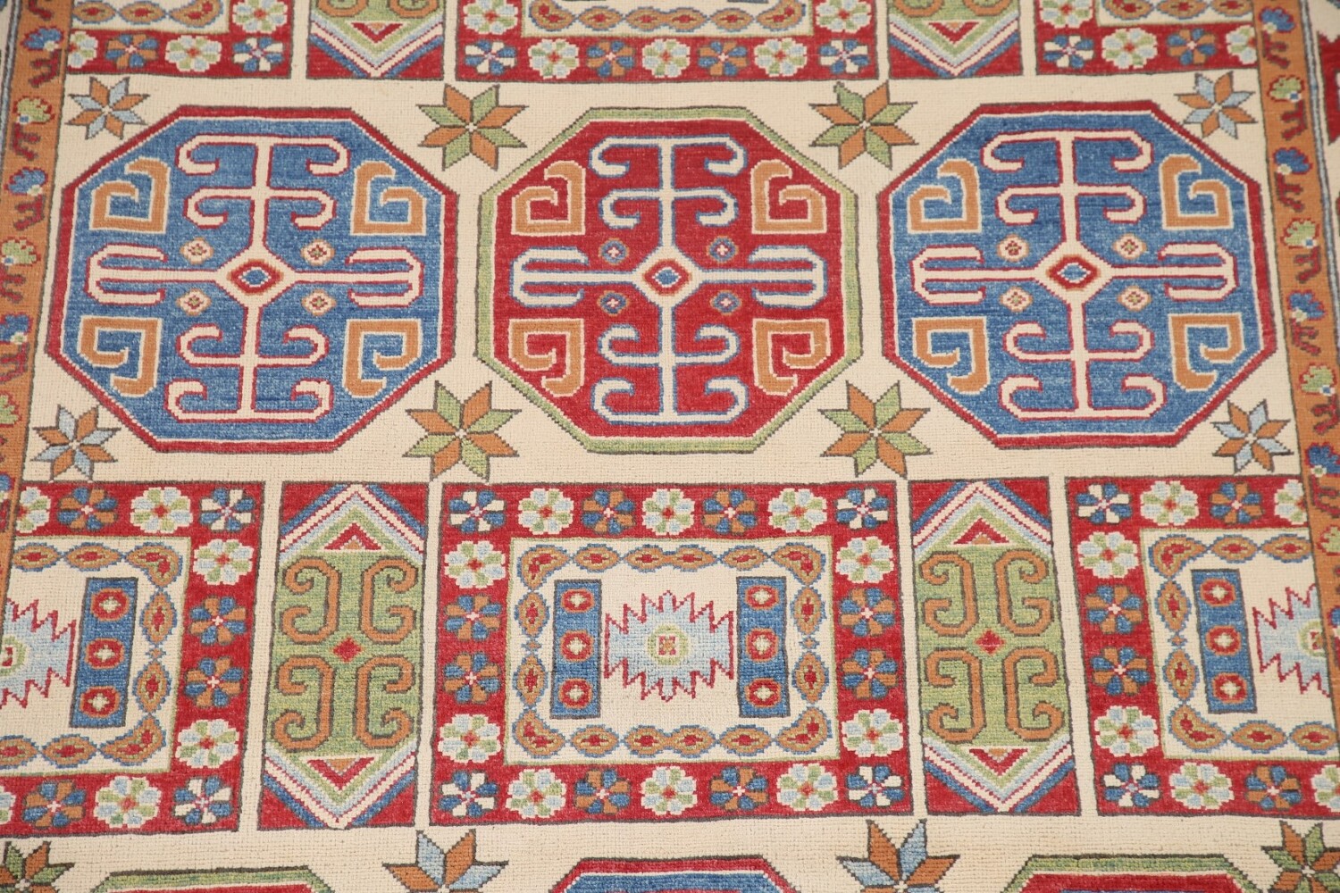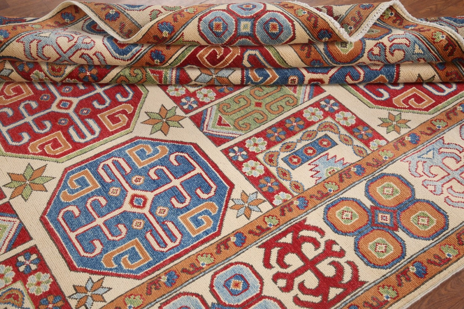 A Beautiful Genuine Pakistan Kazak rug is Hand Knotted by skillful weavers in Pakistan with 100% Wool Material. This rug is in New, First Quality condition. dimensions are 9' 11'' X 6' 8'' in foot and 302 X 203 in centimeter. the primary color is Beige & Ivories.
