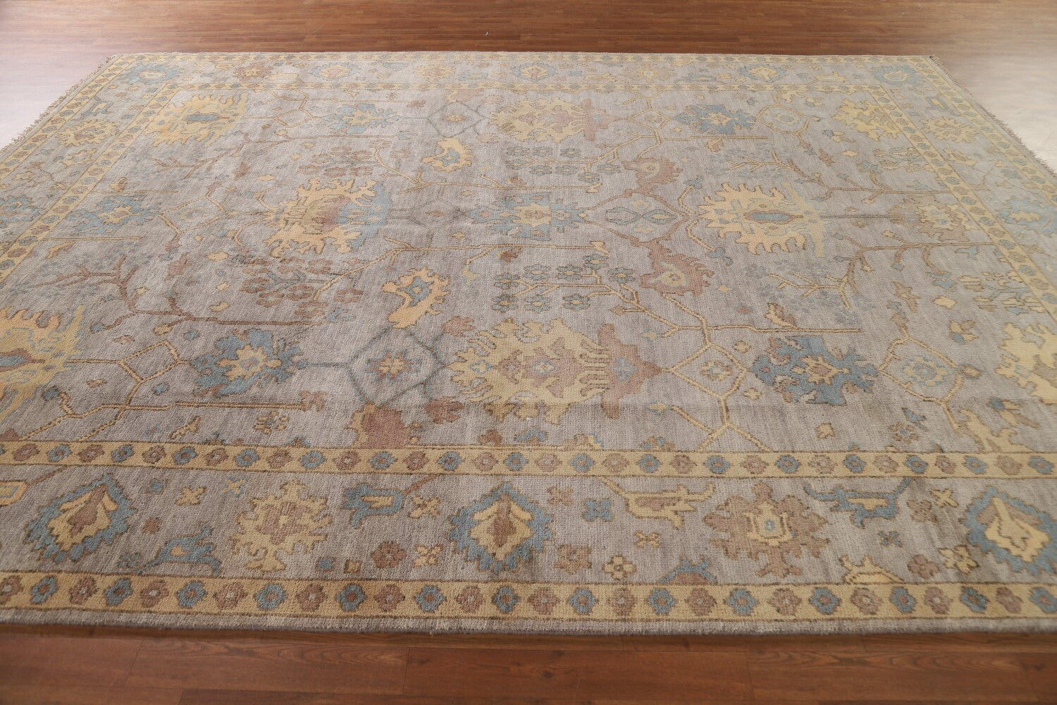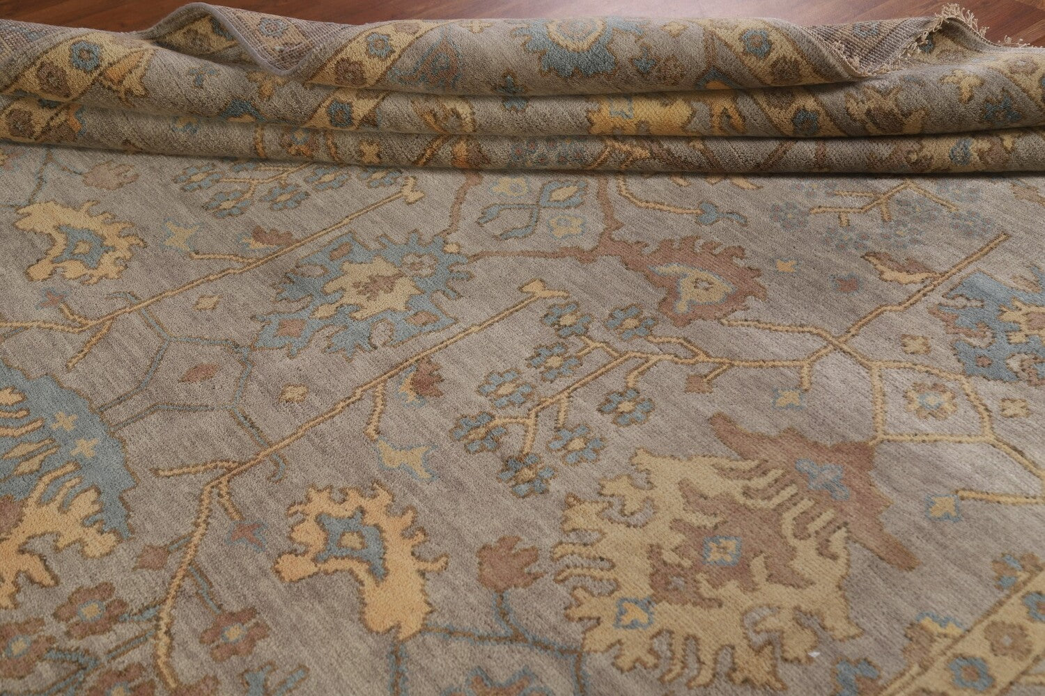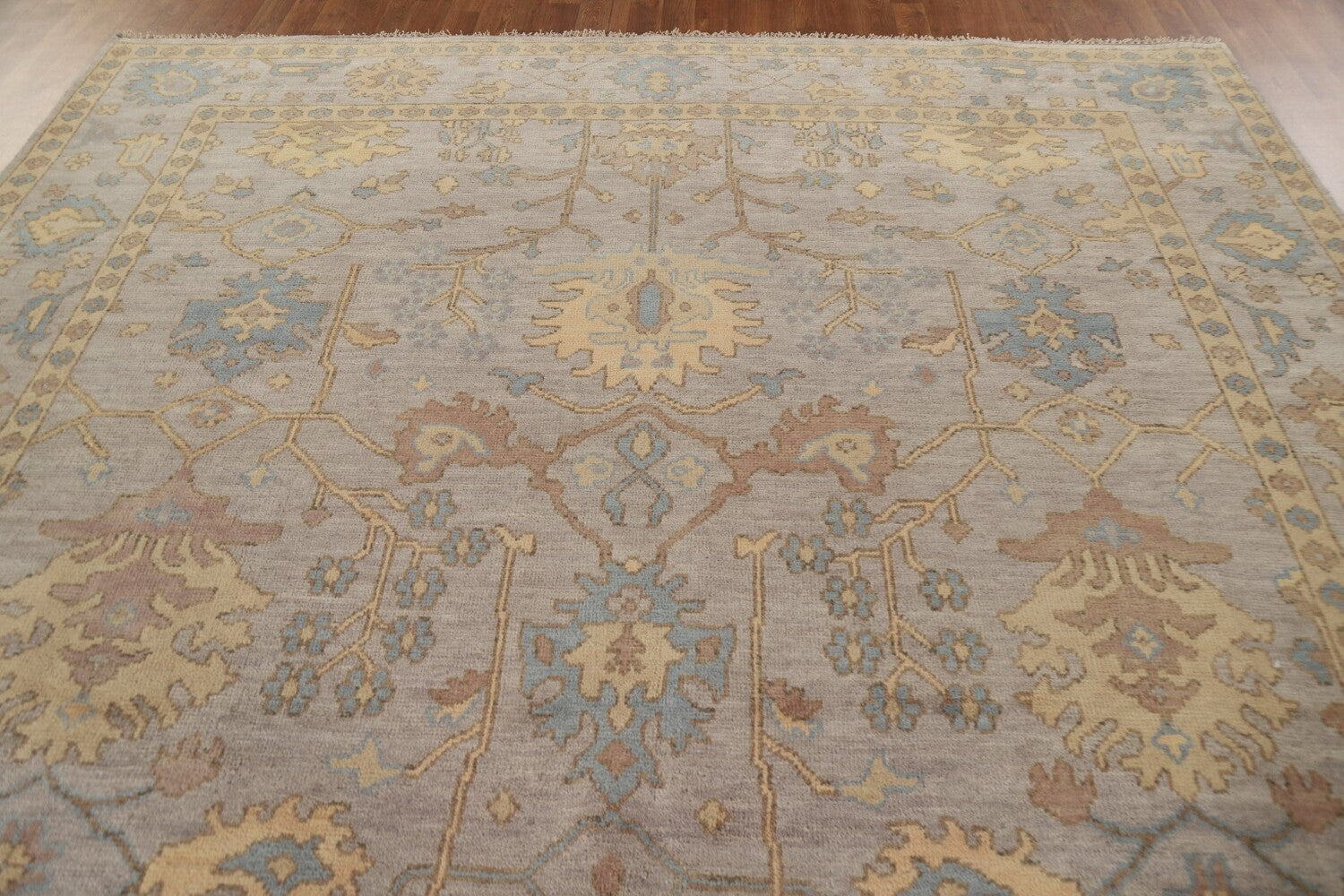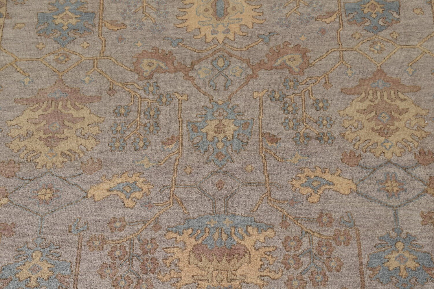 A Beautiful Genuine India Oushak rug is Hand Knotted by skillful weavers in India with 100% Wool Material. This rug is in New, First Quality condition. dimensions are 11' 8'' X 9' 0'' in foot and 356 X 274 in centimeter. the primary color is Greys & Charcoal.