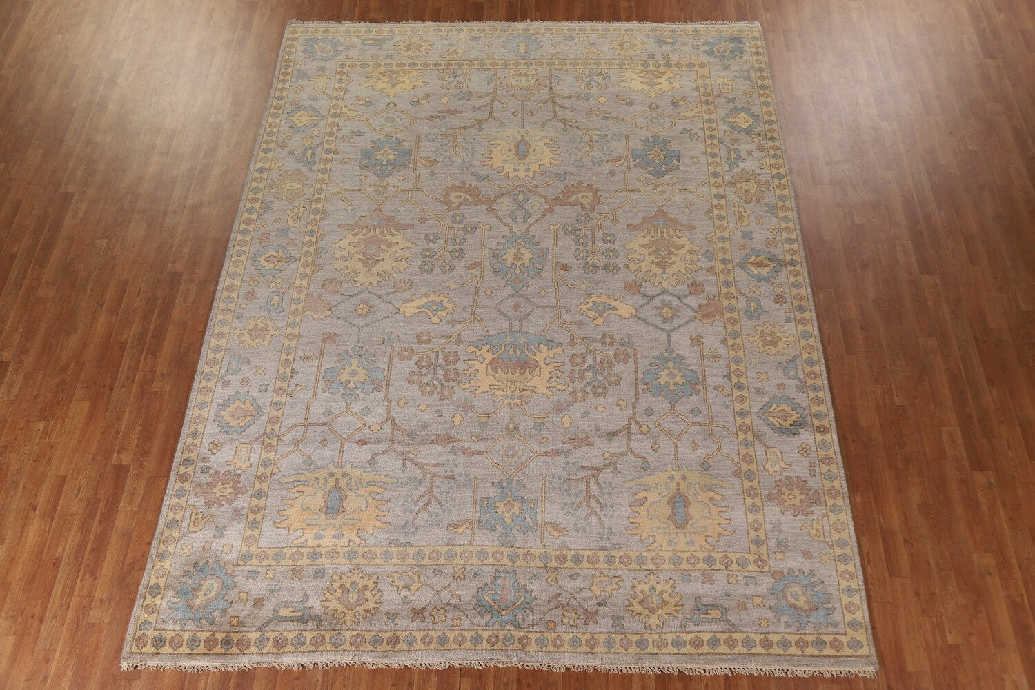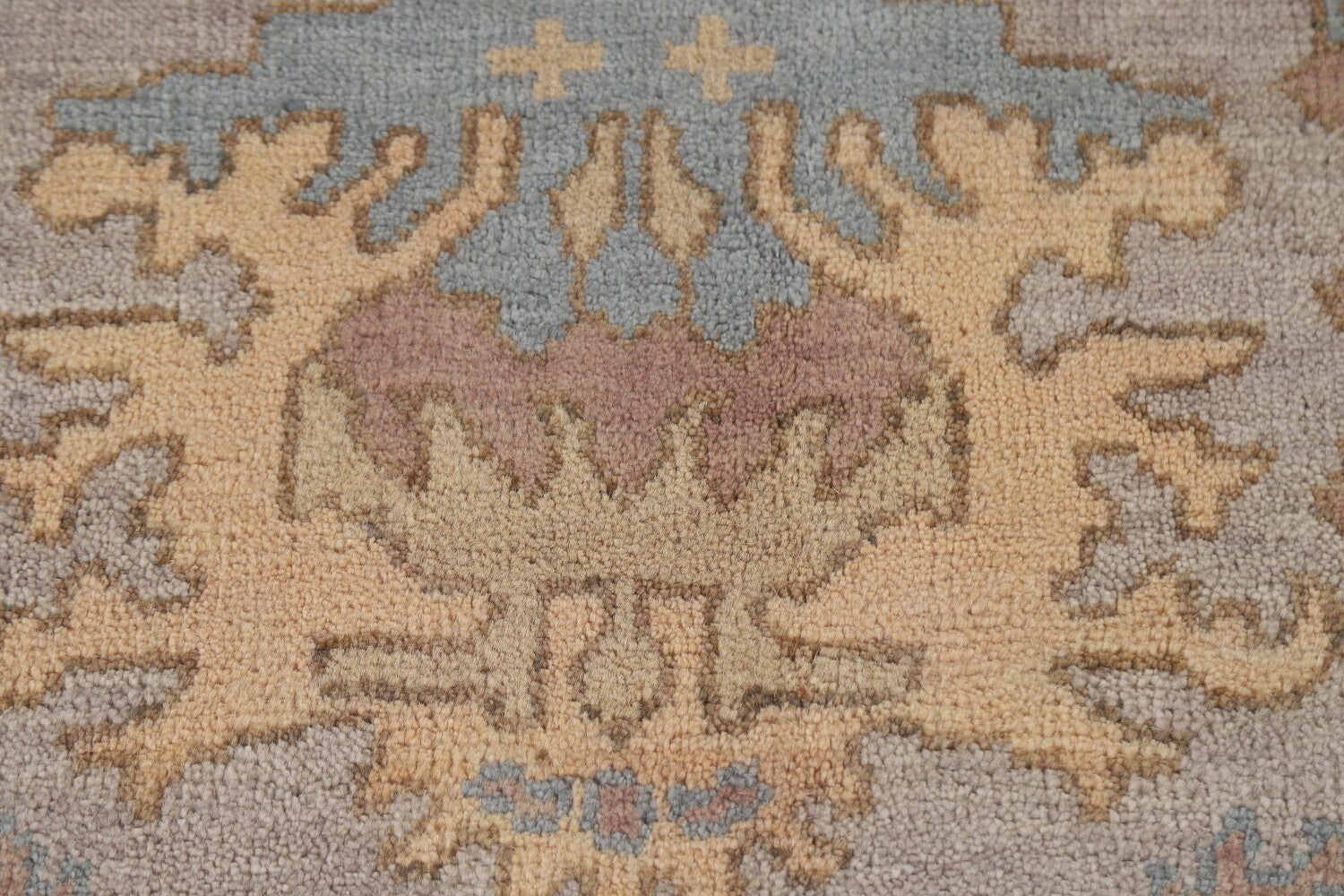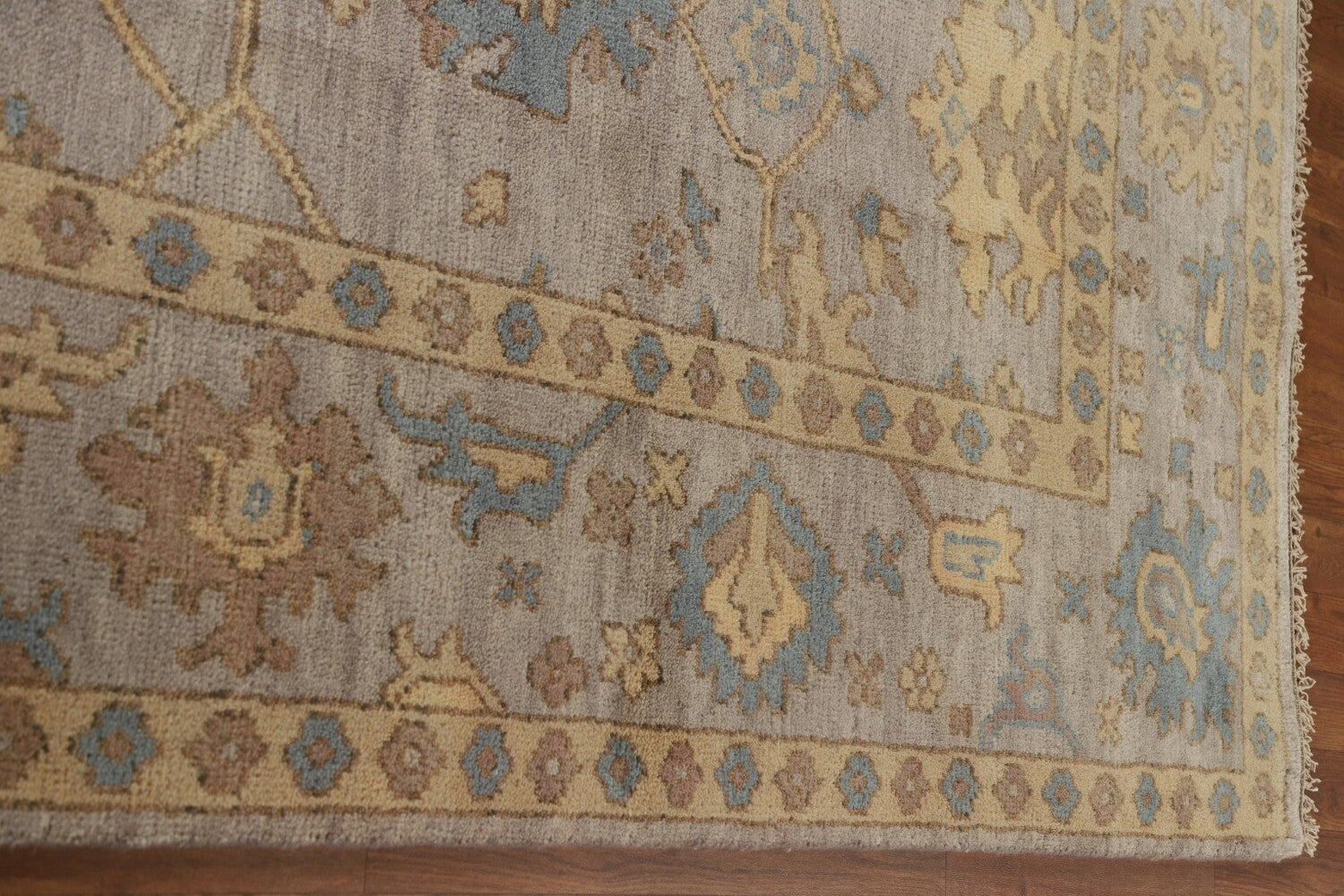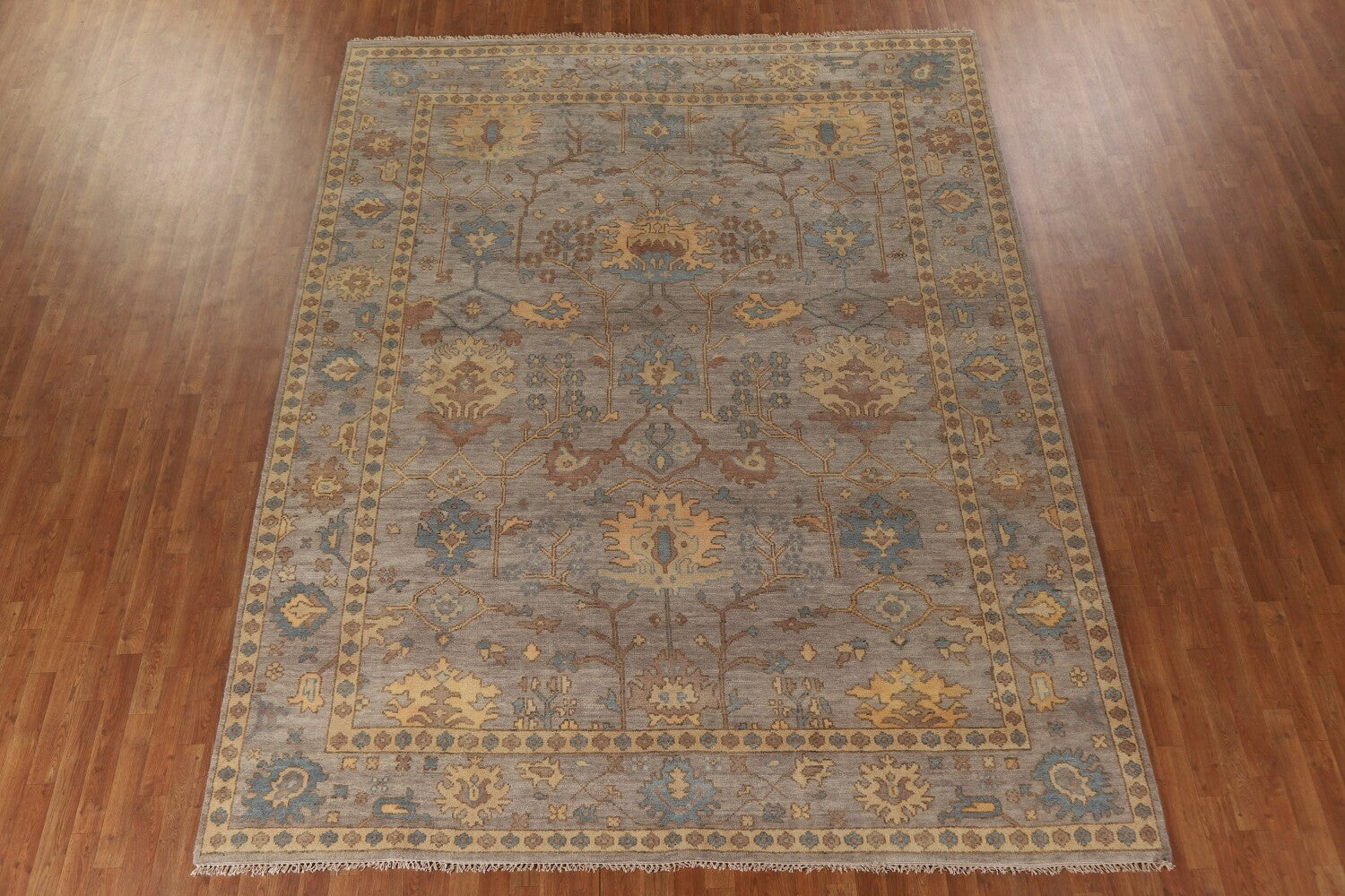 A Beautiful Genuine India Oushak rug is Hand Knotted by skillful weavers in India with 100% Wool Material. This rug is in New, First Quality condition. dimensions are 11' 8'' X 9' 0'' in foot and 356 X 274 in centimeter. the primary color is Greys & Charcoal.