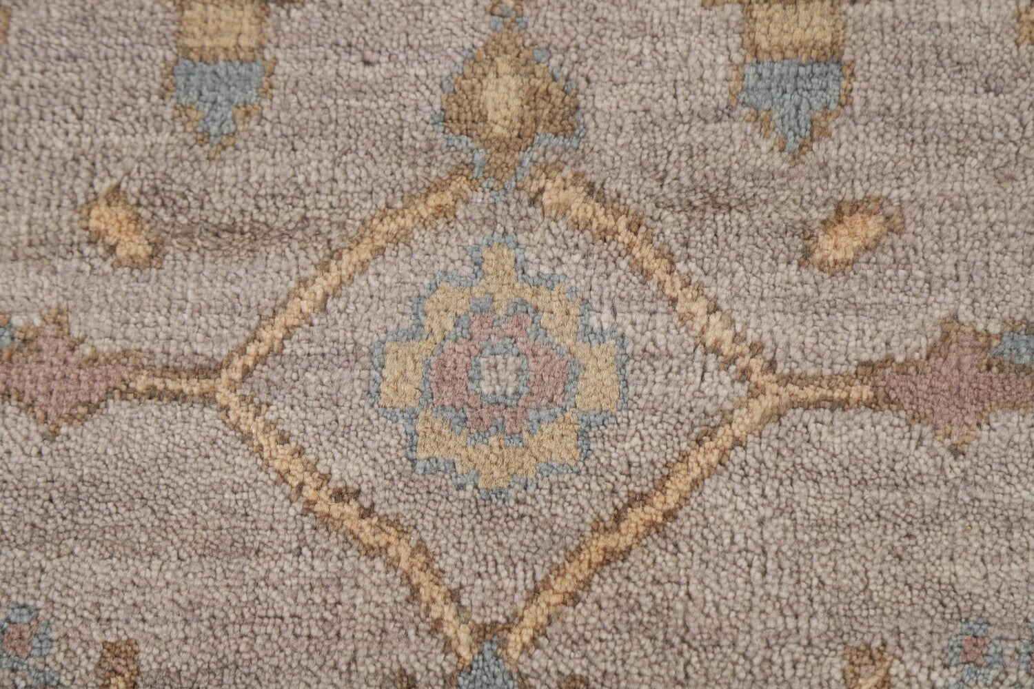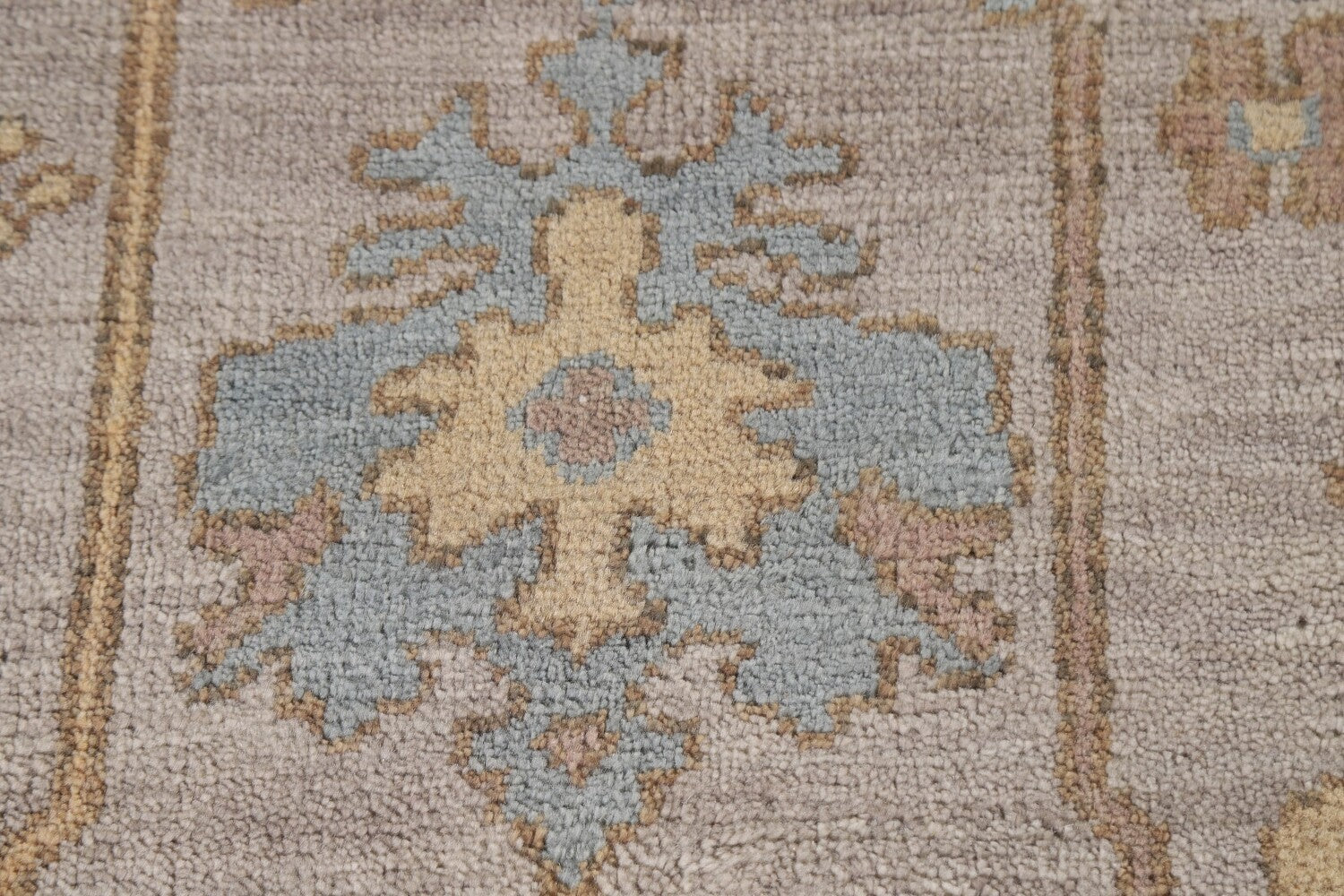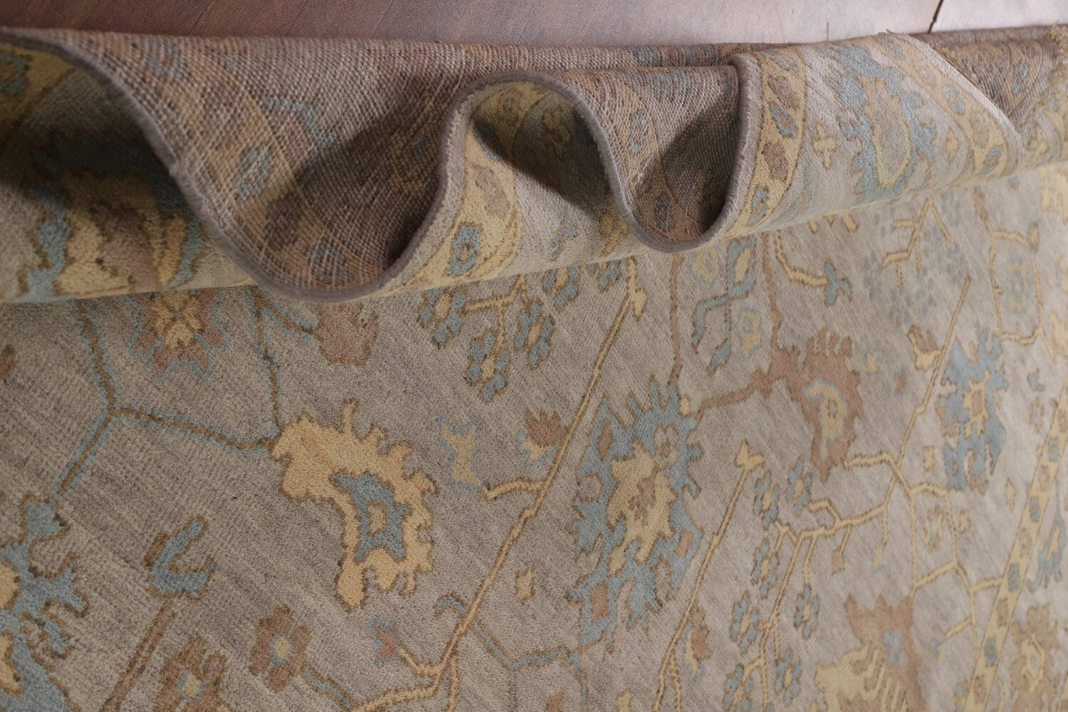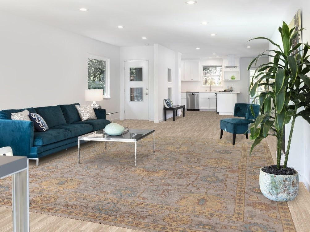 A Beautiful Genuine India Oushak rug is Hand Knotted by skillful weavers in India with 100% Wool Material. This rug is in New, First Quality condition. dimensions are 11' 8'' X 9' 0'' in foot and 356 X 274 in centimeter. the primary color is Greys & Charcoal.