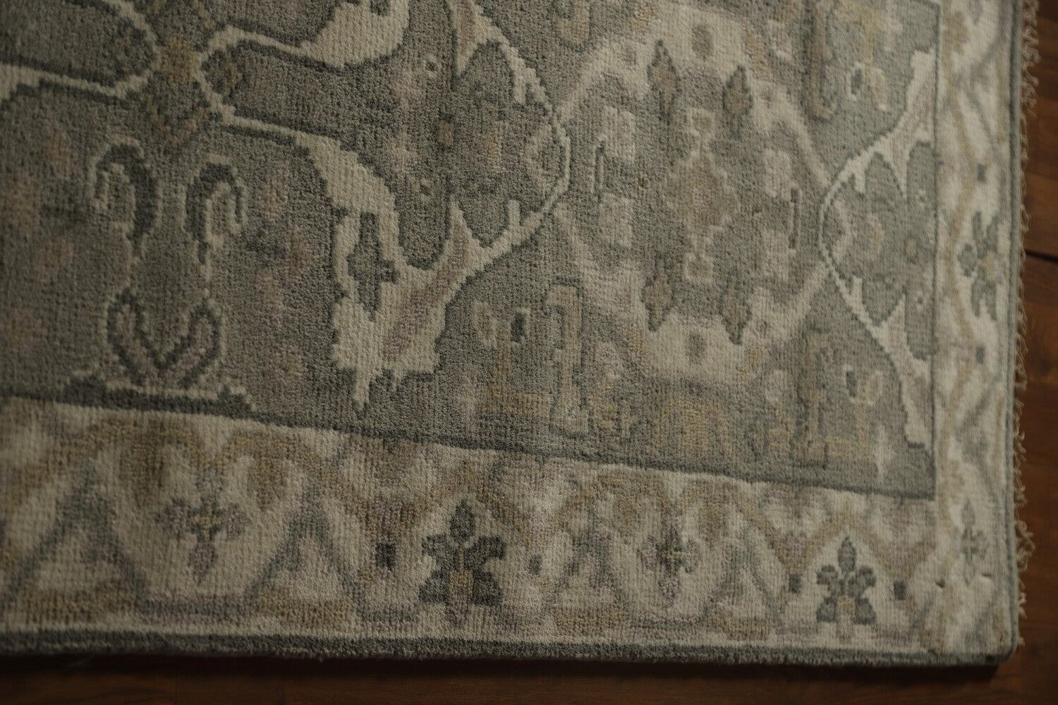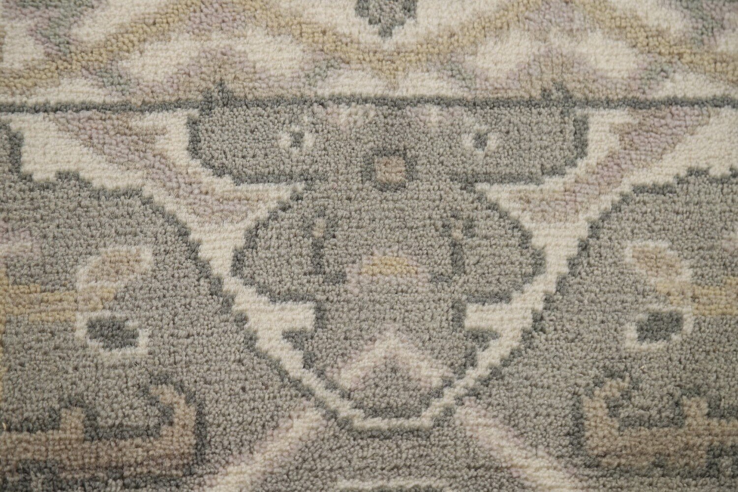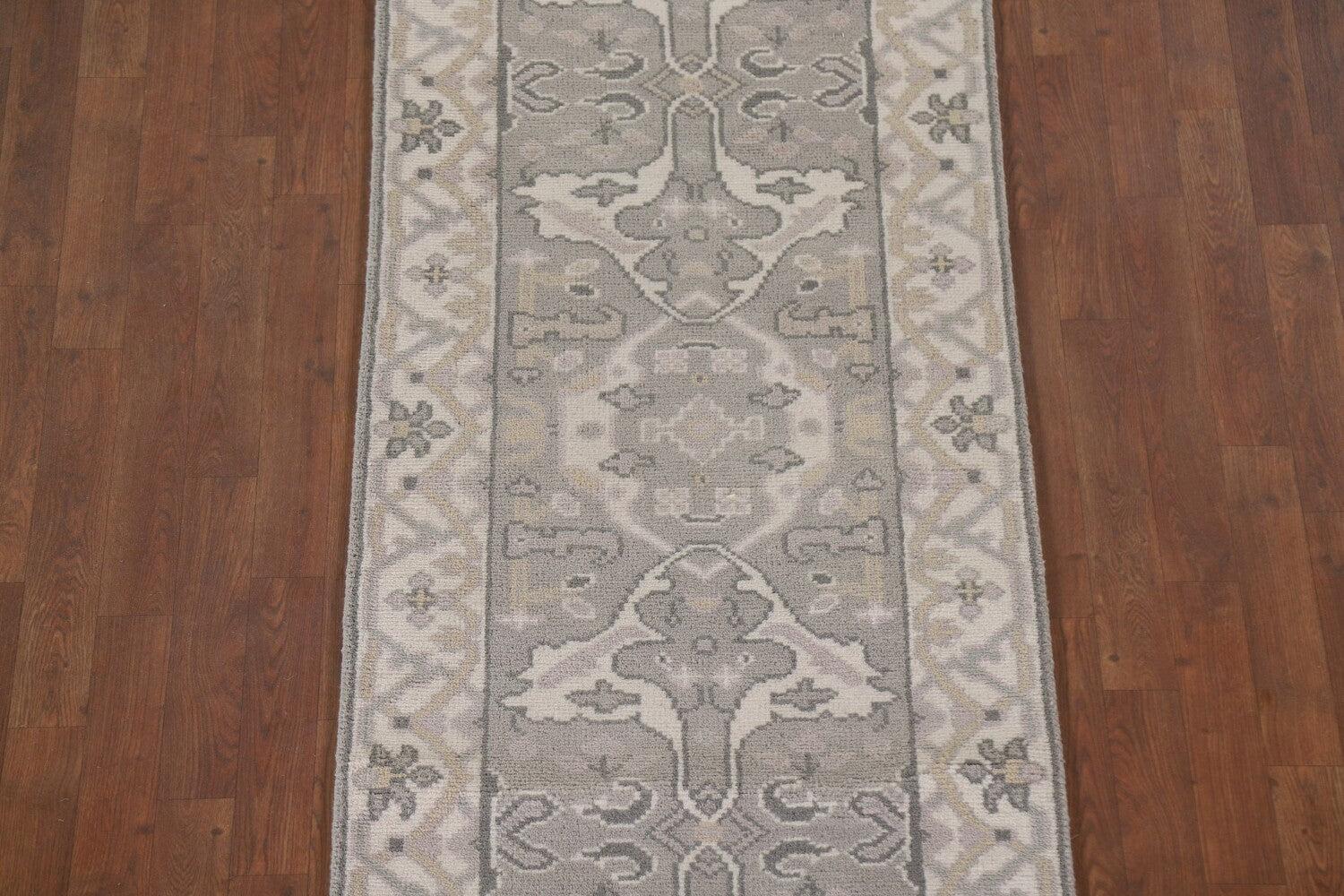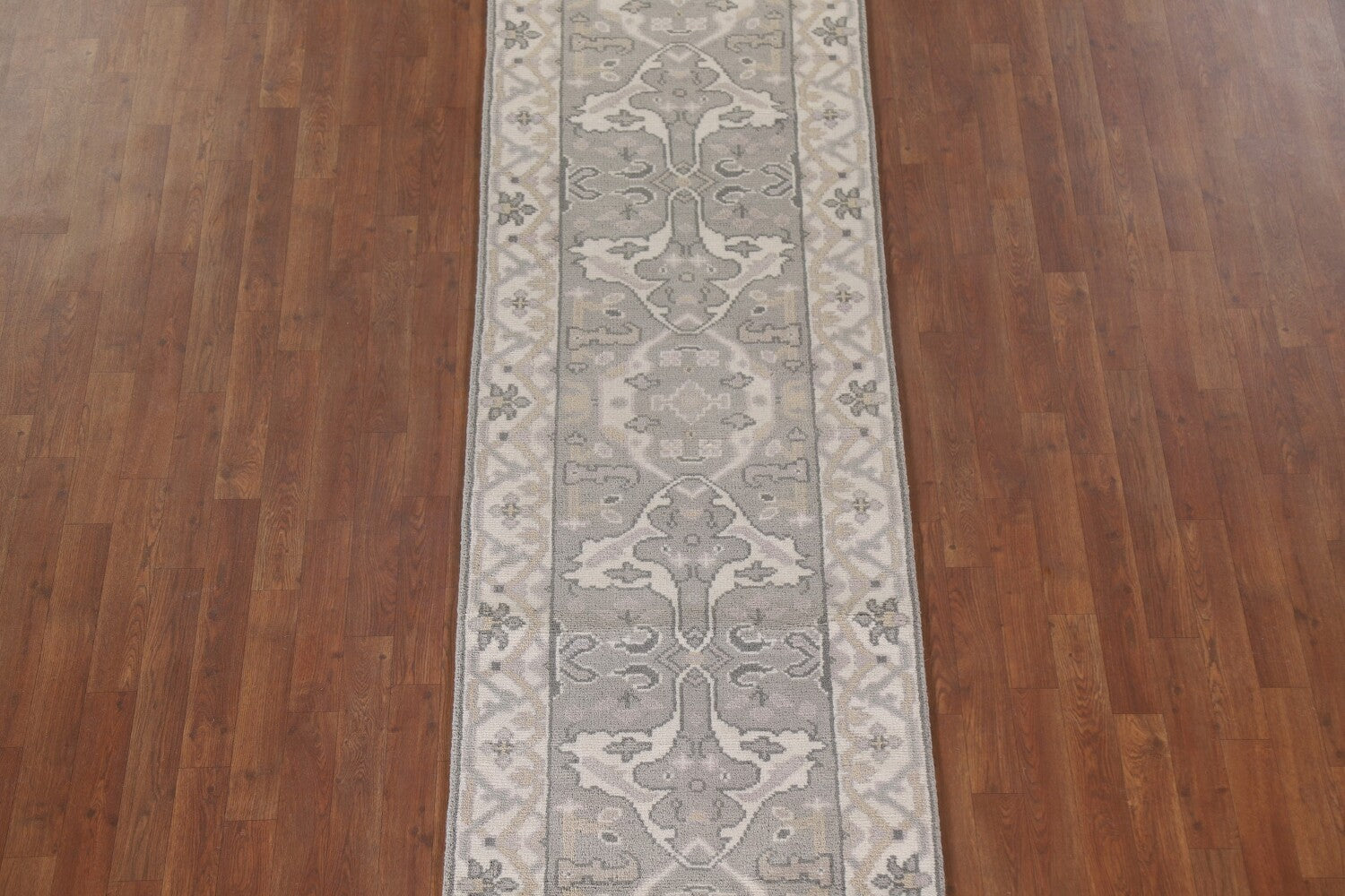A Beautiful Genuine India Oushak rug is Hand Knotted by skillful weavers in India with 100% Wool Material. This rug is in New, First Quality condition. dimensions are 15' 8'' X 2' 8'' in foot and 478 X 81 in centimeter. the primary color is Greys & Charcoal.