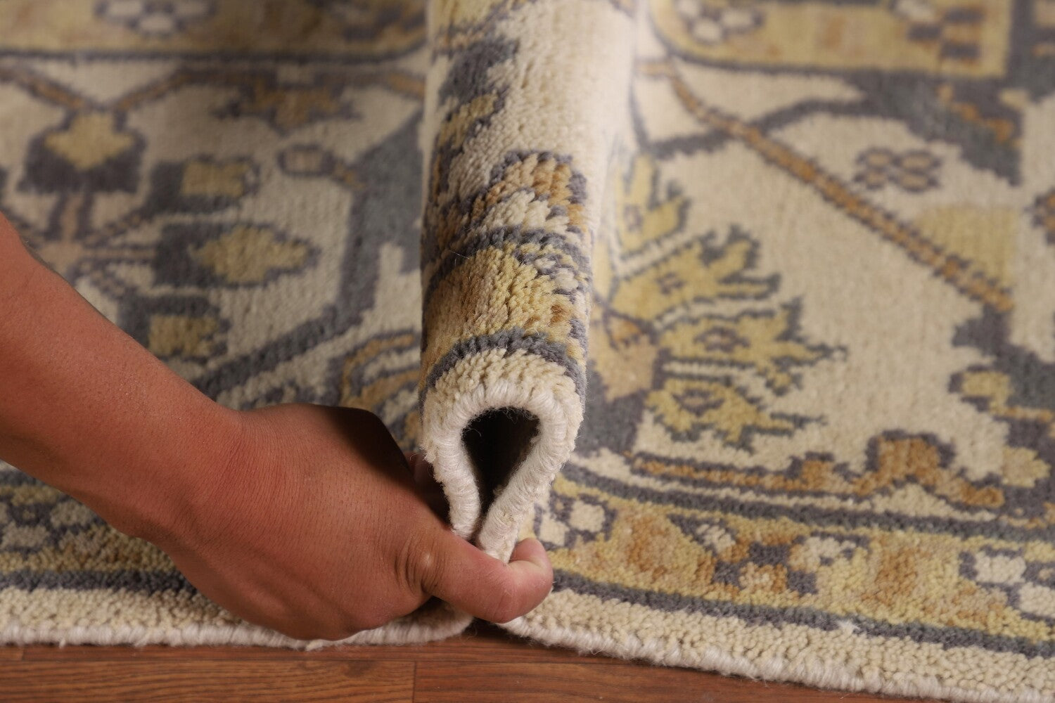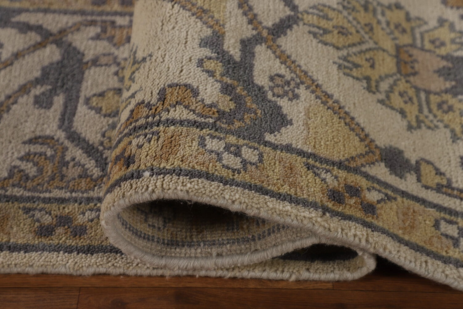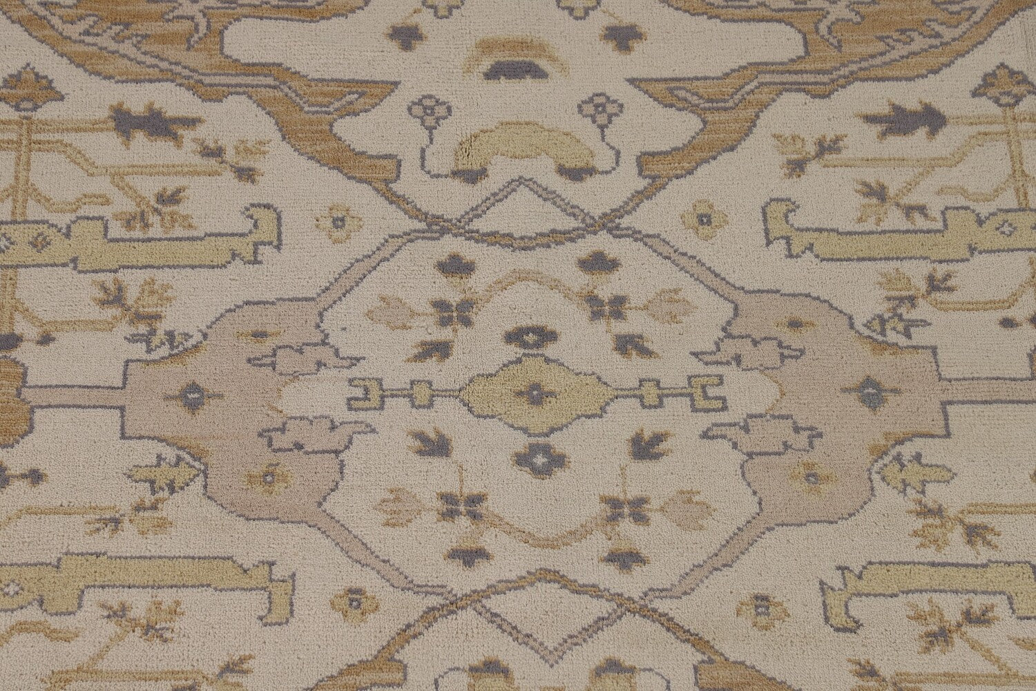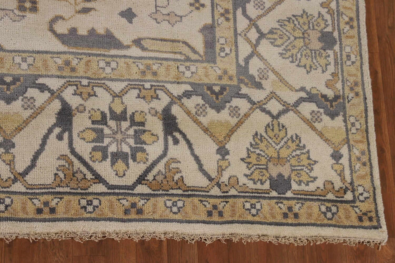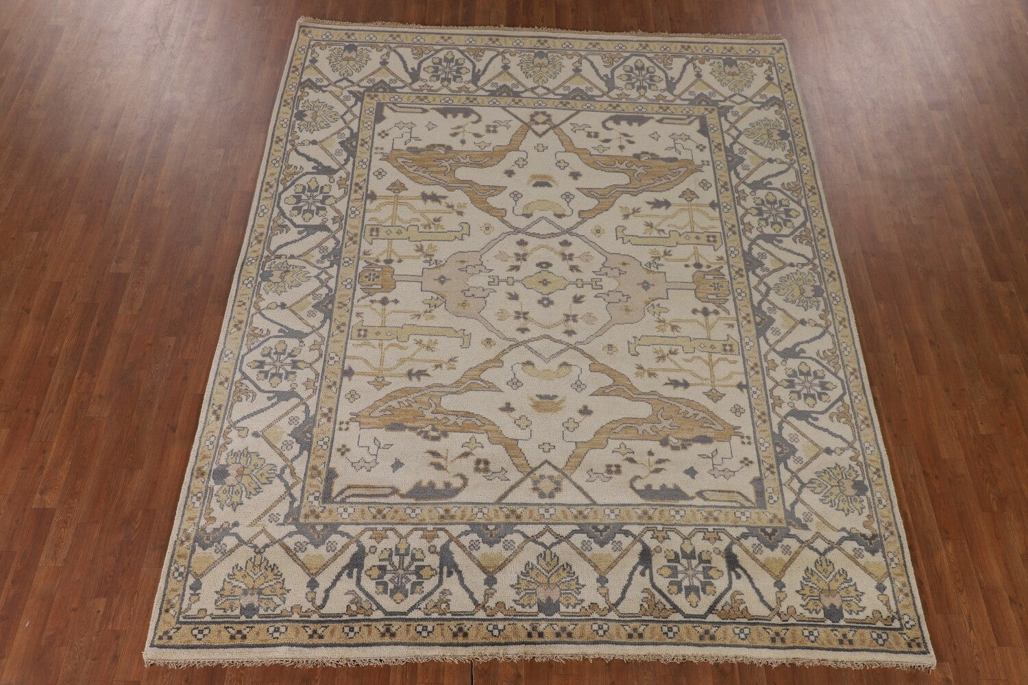 A Beautiful Genuine India Oushak rug is Hand Knotted by skillful weavers in India with 100% Wool Material. This rug is in New, First Quality condition. dimensions are 9' 10'' X 8' 1'' in foot and 300 X 246 in centimeter. the primary color is Beige & Ivories.