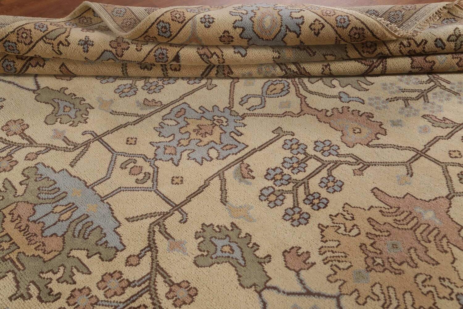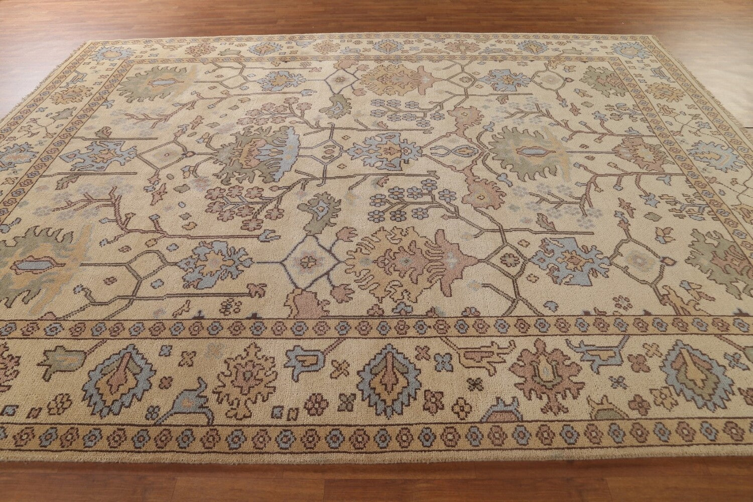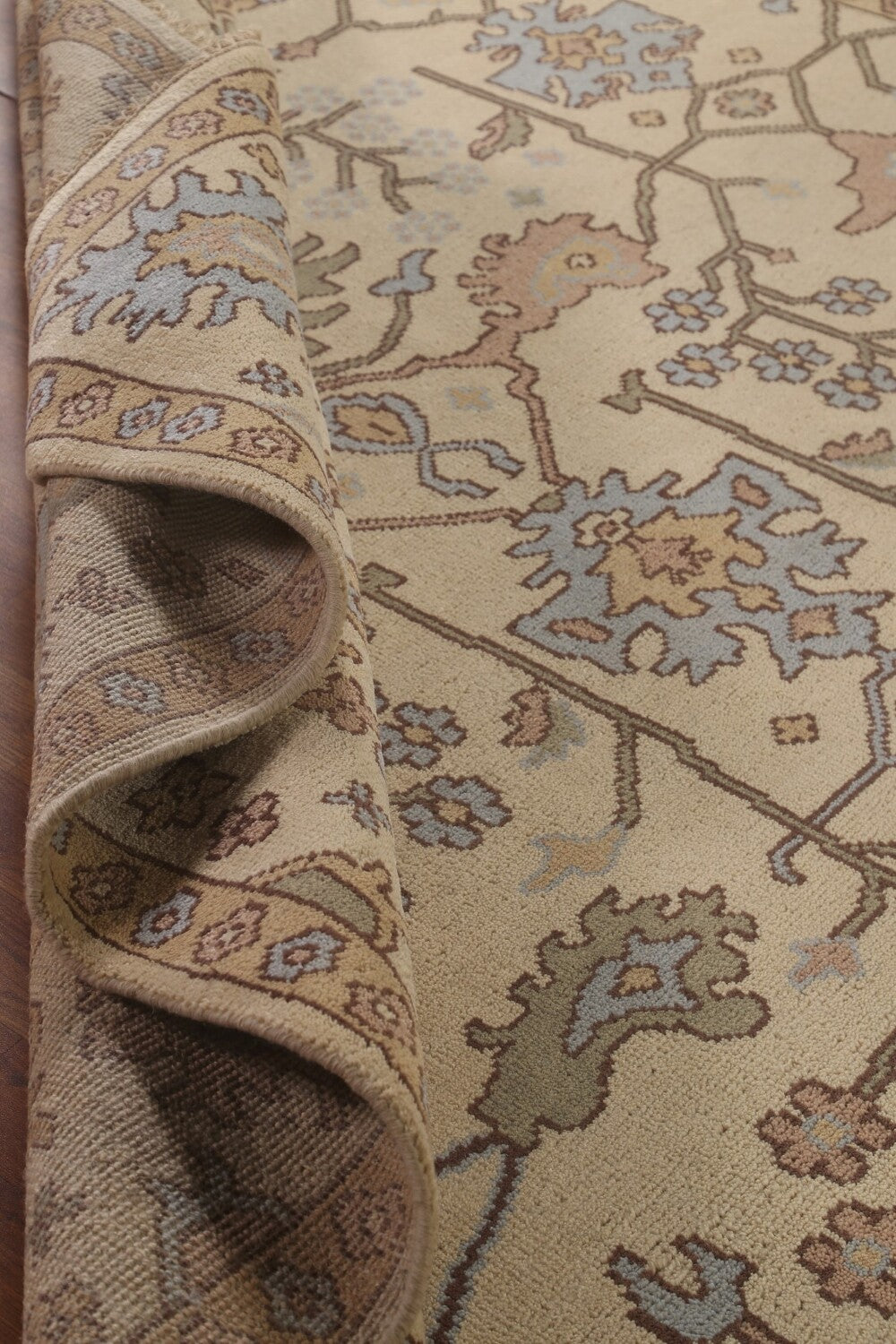 A Beautiful Genuine India Oushak rug is Hand Knotted by skillful weavers in India with 100% Wool Material. This rug is in New, First Quality condition. dimensions are 11' 6'' X 9' 1'' in foot and 351 X 277 in centimeter. the primary color is Beige & Ivories.