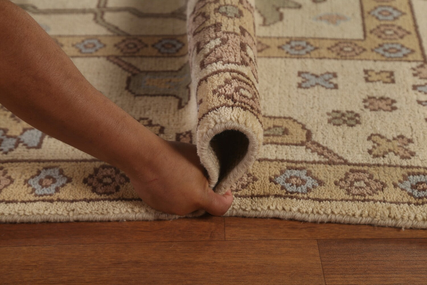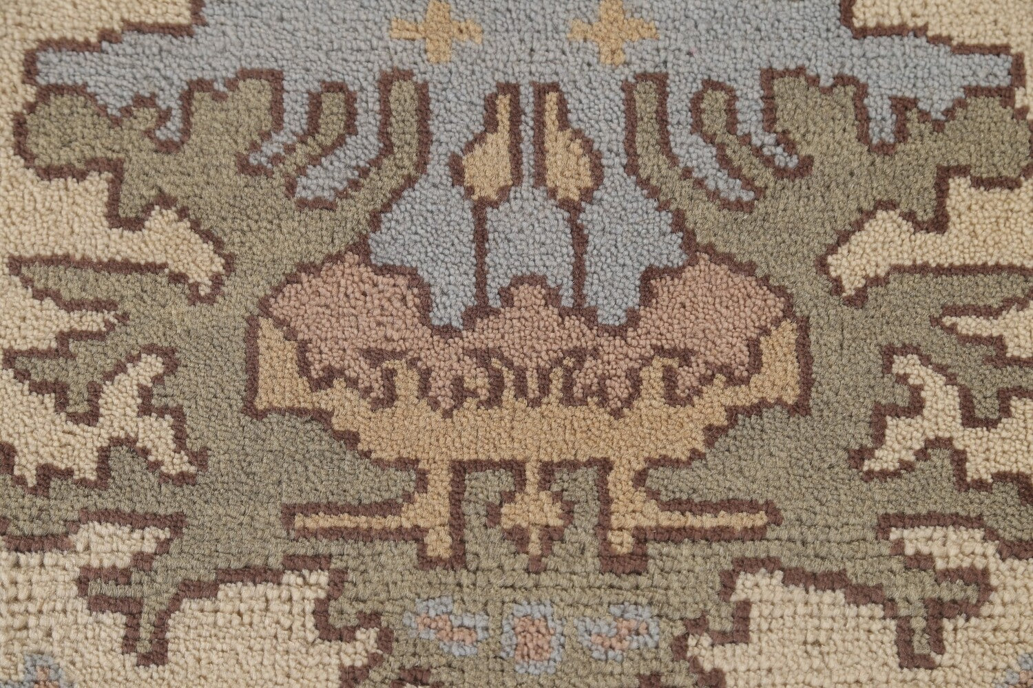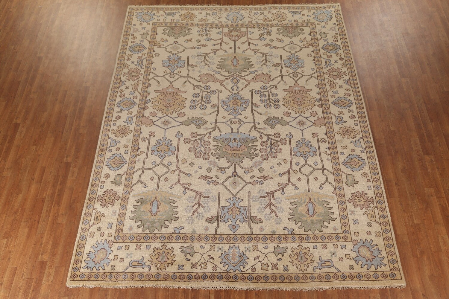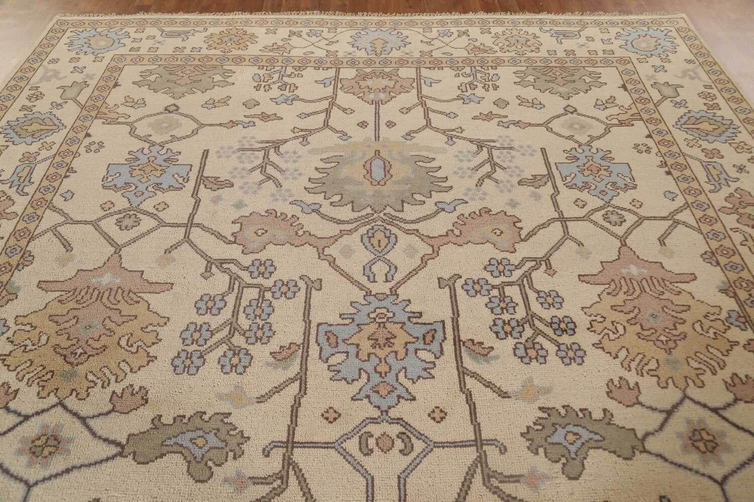 A Beautiful Genuine India Oushak rug is Hand Knotted by skillful weavers in India with 100% Wool Material. This rug is in New, First Quality condition. dimensions are 11' 6'' X 9' 1'' in foot and 351 X 277 in centimeter. the primary color is Beige & Ivories.