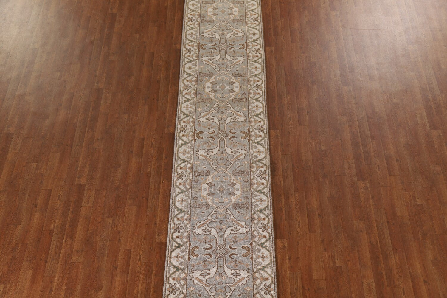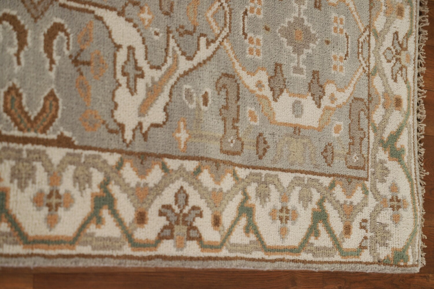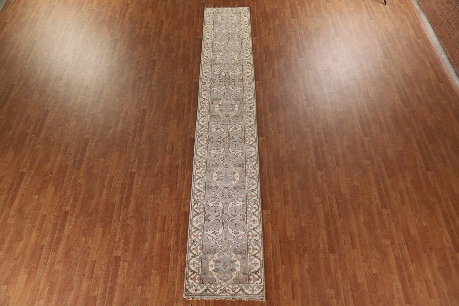 A Beautiful Genuine India Oushak rug is Hand Knotted by skillful weavers in India with 100% Wool Material. This rug is in New, First Quality condition. dimensions are 15' 6'' X 2' 7'' in foot and 472 X 79 in centimeter. the primary color is Greys & Charcoal.