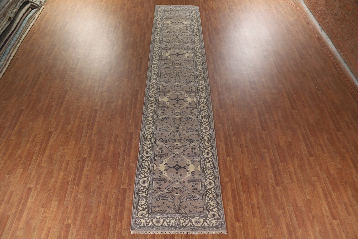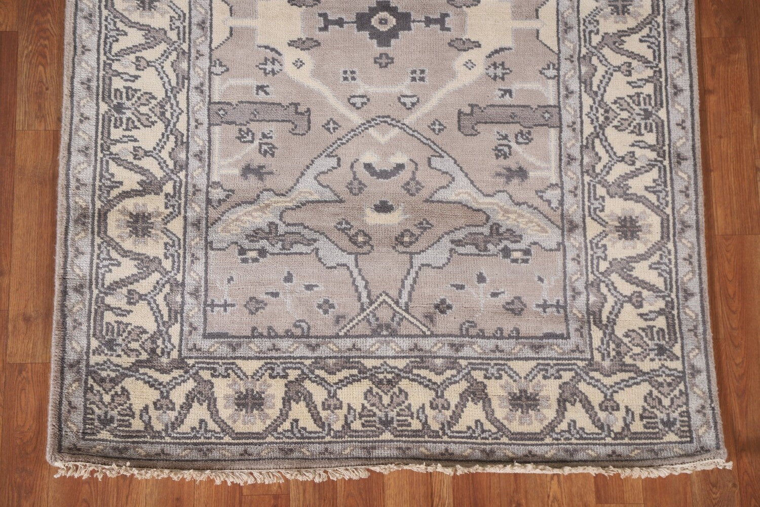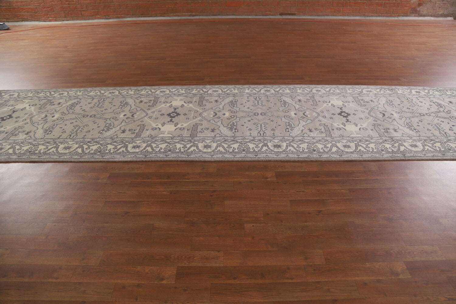 A Beautiful Genuine India Oushak rug is Hand Knotted by skillful weavers in India with 100% Wool Material. This rug is in New, First Quality condition. dimensions are 19' 5'' X 3' 11'' in foot and 592 X 119 in centimeter. the primary color is Beige & Ivories.