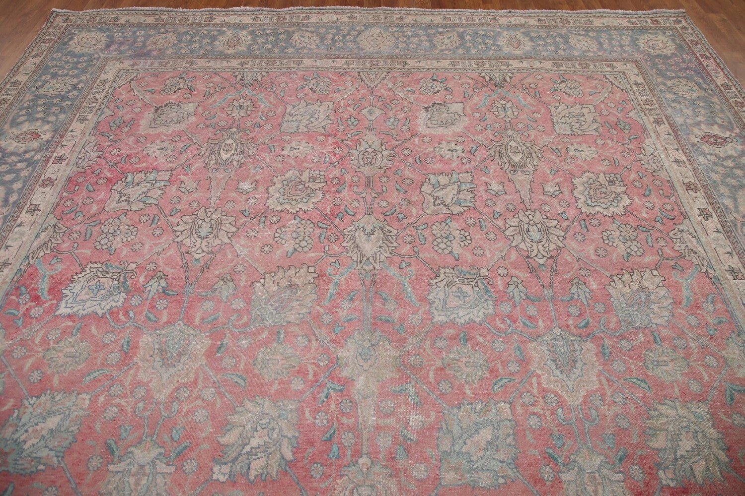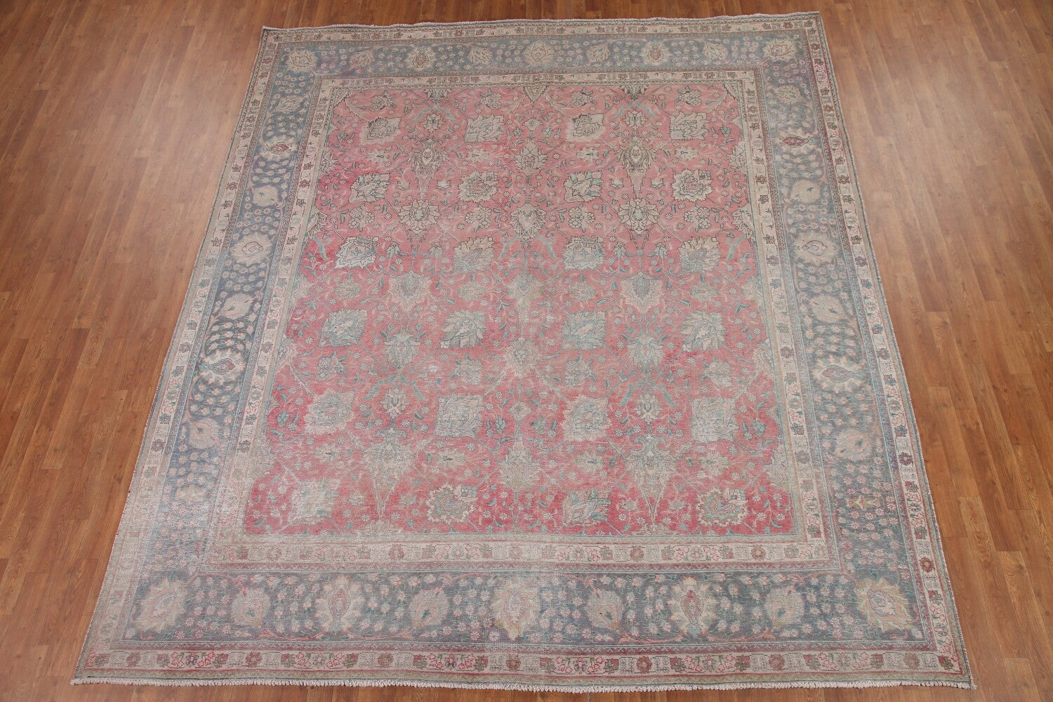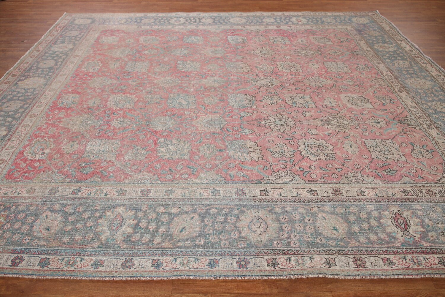 A Beautiful Genuine Persia ( Persia ) Tabriz rug is Hand Knotted by skillful weavers in Persia ( Persia ) with 100% Wool Material. This rug is in Very Good (Evenly Low Pile-Repair) condition. dimensions are 10' 10'' X 9' 9'' in foot and 330 X 297 in centimeter. the primary color is Pink.