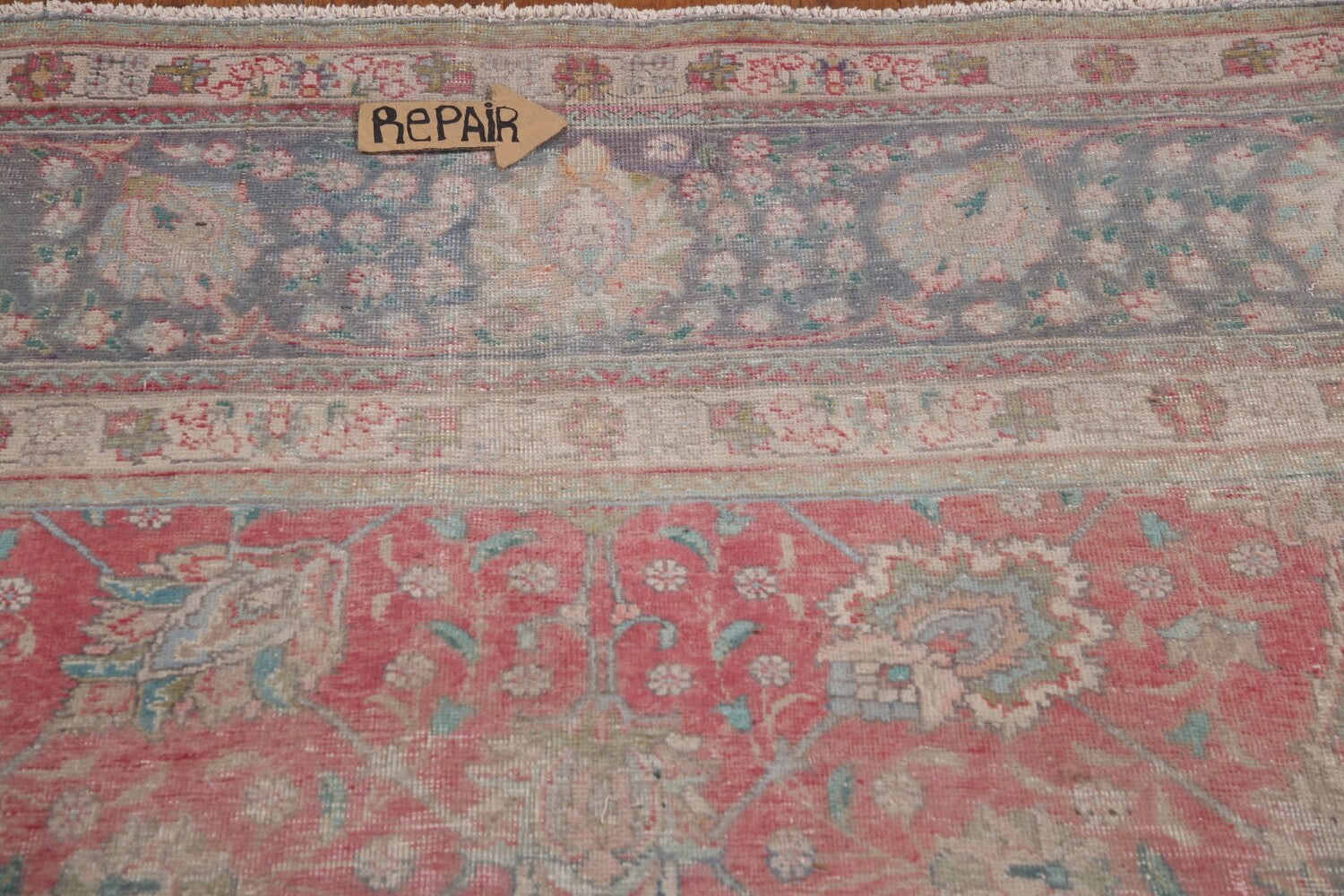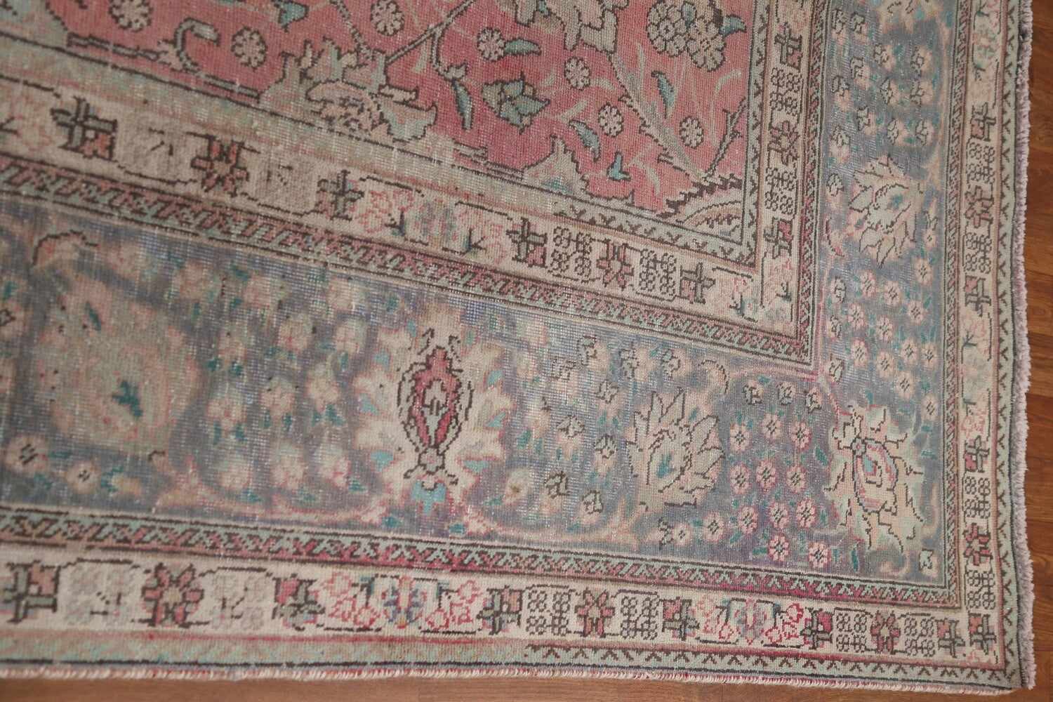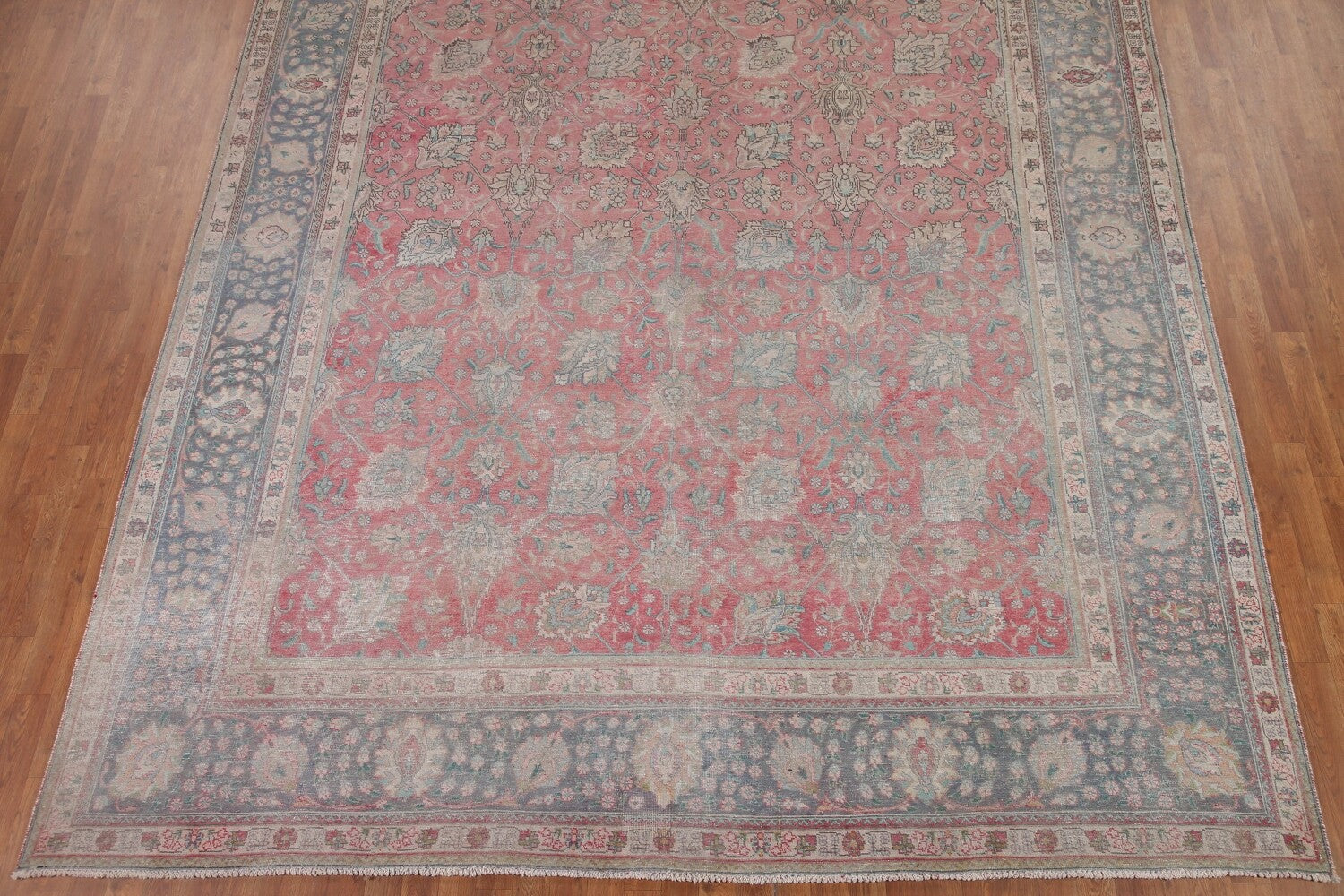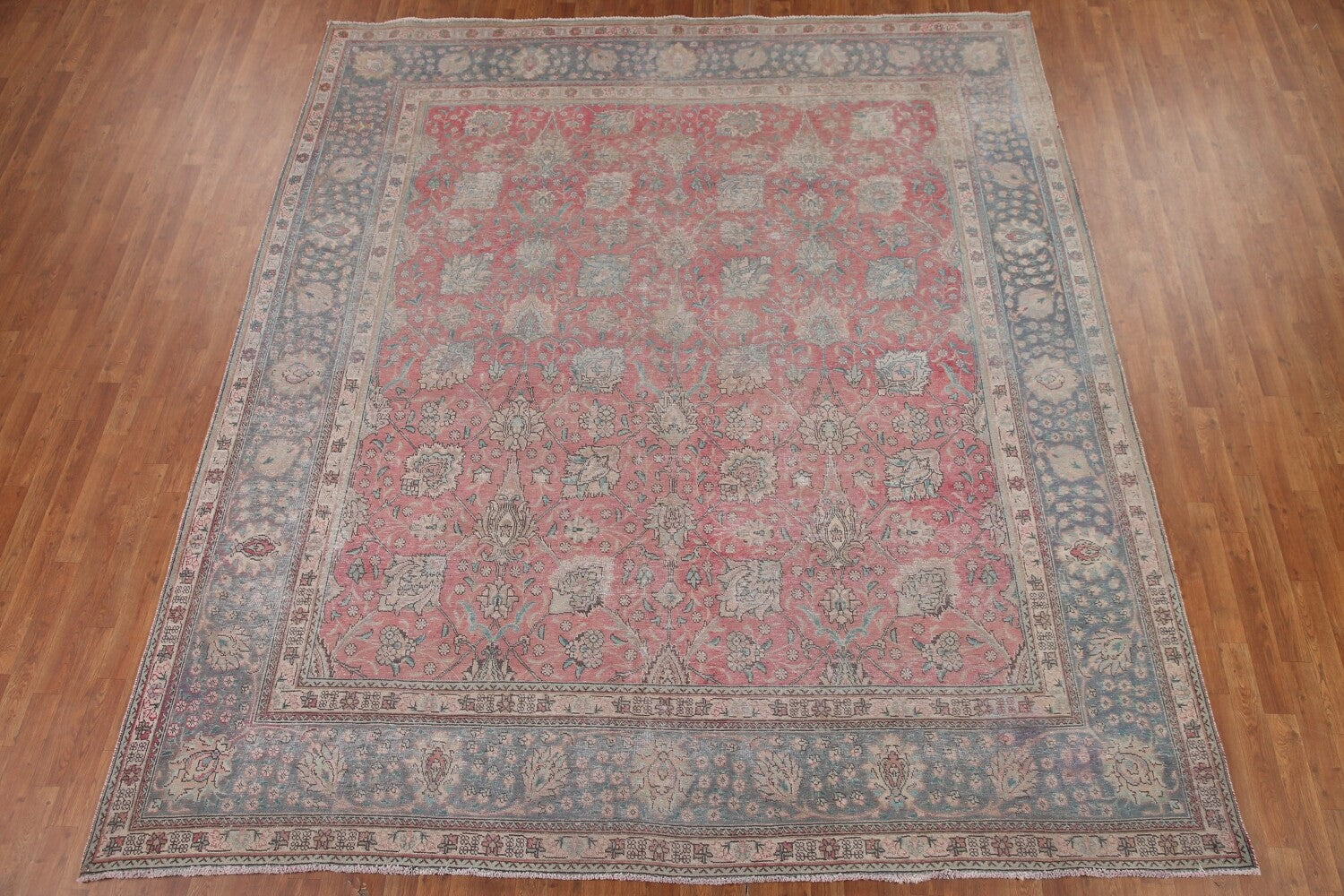 A Beautiful Genuine Persia ( Persia ) Tabriz rug is Hand Knotted by skillful weavers in Persia ( Persia ) with 100% Wool Material. This rug is in Very Good (Evenly Low Pile-Repair) condition. dimensions are 10' 10'' X 9' 9'' in foot and 330 X 297 in centimeter. the primary color is Pink.