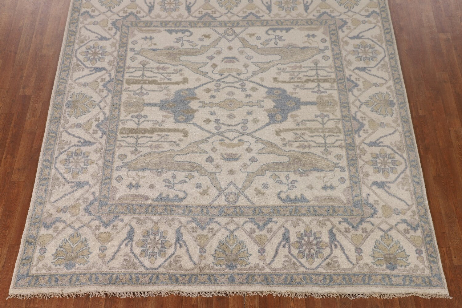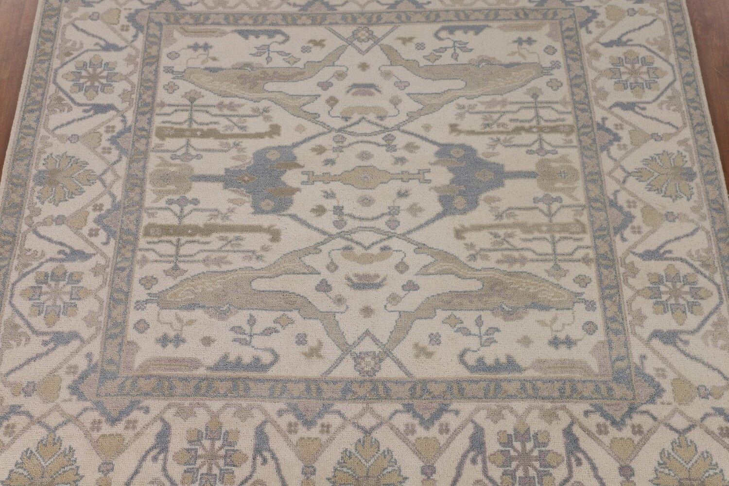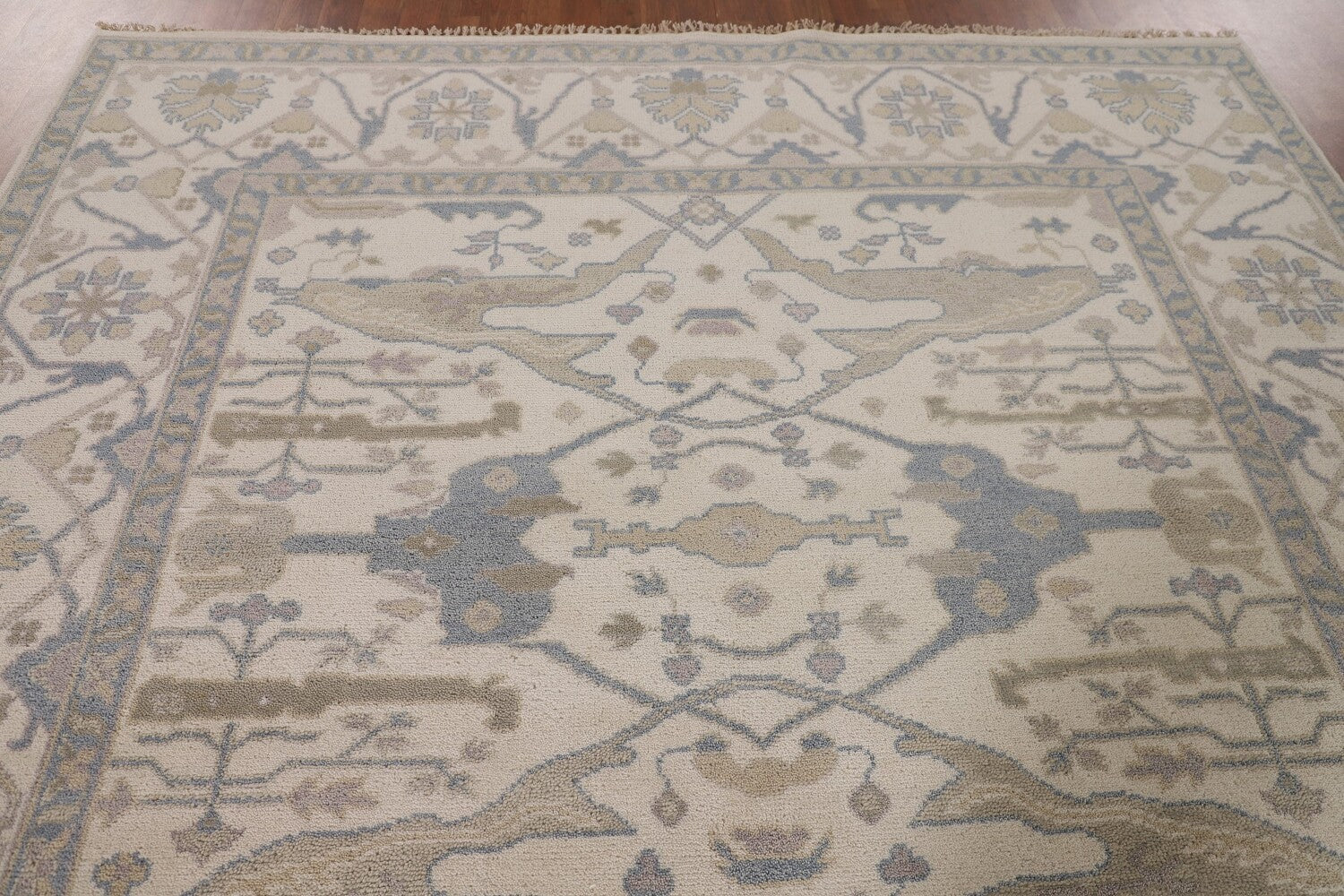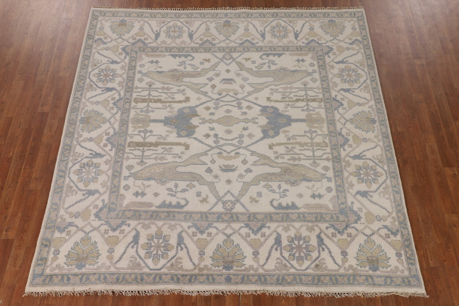 A Beautiful Genuine India Oushak rug is Hand Knotted by skillful weavers in India with 100% Wool Material. This rug is in New, First Quality condition. dimensions are 7' 11'' X 7' 10'' in foot and 241 X 239 in centimeter. the primary color is Beige & Ivories.
