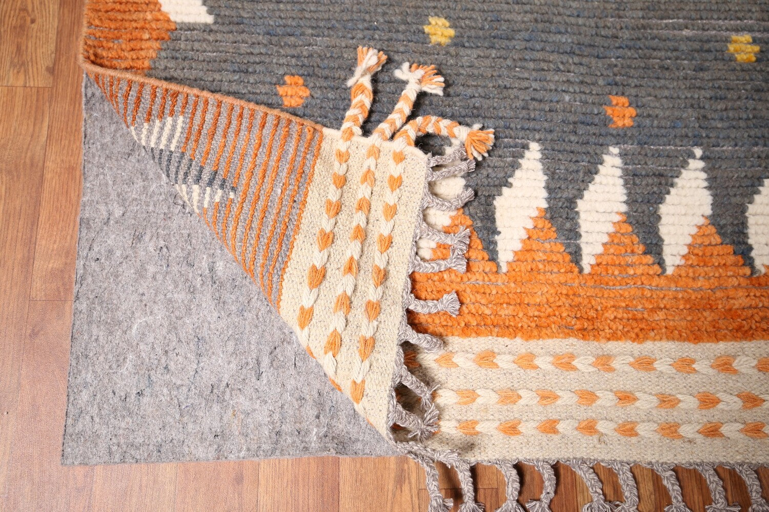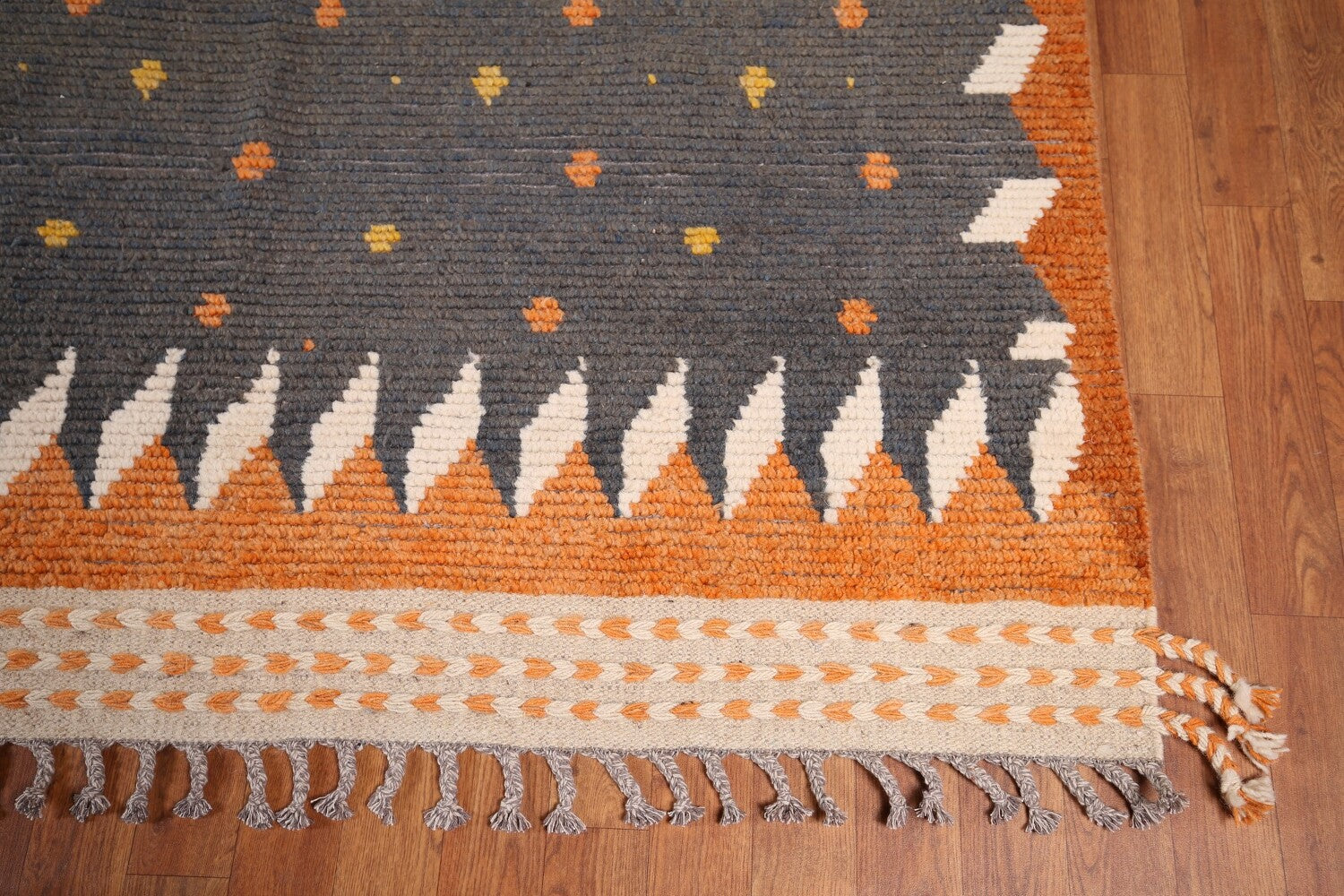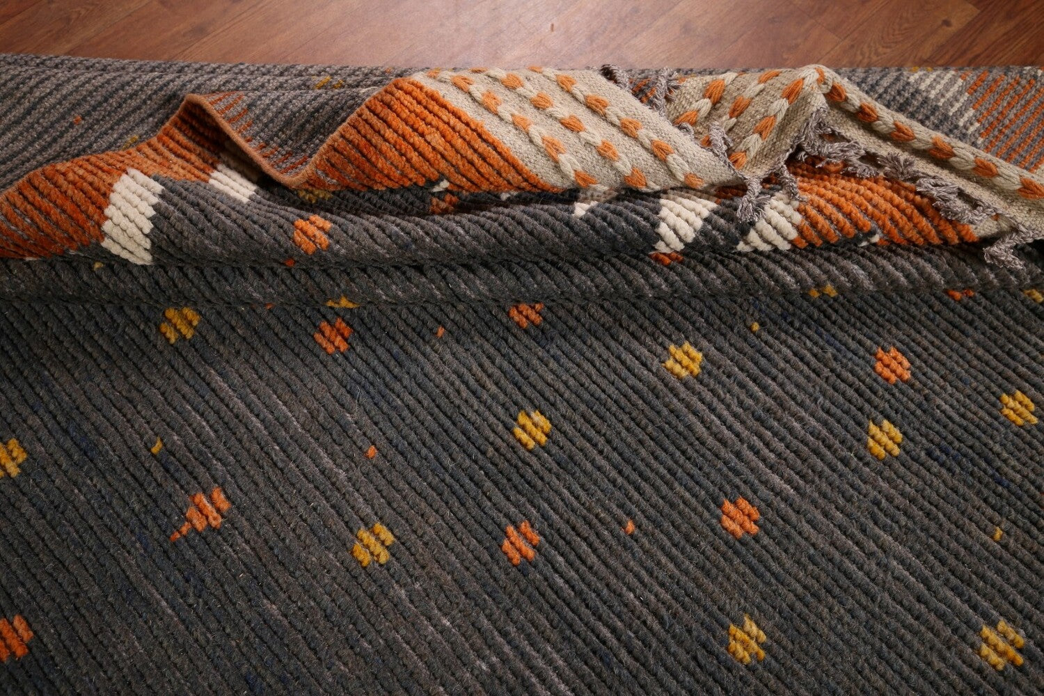 A Beautiful Genuine Pakistan Moroccan rug is Hand Knotted by skillful weavers in Pakistan with 100% Wool Material. This rug is in New, First Quality condition. dimensions are 18' 11'' X 11' 9'' in foot and 577 X 358 in centimeter. the primary color is Greys & Charcoal.