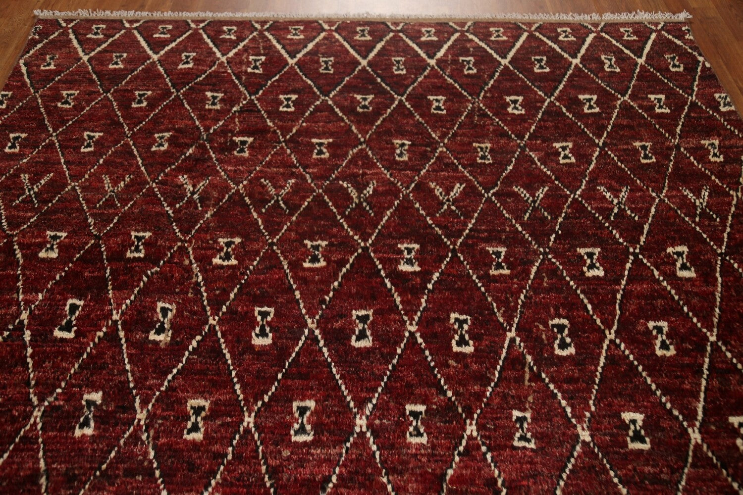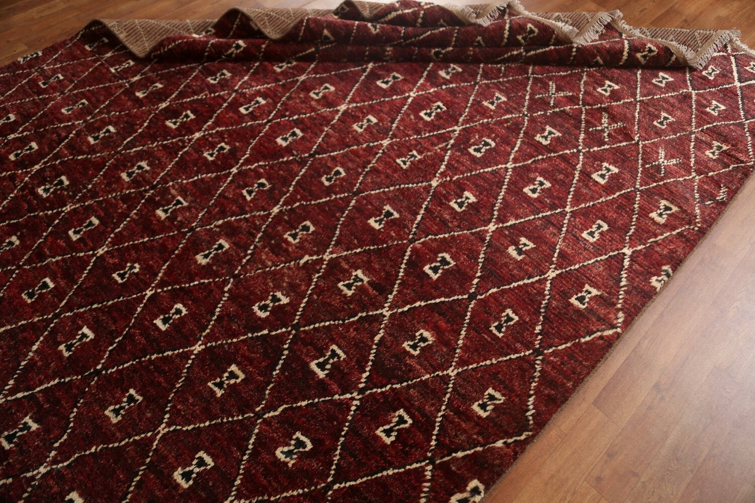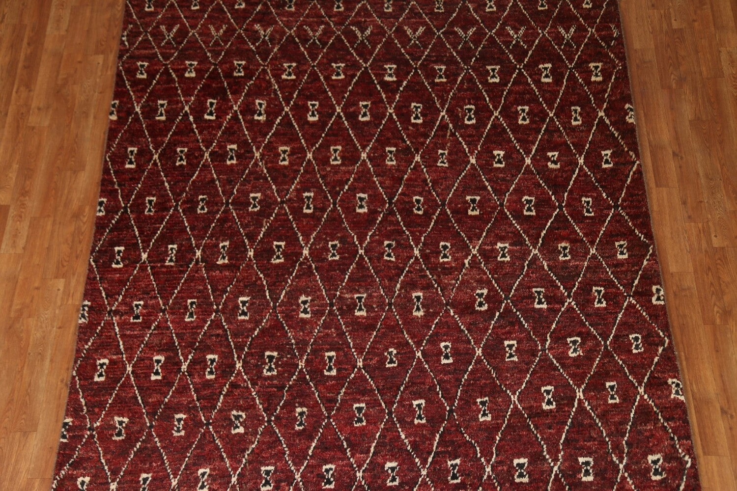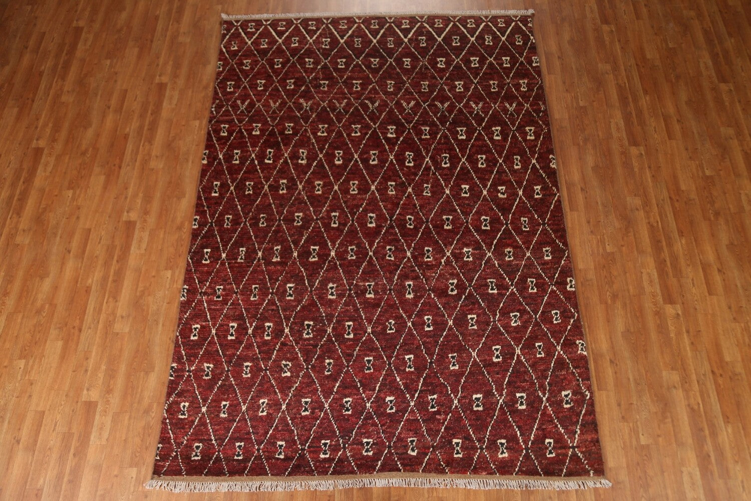 A Beautiful Genuine Pakistan Moroccan rug is Hand Knotted by skillful weavers in Pakistan with 100% Wool Material. This rug is in condition. dimensions are 9' 7'' X 6' 9'' in foot and 292 X 206 in centimeter. the primary color is Red.
