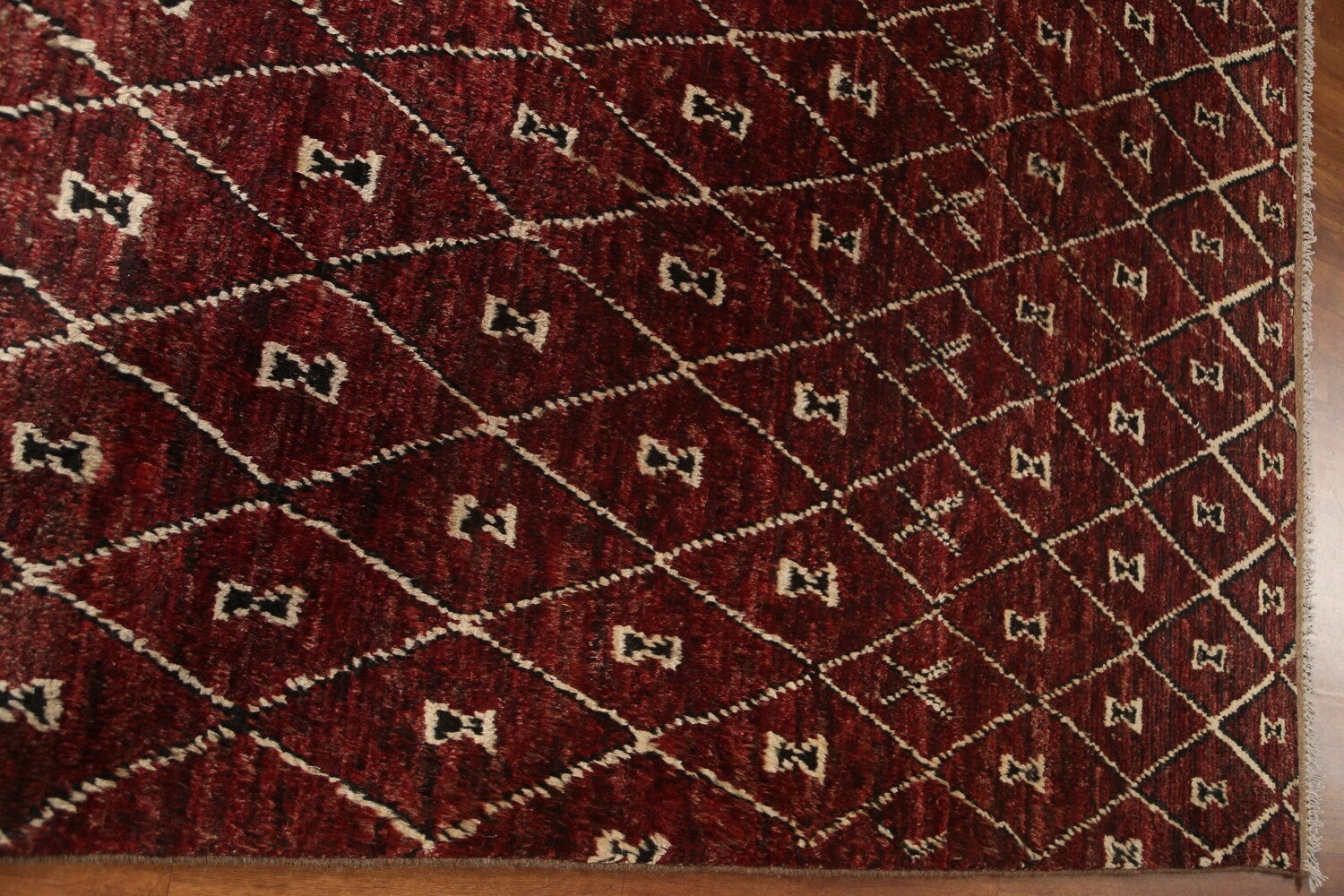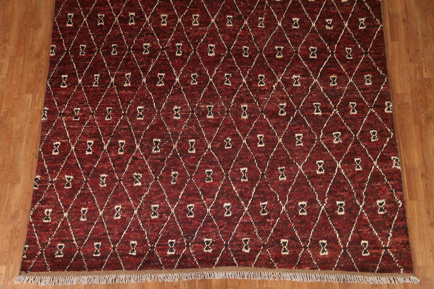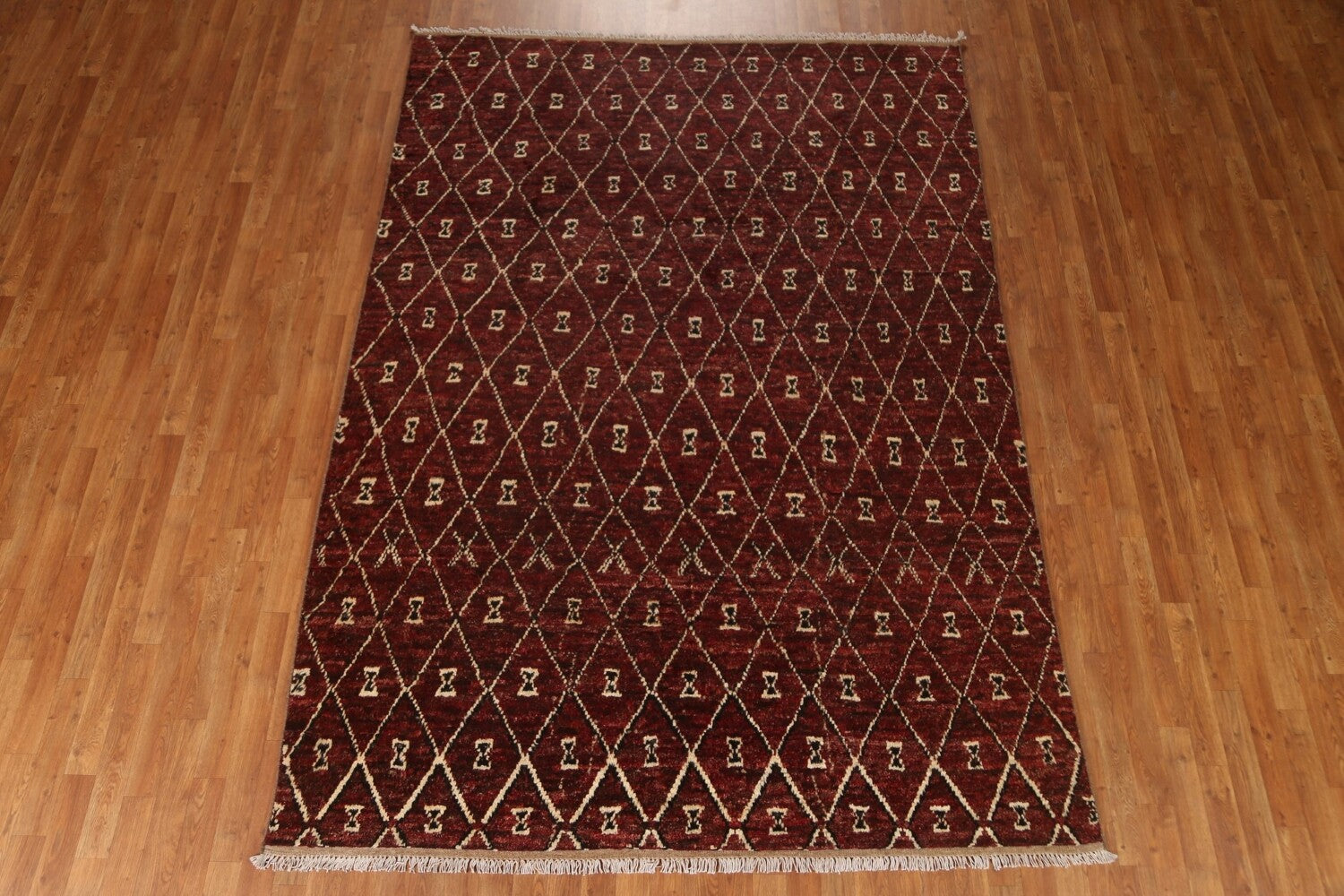 A Beautiful Genuine Pakistan Moroccan rug is Hand Knotted by skillful weavers in Pakistan with 100% Wool Material. This rug is in condition. dimensions are 9' 7'' X 6' 9'' in foot and 292 X 206 in centimeter. the primary color is Red.