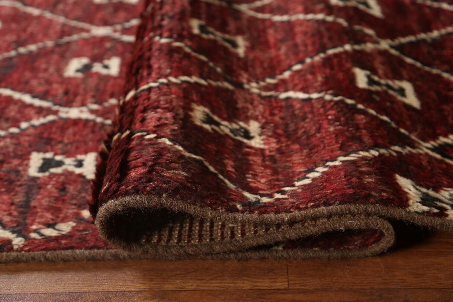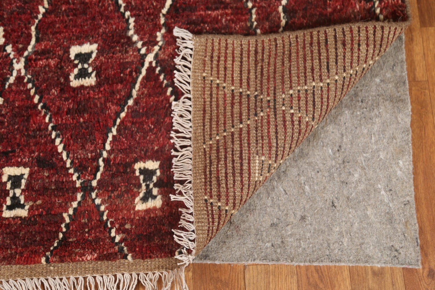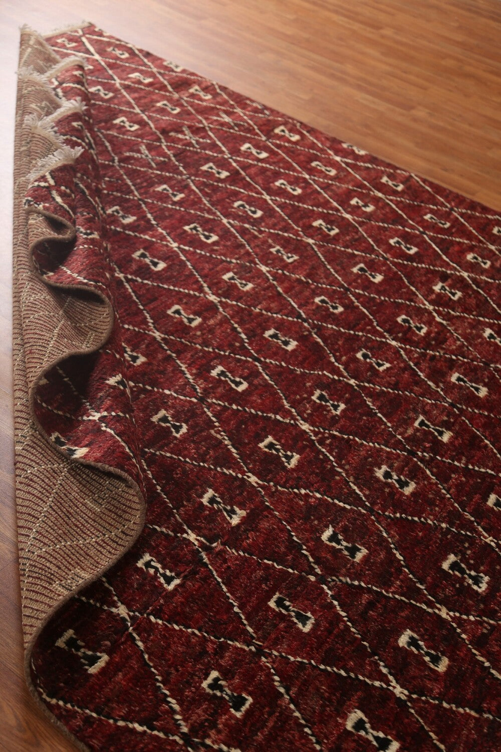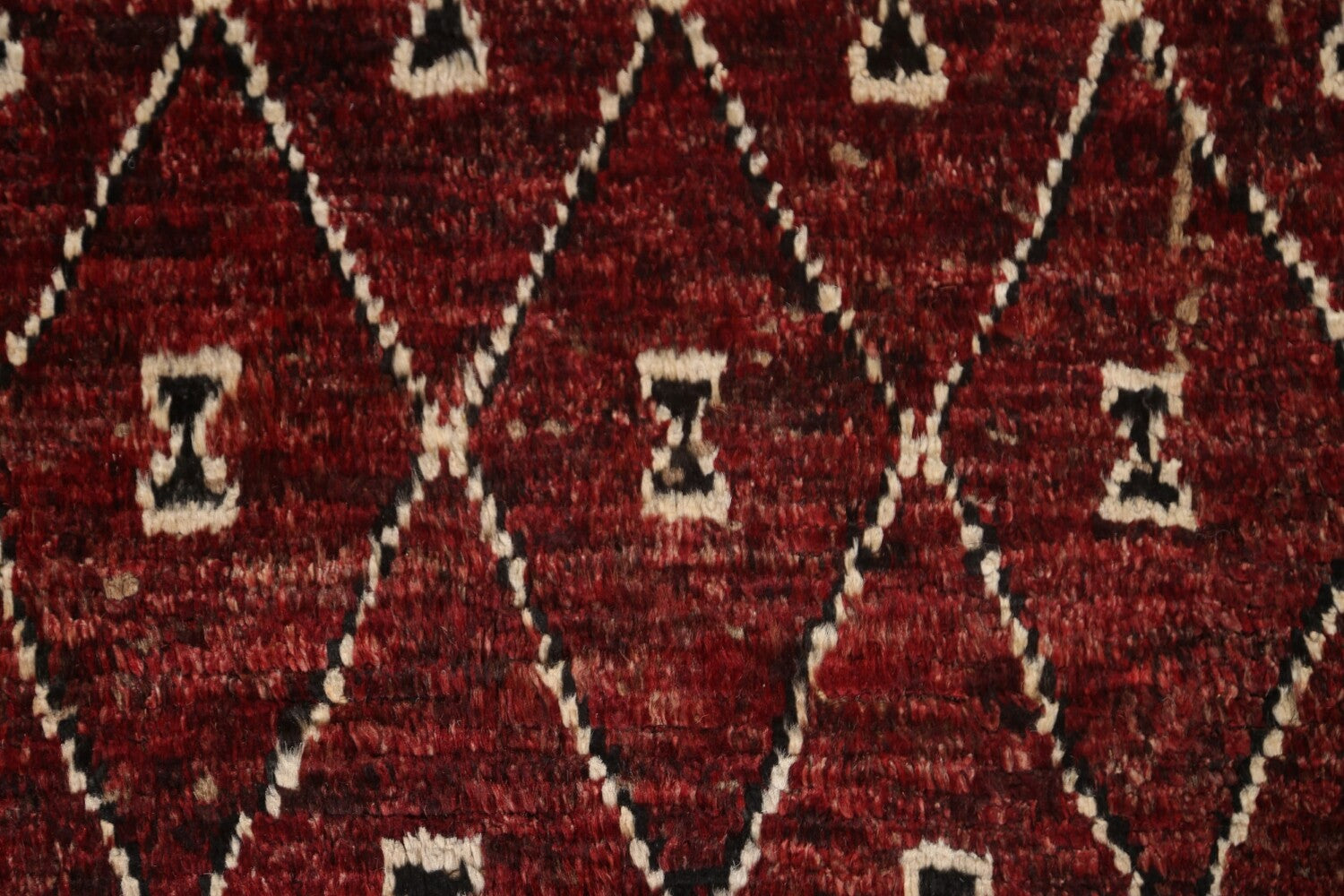 A Beautiful Genuine Pakistan Moroccan rug is Hand Knotted by skillful weavers in Pakistan with 100% Wool Material. This rug is in condition. dimensions are 9' 7'' X 6' 9'' in foot and 292 X 206 in centimeter. the primary color is Red.