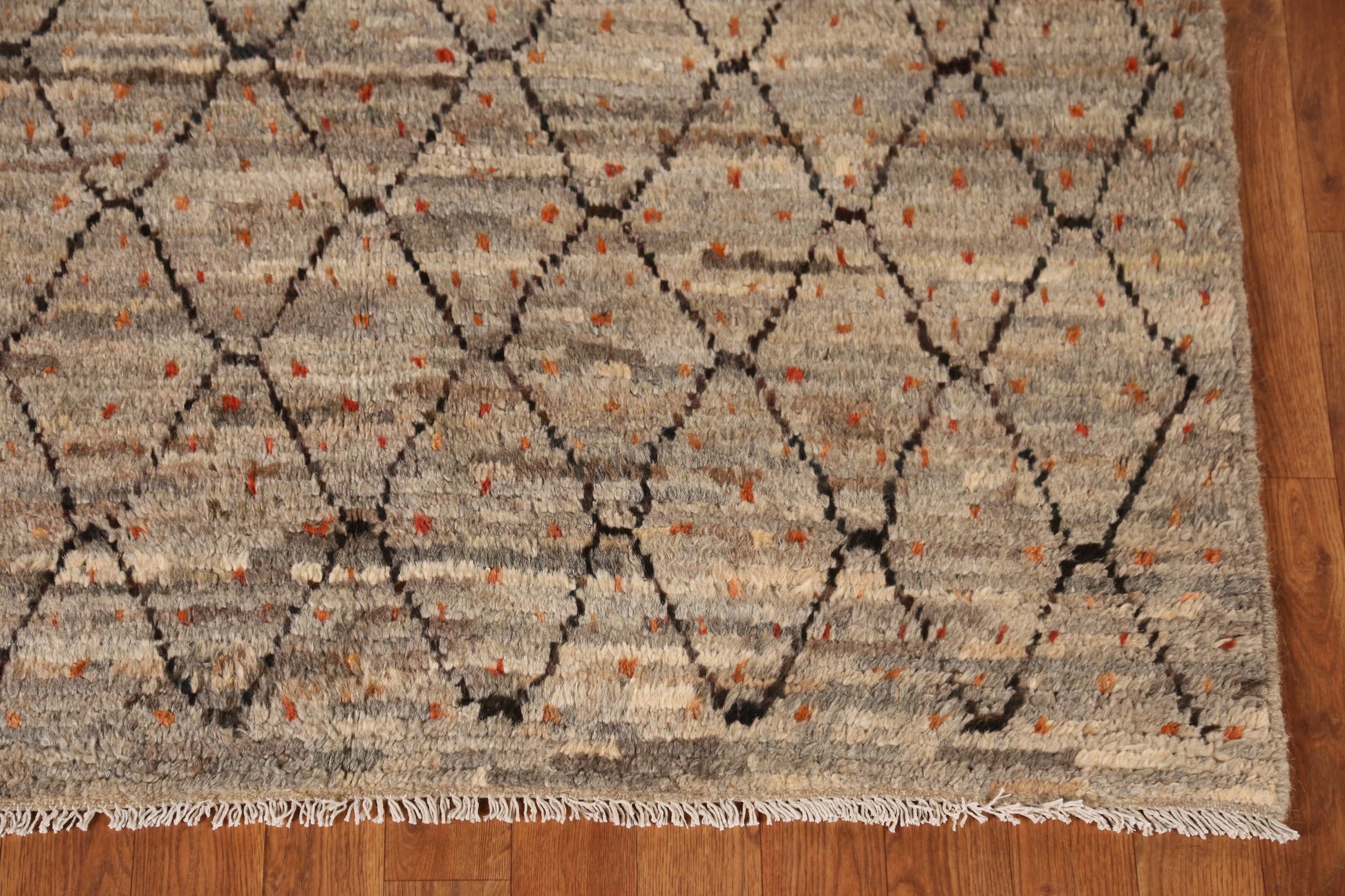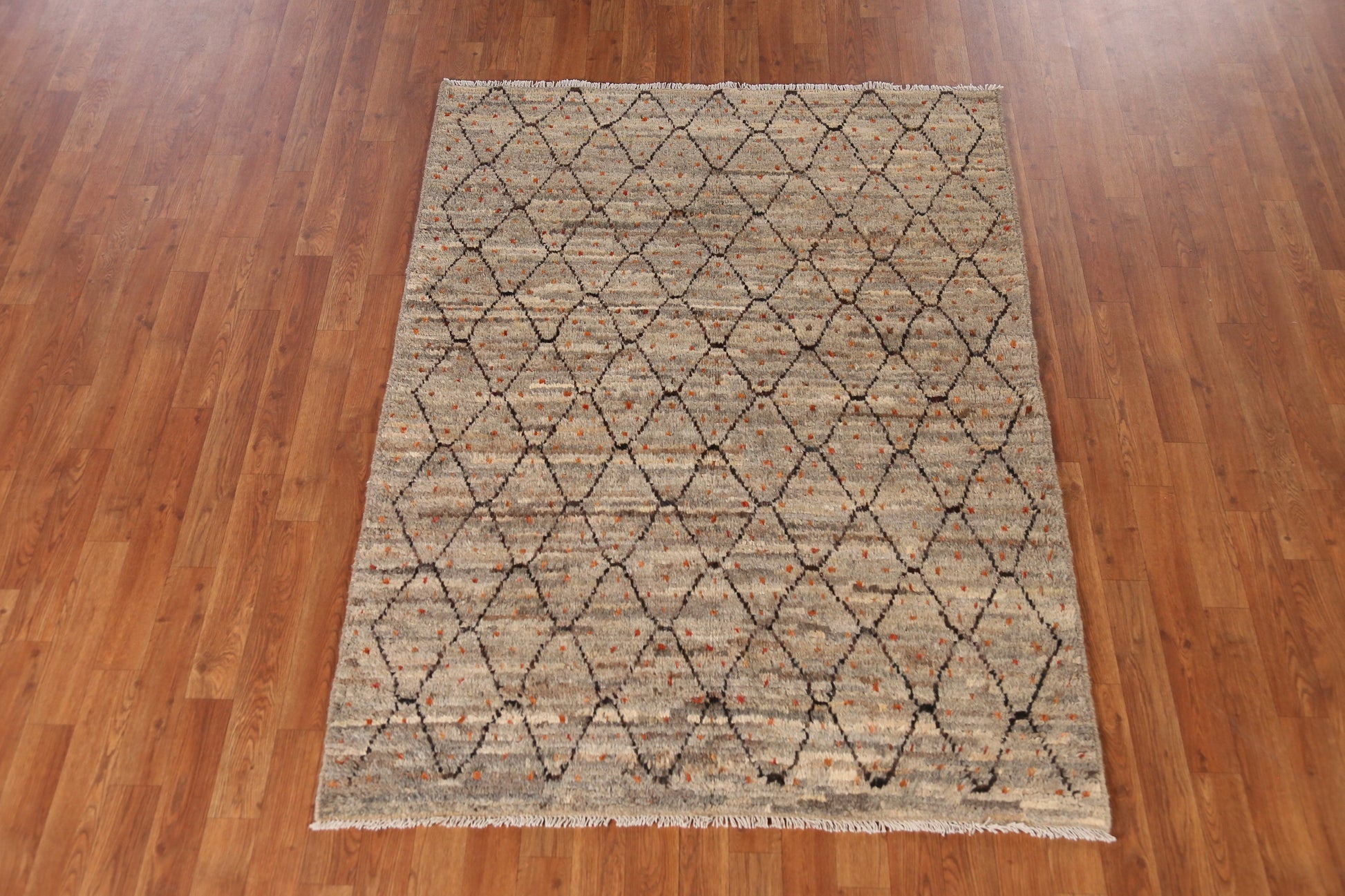 A Beautiful Genuine Pakistan Moroccan rug is Hand Knotted by skillful weavers in Pakistan with 100% Wool Material. This rug is in New, First Quality condition. dimensions are 5' 8'' X 4' 3'' in foot and 173 X 130 in centimeter. the primary color is Beige & Ivories.