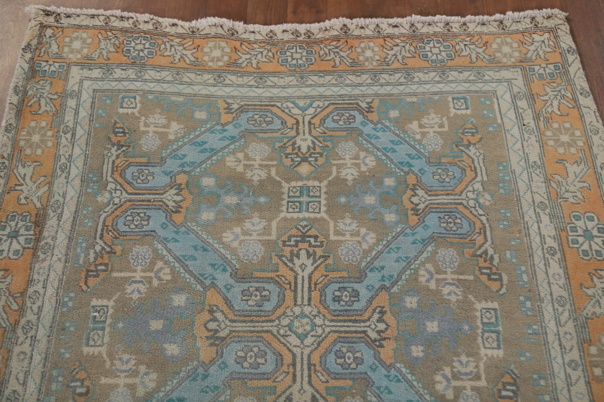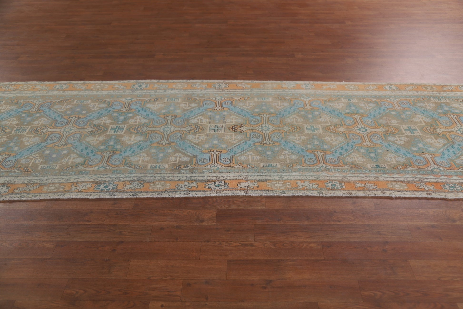 A Beautiful Genuine Persia ( Persia ) Heriz rug is Hand Knotted by skillful weavers in Persia ( Persia ) with 100% Wool Material. This rug is in Very Good condition. dimensions are 10' 9'' X 3' 4'' in foot and 328 X 102 in centimeter. the primary color is Beige & Ivories.
