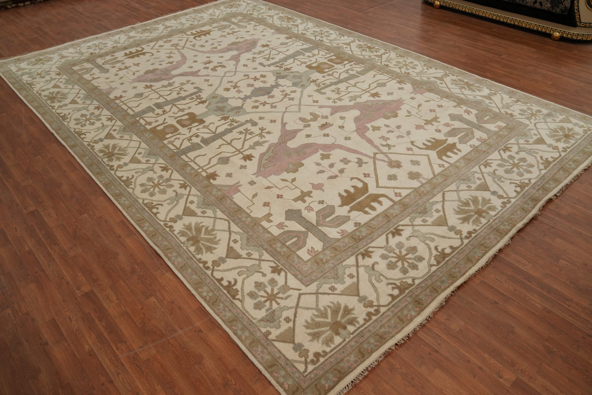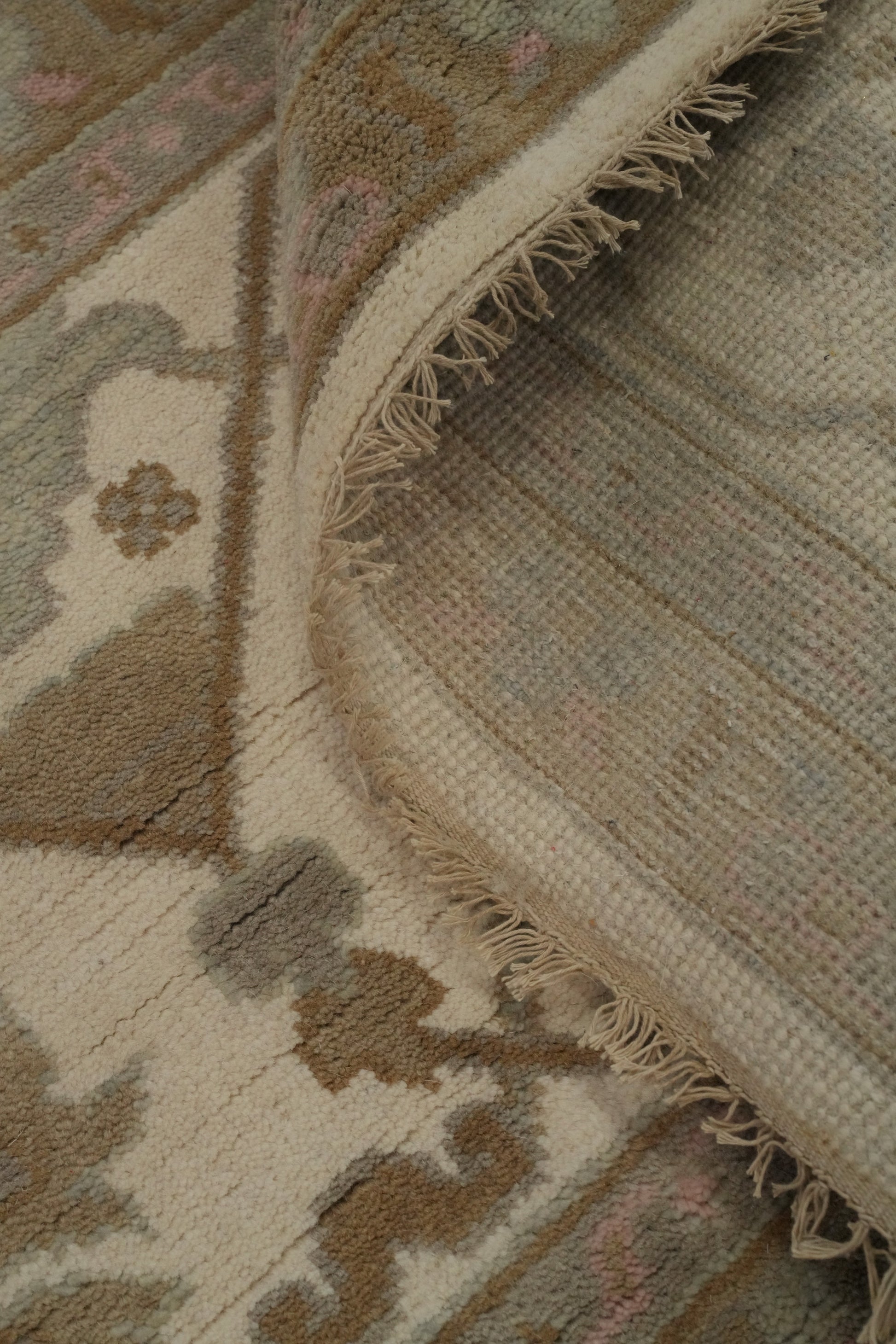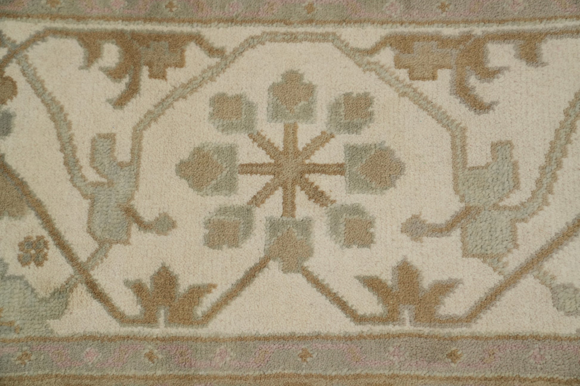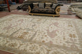 A Beautiful Genuine India Oushak rug is Hand Knotted by skillful weavers in India with 100% Wool Material. This rug is in New, First Quality condition. dimensions are 18' 1'' X 12' 1'' in foot and 551 X 368 in centimeter. the primary color is Beige & Ivories.