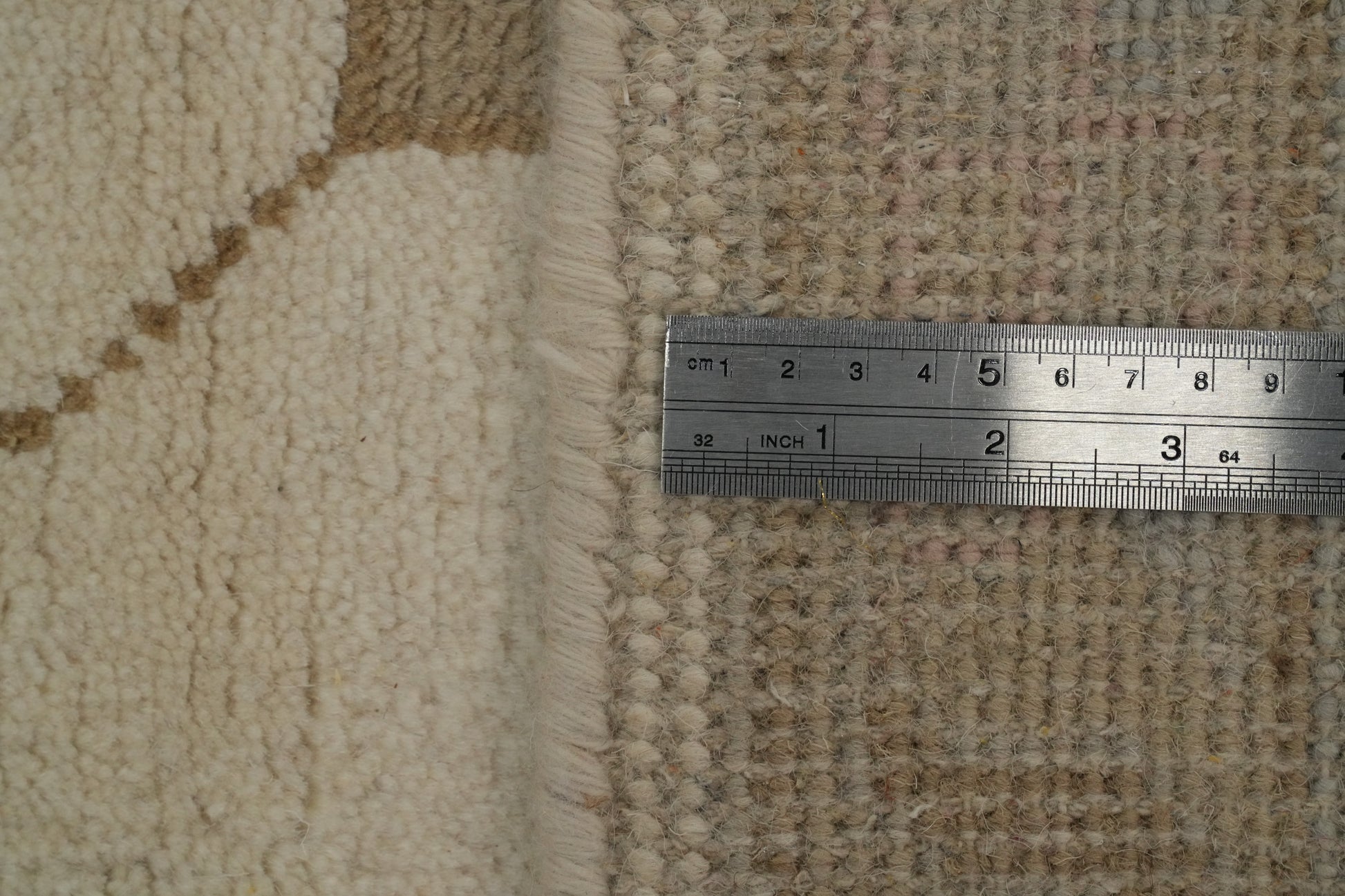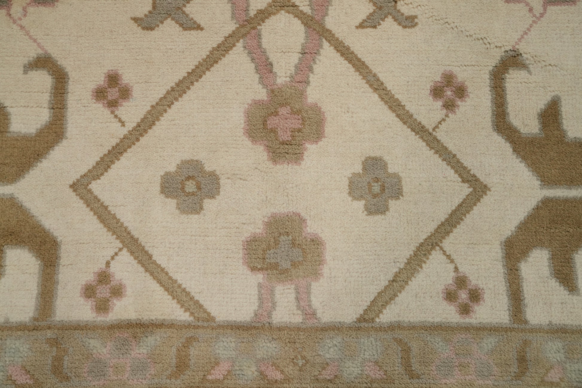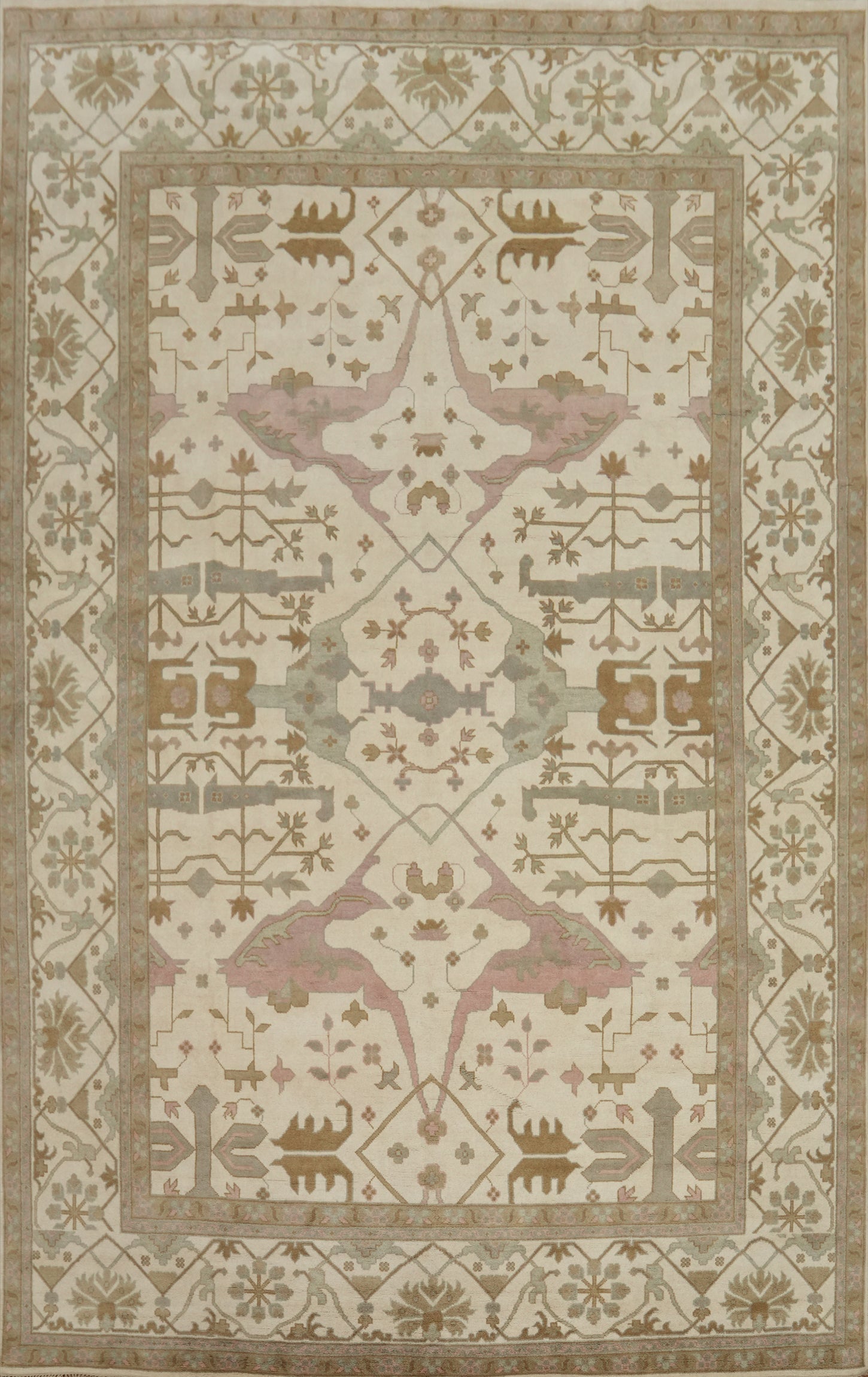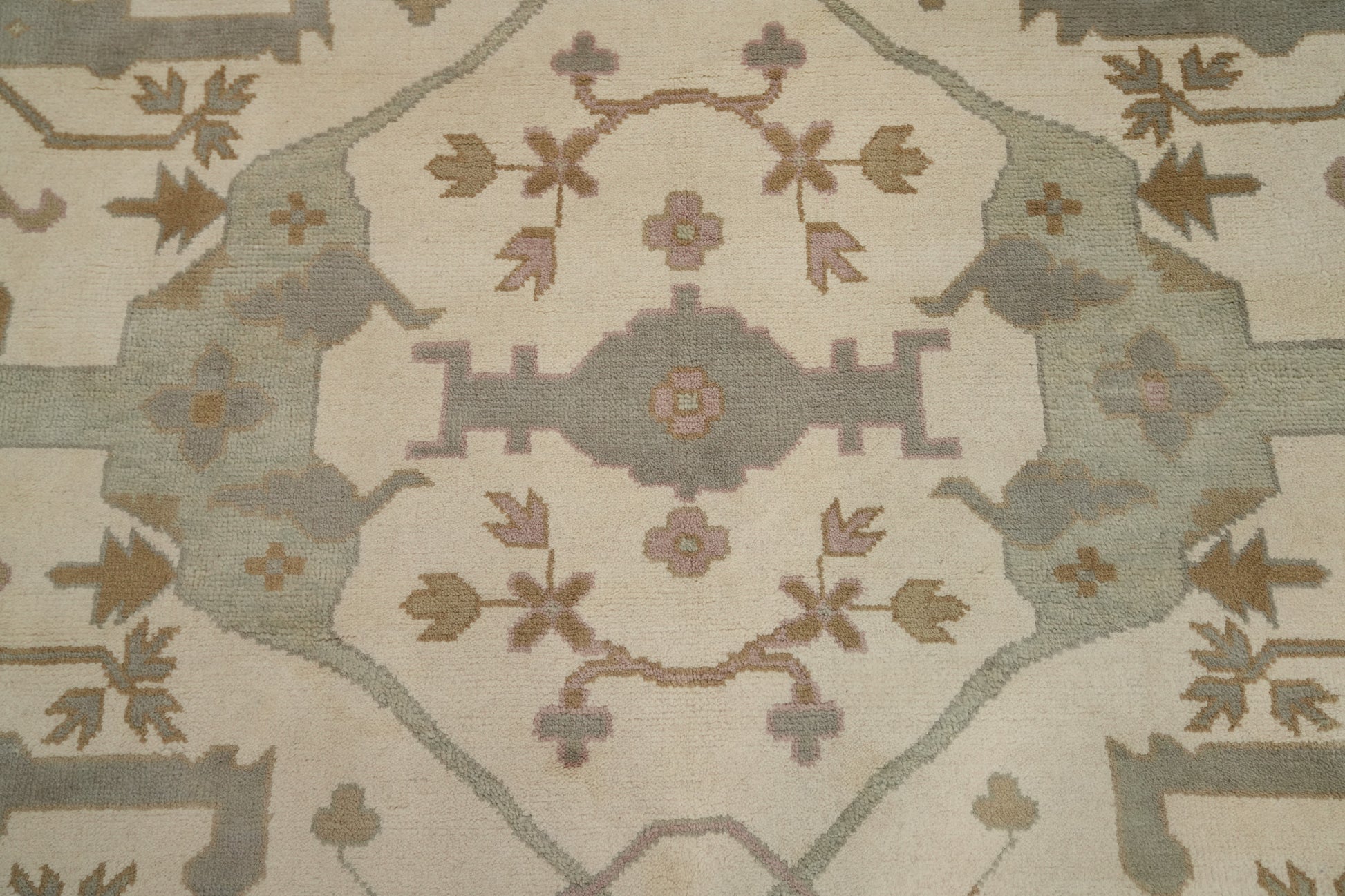 A Beautiful Genuine India Oushak rug is Hand Knotted by skillful weavers in India with 100% Wool Material. This rug is in New, First Quality condition. dimensions are 18' 1'' X 12' 1'' in foot and 551 X 368 in centimeter. the primary color is Beige & Ivories.