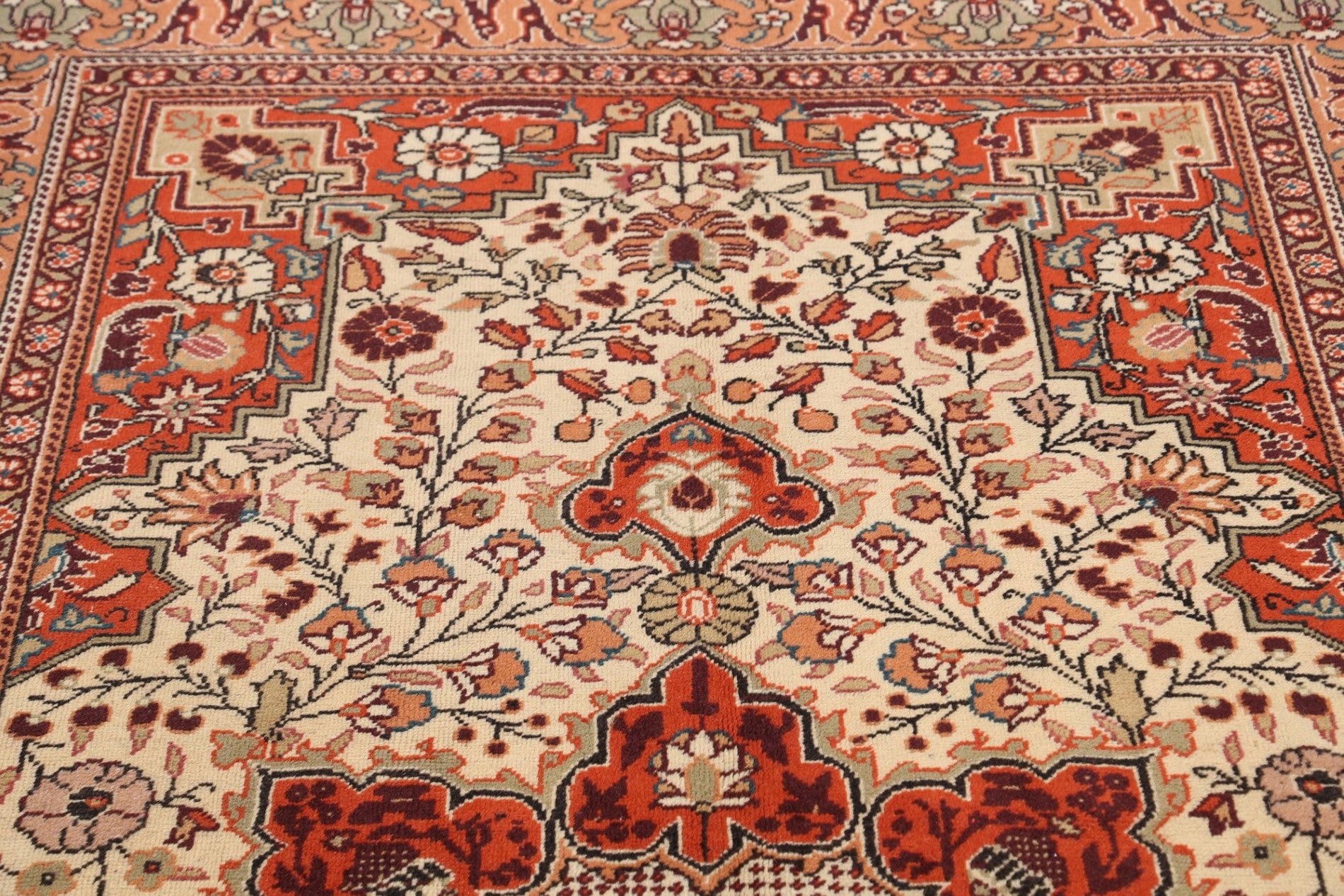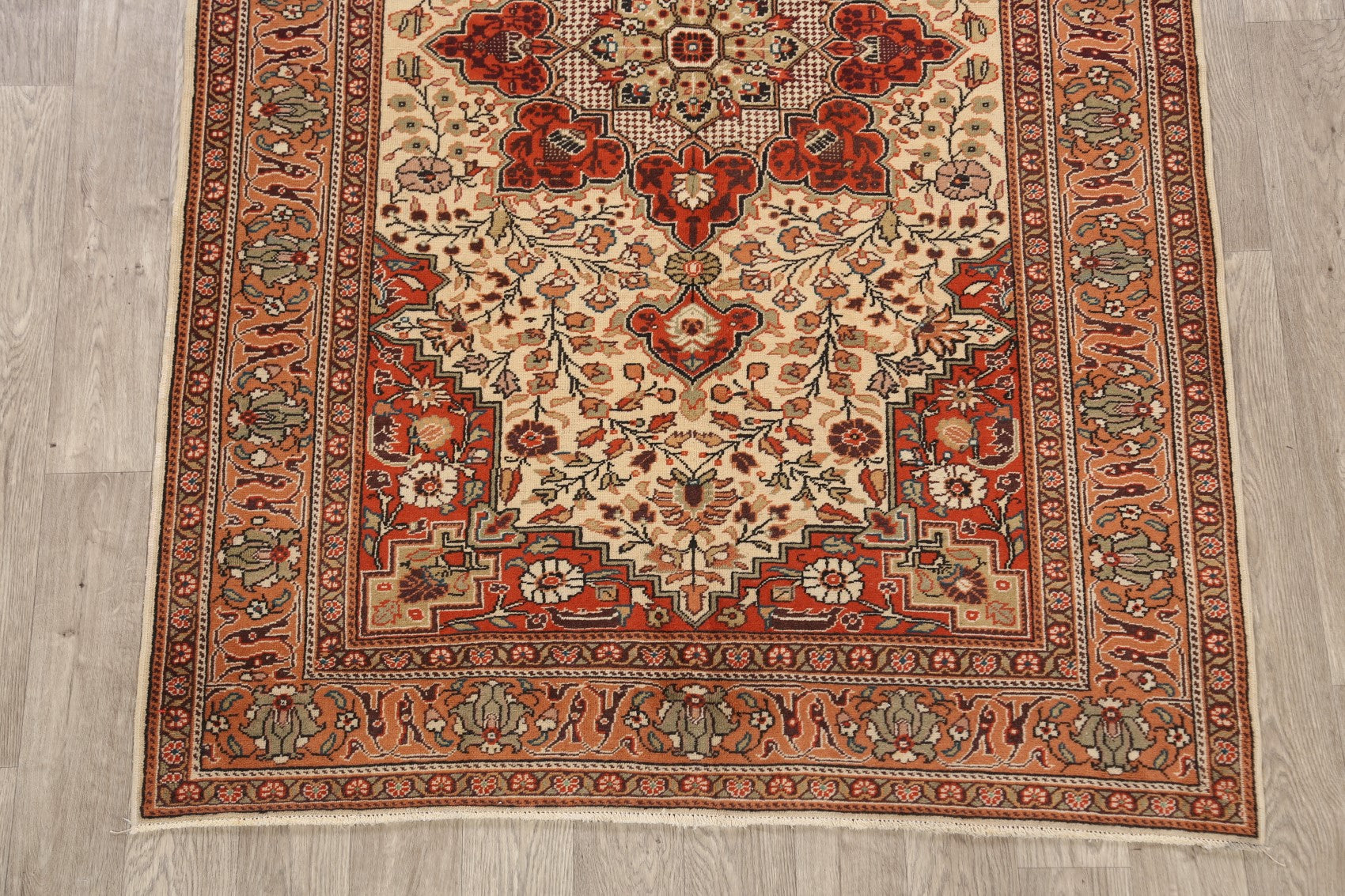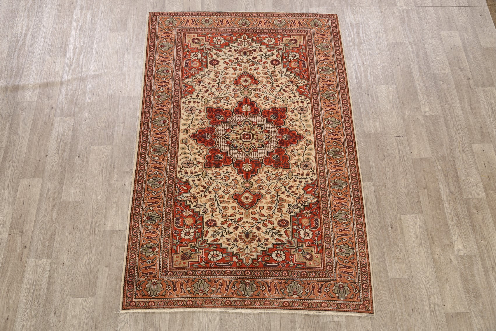 A Beautiful Genuine Turkey Anatolian rug is Hand Knotted by skillful weavers in Turkey with 100% Wool Material. This rug is in Very Good condition. dimensions are 7' 5'' X 4' 6'' in foot and 226 X 137 in centimeter. the primary color is Beige & Ivories.