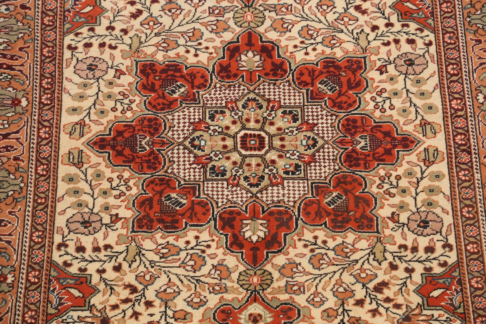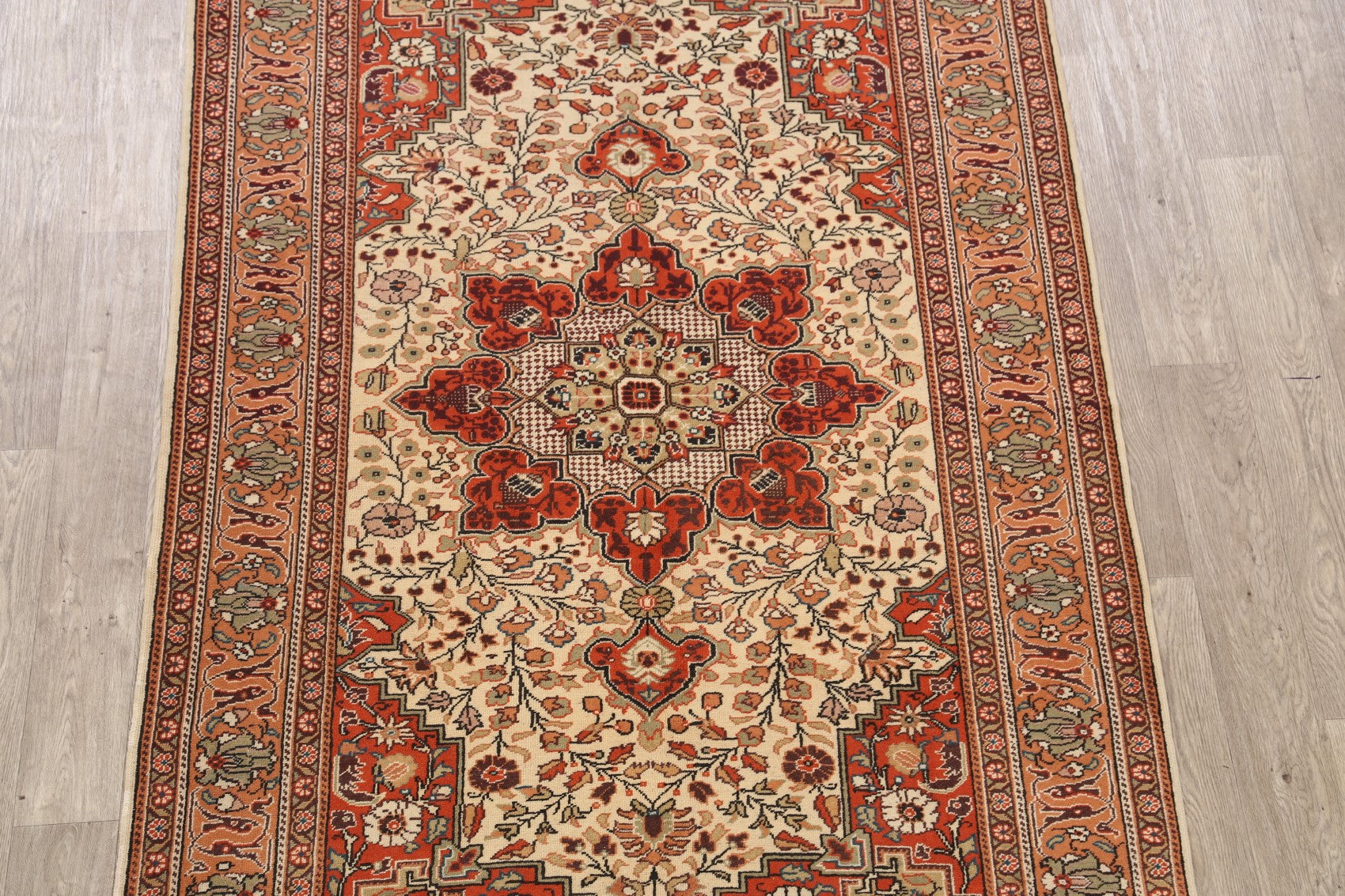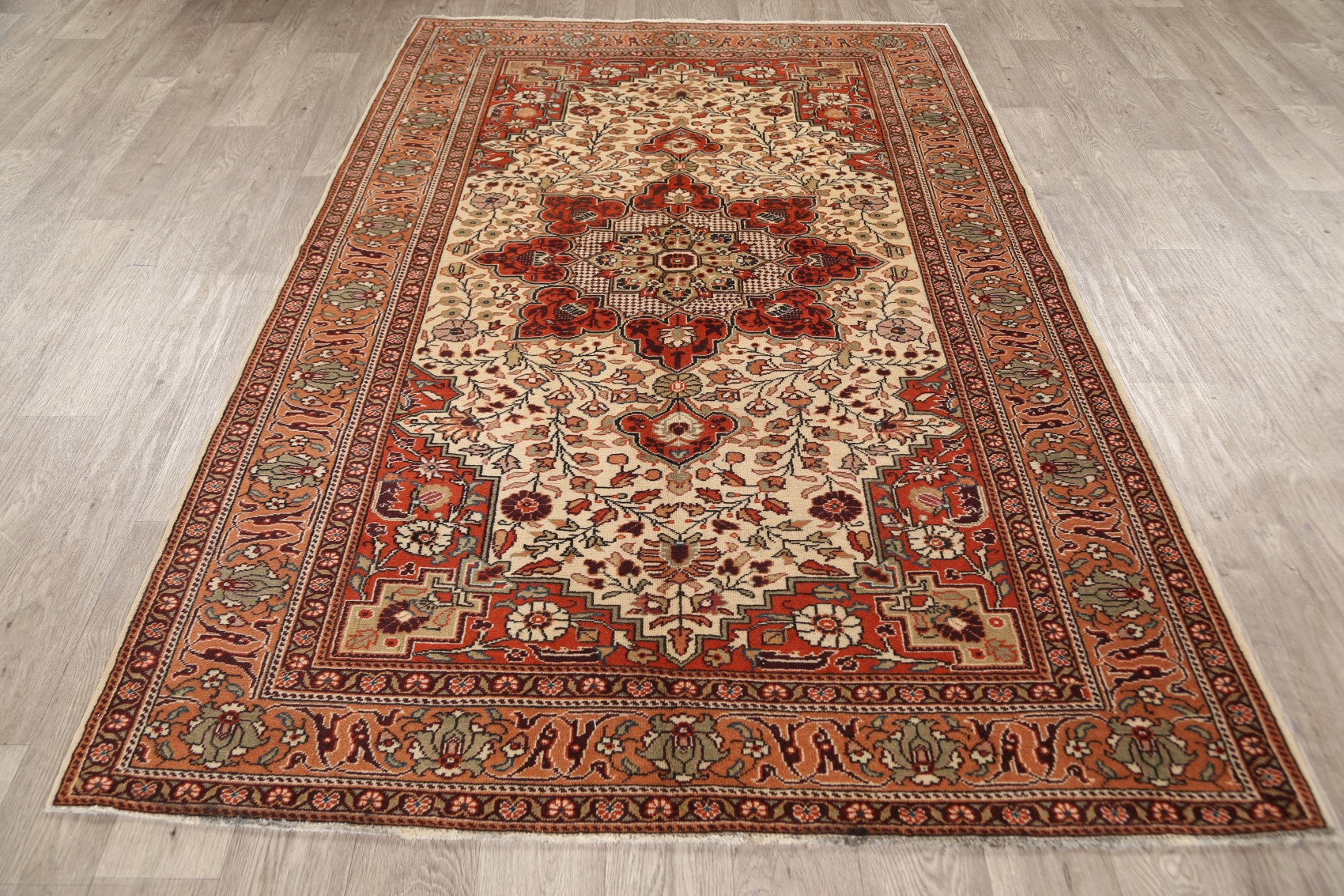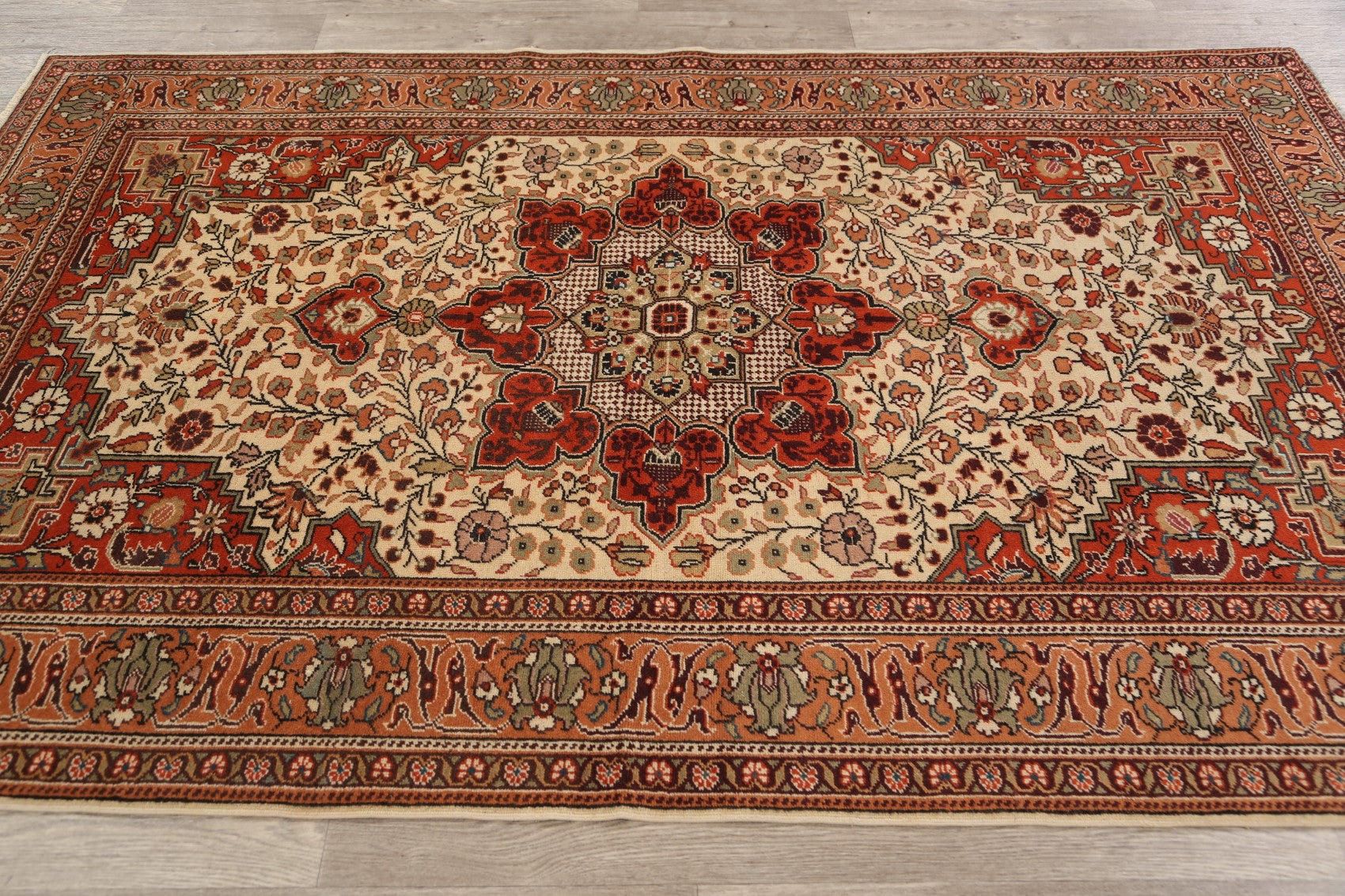 A Beautiful Genuine Turkey Anatolian rug is Hand Knotted by skillful weavers in Turkey with 100% Wool Material. This rug is in Very Good condition. dimensions are 7' 5'' X 4' 6'' in foot and 226 X 137 in centimeter. the primary color is Beige & Ivories.