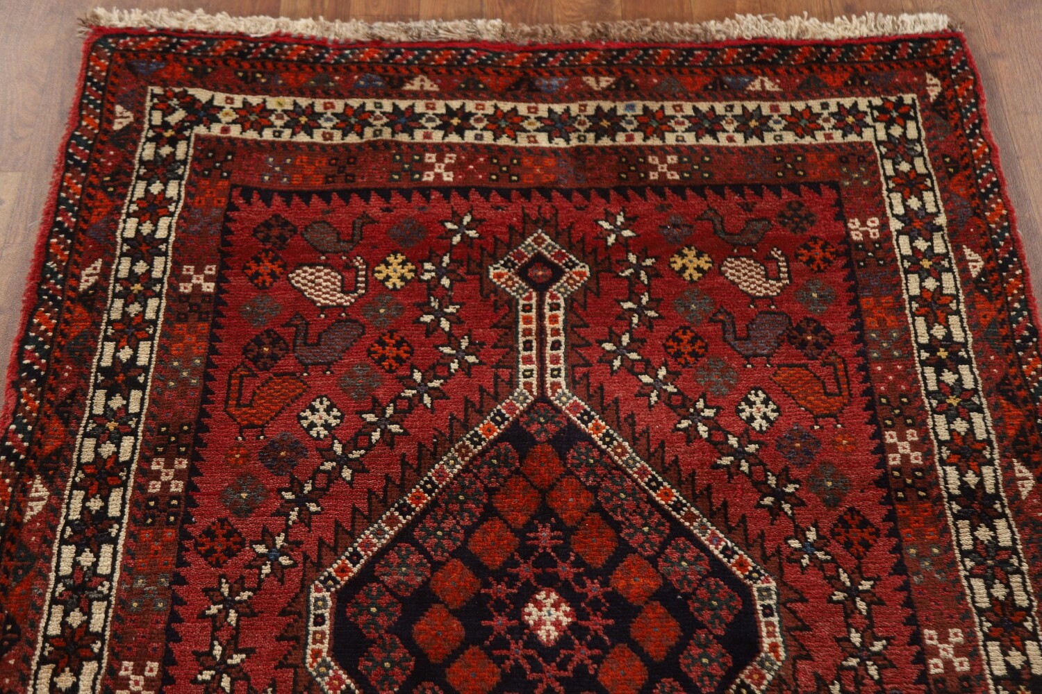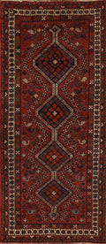 A Beautiful Genuine Persia ( Persia ) Shiraz rug is Hand Knotted by skillful weavers in Persia ( Persia ) with 100% Wool Material. This rug is in Very Good condition. dimensions are 9' 4'' X 3' 4'' in foot and 284 X 102 in centimeter. the primary color is Red.