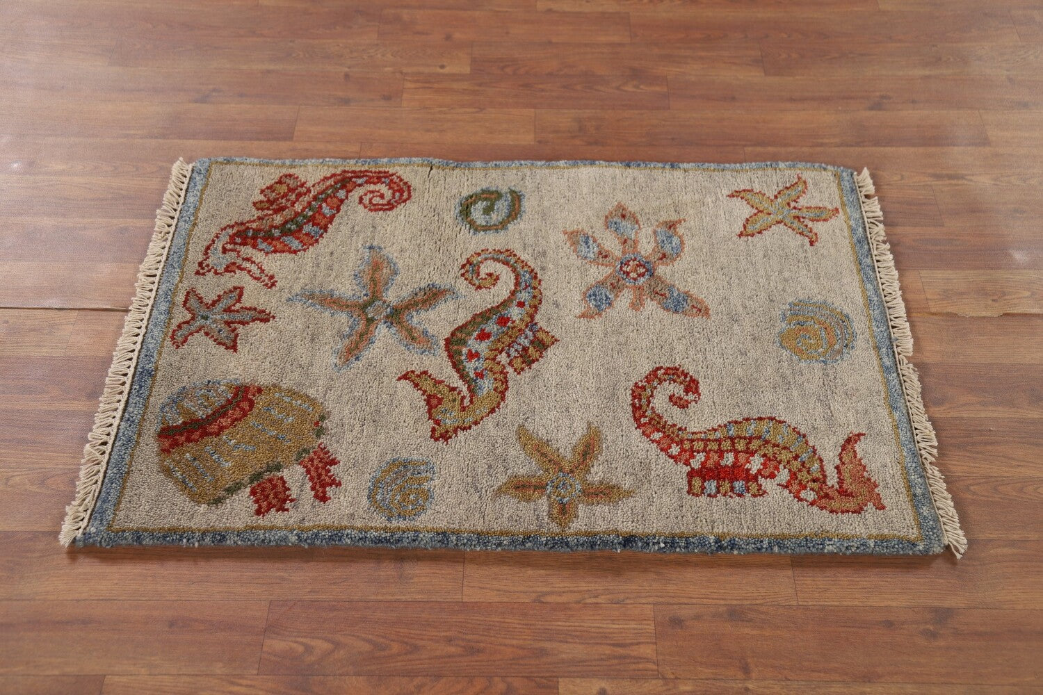 A Beautiful Genuine India Art Deco rug is Hand Knotted by skillful weavers in India with 100% Wool Material. This rug is in condition. dimensions are 3' 0'' X 2' 0'' in foot and 91 X 61 in centimeter. the primary color is Beige & Ivories.