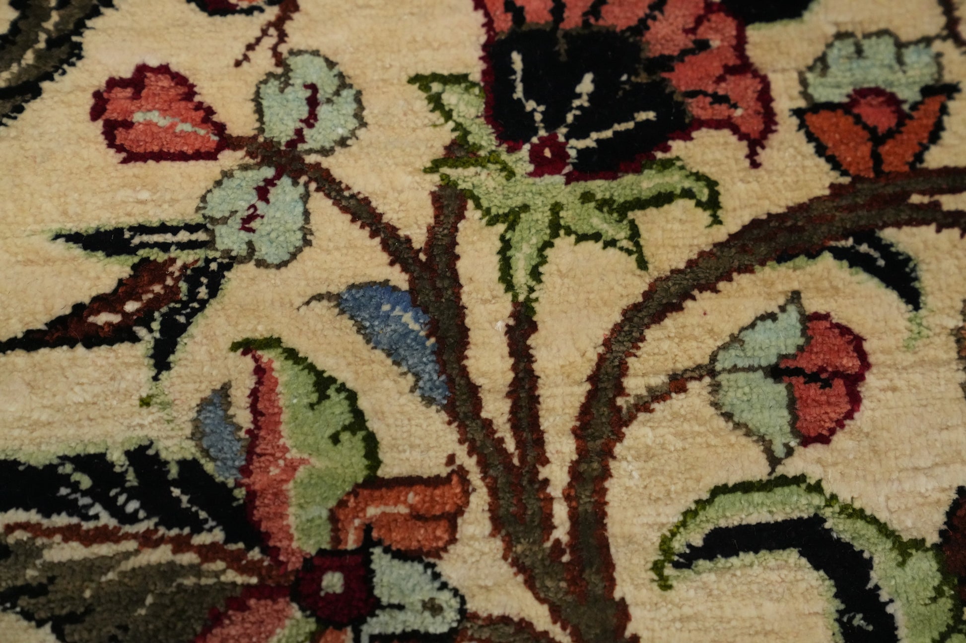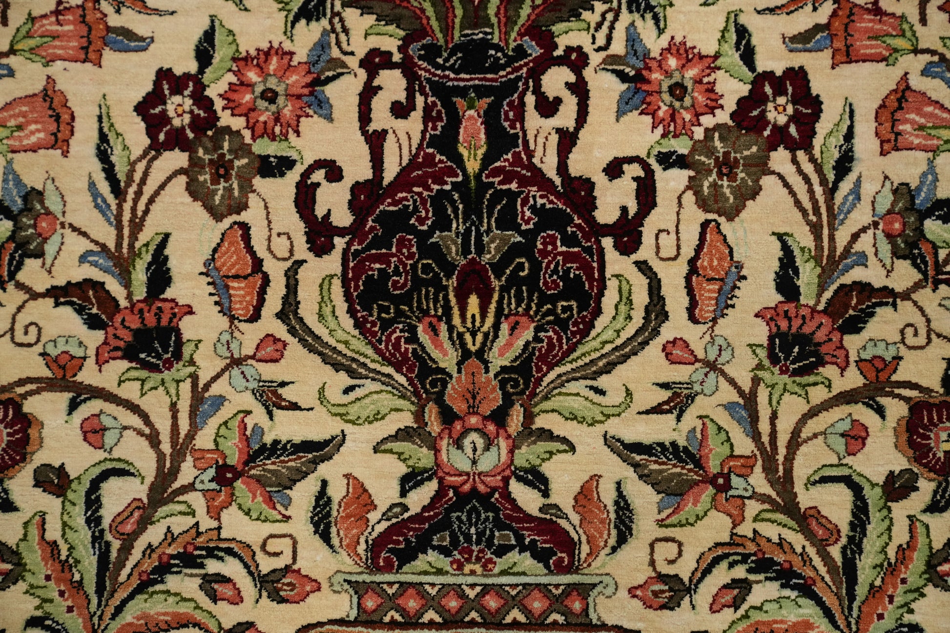 A Beautiful Genuine Persia ( Persia ) Qum rug is Hand Knotted by skillful weavers in Persia ( Persia ) with 100% Silk Material. This rug is in New, First Quality condition. dimensions are 5' 3'' X 3' 6'' in foot and 160 X 107 in centimeter. the primary color is Beige & Ivories.