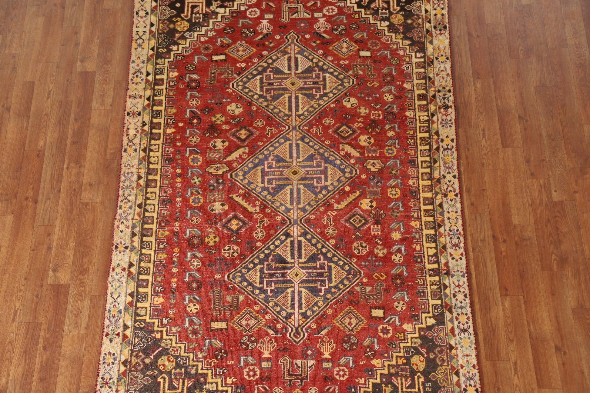 A Beautiful Genuine Persia ( Persia ) Shiraz rug is Hand Knotted by skillful weavers in Persia ( Persia ) with 100% Wool Material. This rug is in Very Good (Evenly Low Pile) condition. dimensions are 8' 0'' X 4' 6'' in foot and 244 X 137 in centimeter. the primary color is Red.