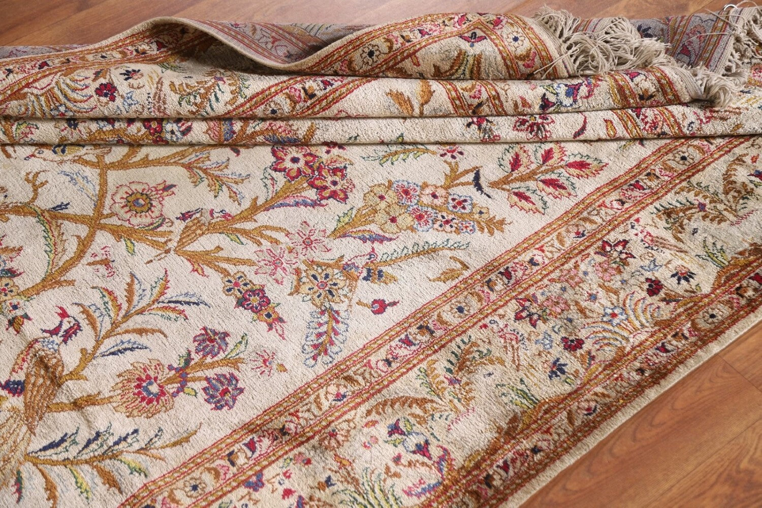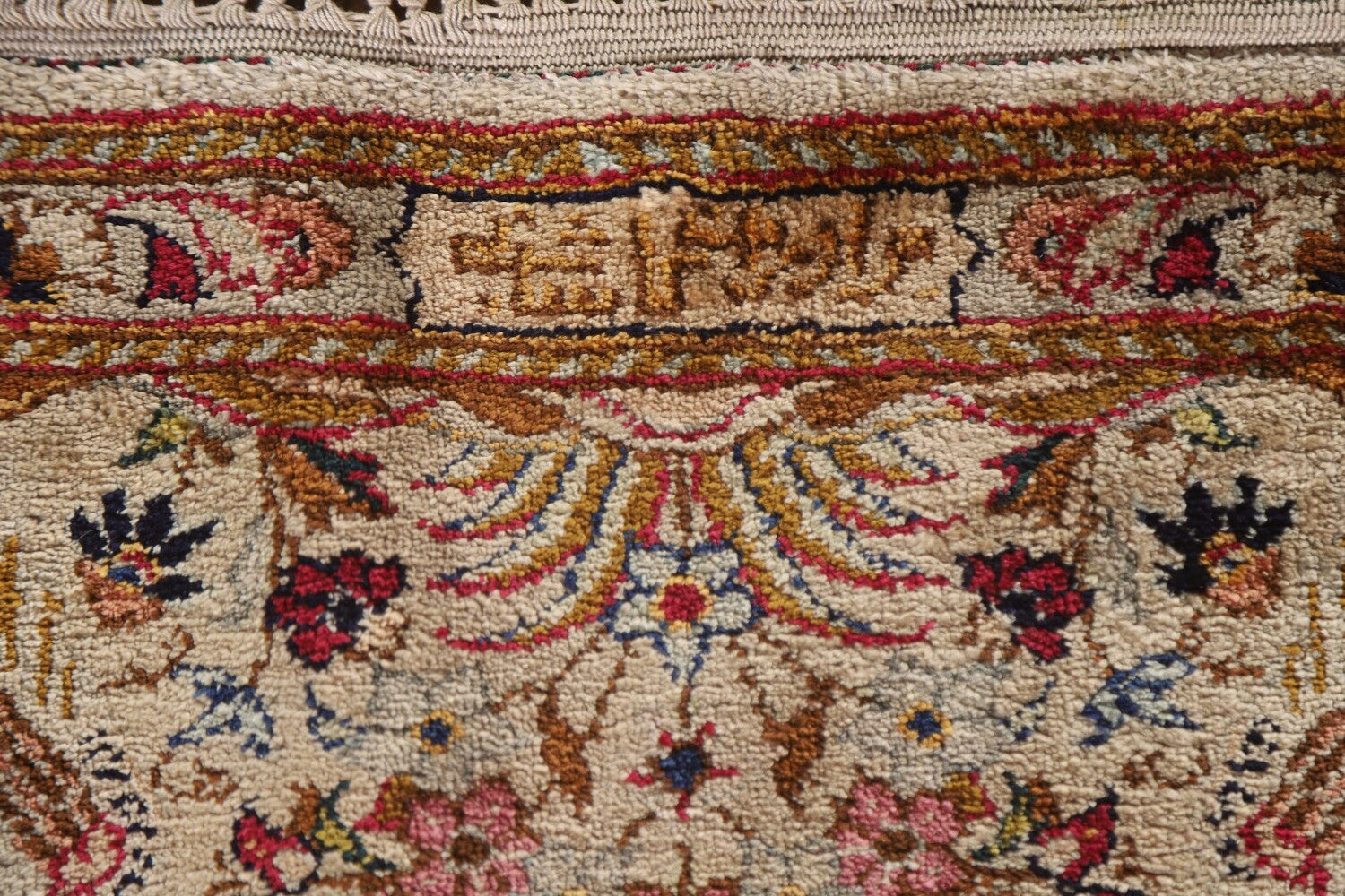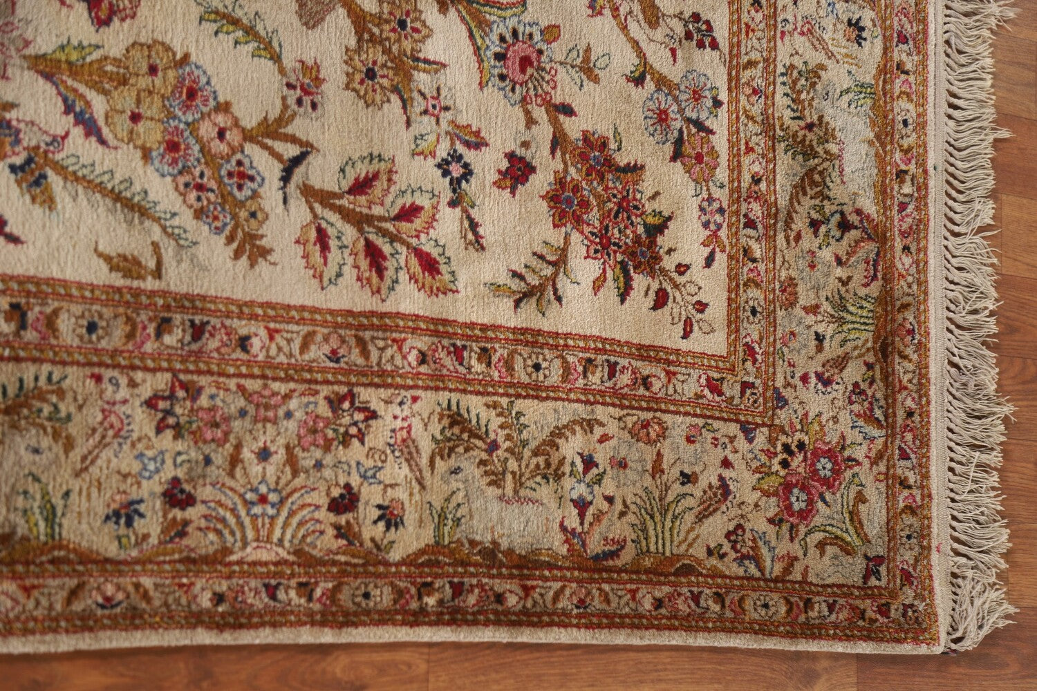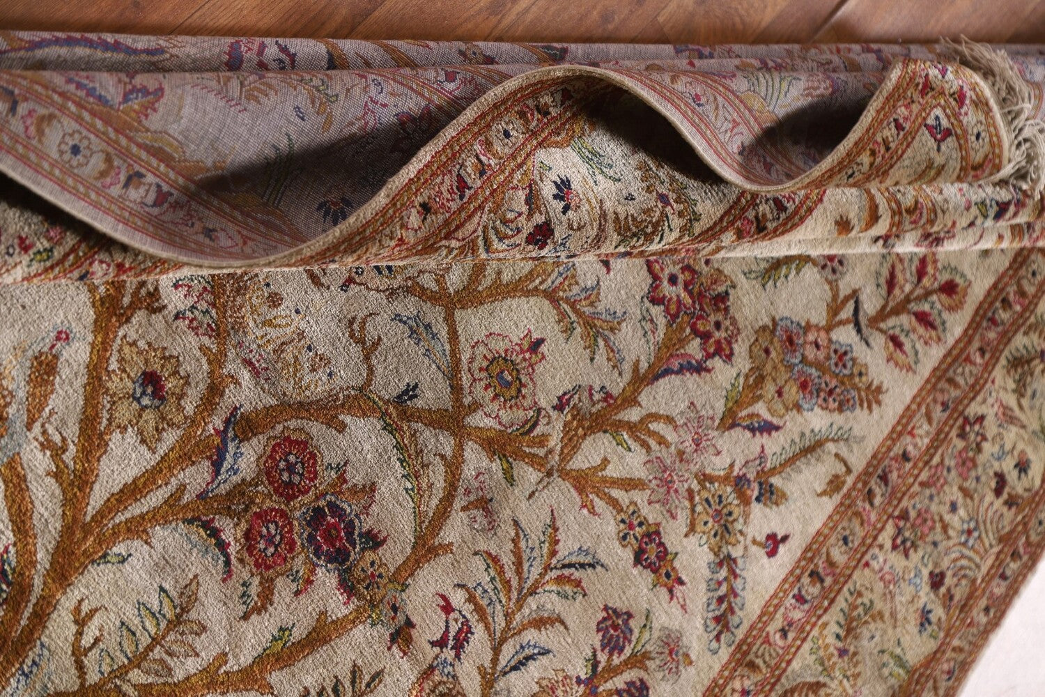 A Beautiful Genuine Persia ( Persia ) Kashan rug is Hand Knotted by skillful weavers in Persia ( Persia ) with 100% Silk Material. This rug is in Very Good condition. dimensions are 7' 5'' X 4' 8'' in foot and 226 X 142 in centimeter. the primary color is Beige & Ivories.