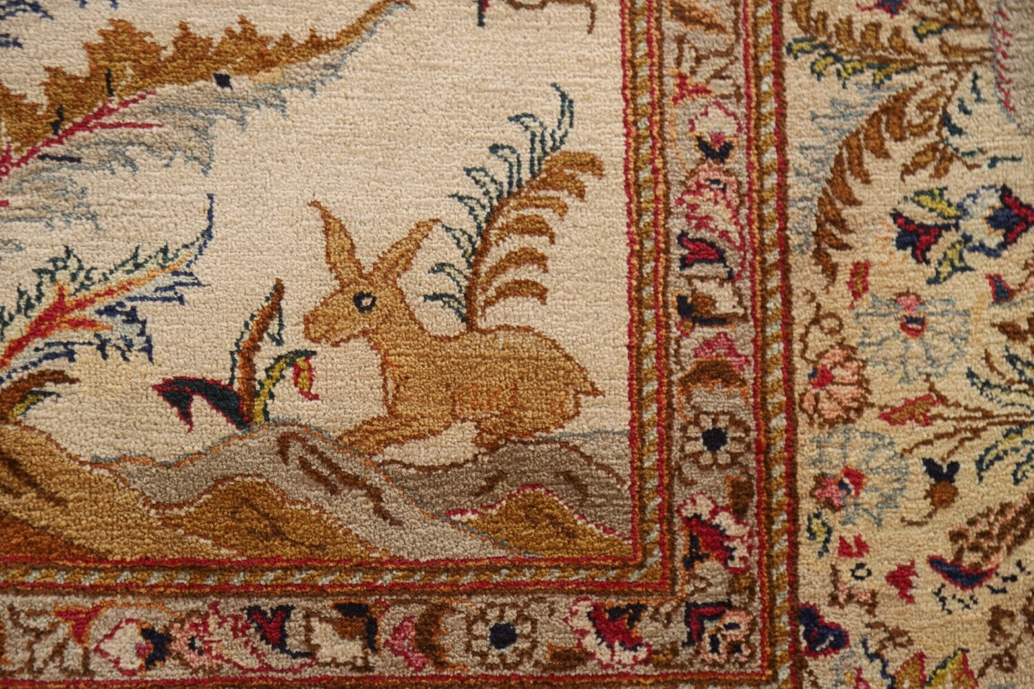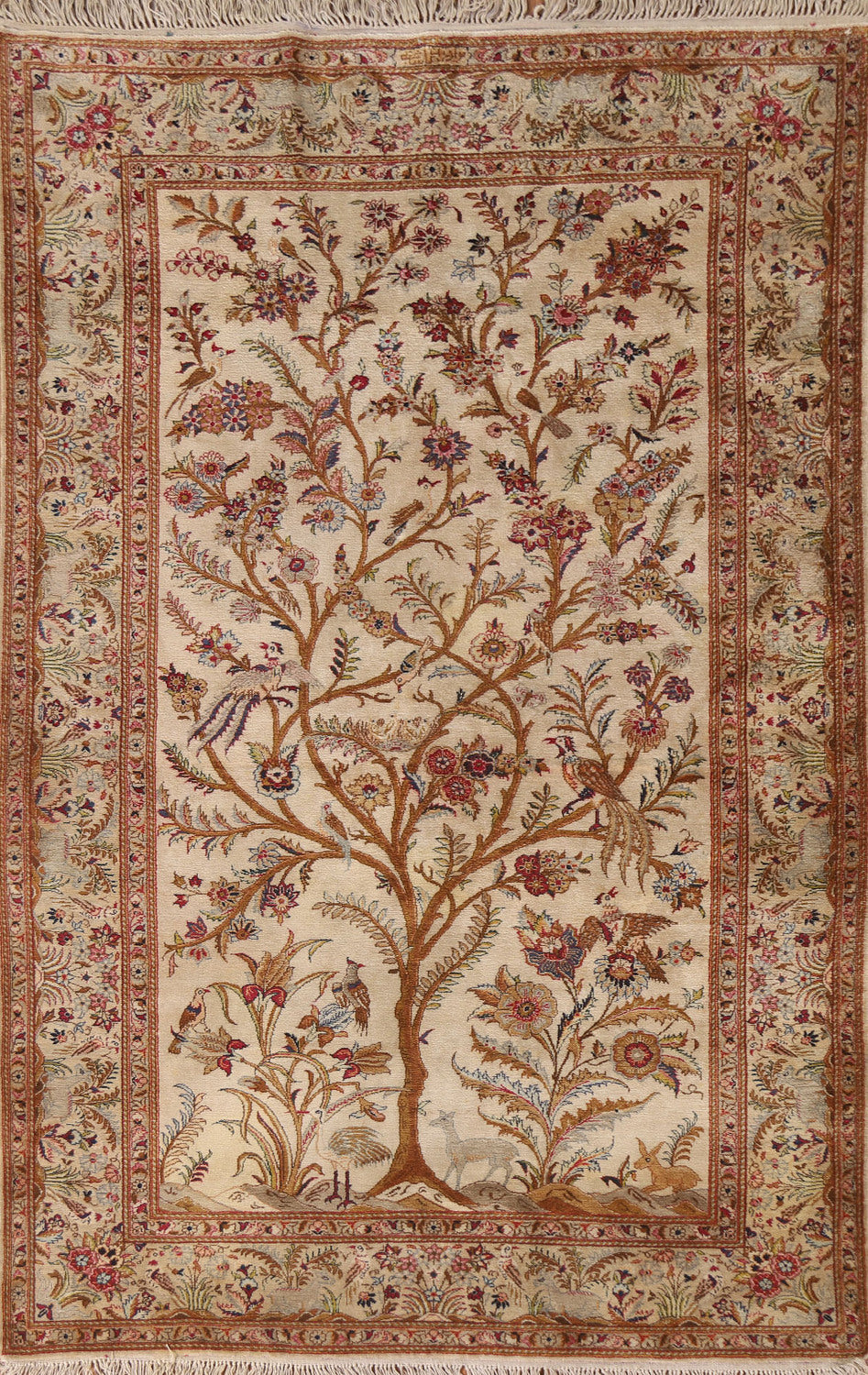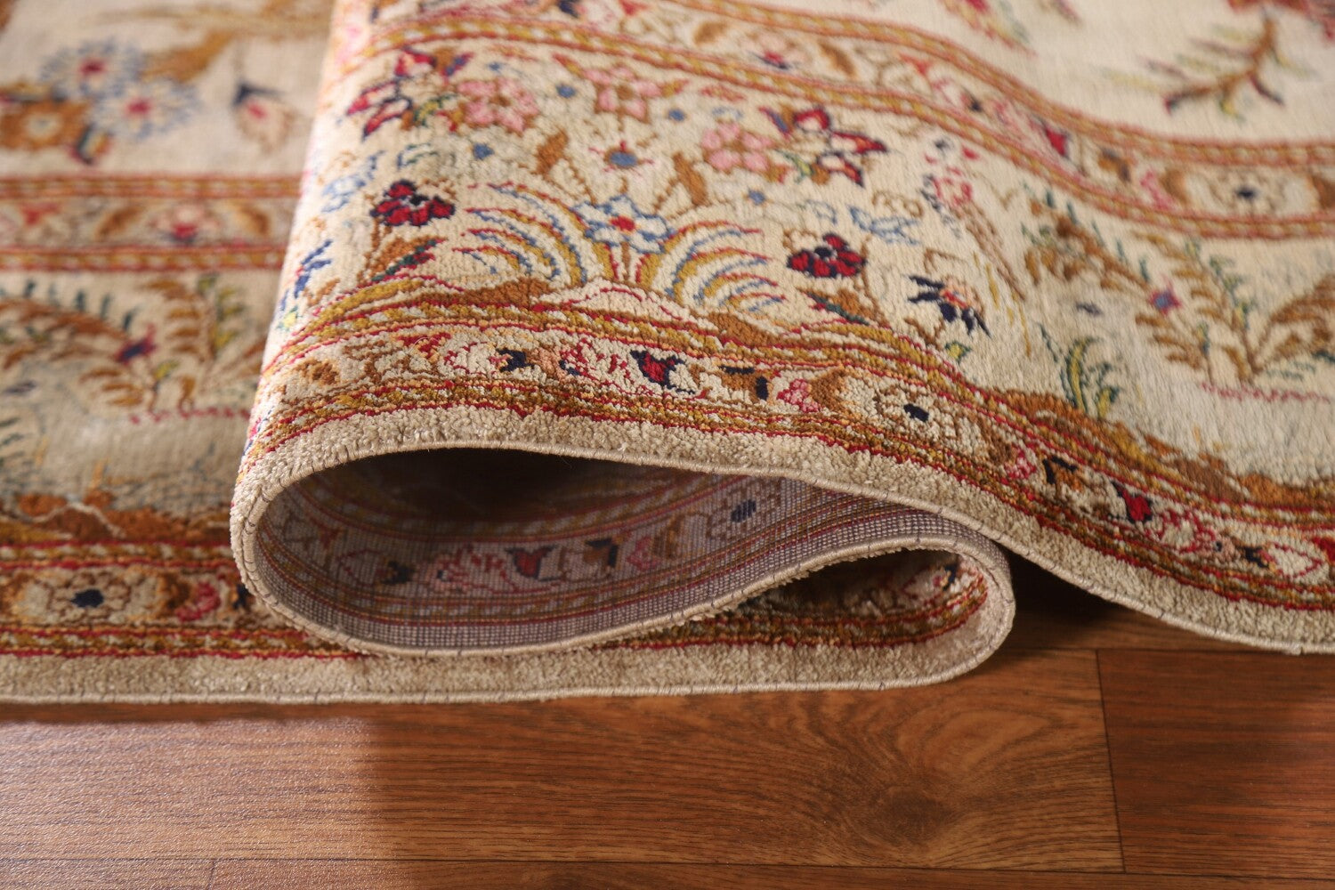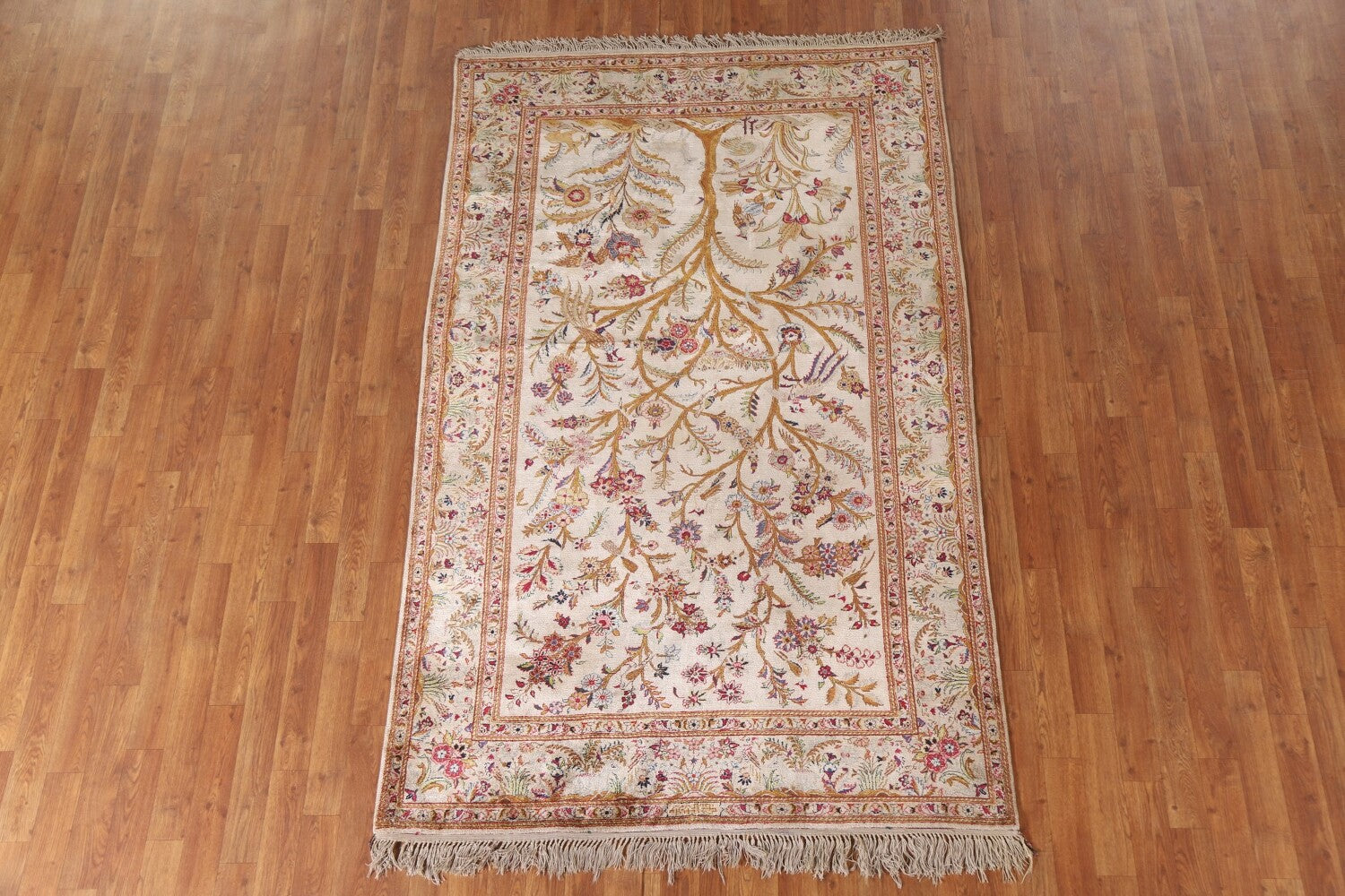 A Beautiful Genuine Persia ( Persia ) Kashan rug is Hand Knotted by skillful weavers in Persia ( Persia ) with 100% Silk Material. This rug is in Very Good condition. dimensions are 7' 5'' X 4' 8'' in foot and 226 X 142 in centimeter. the primary color is Beige & Ivories.