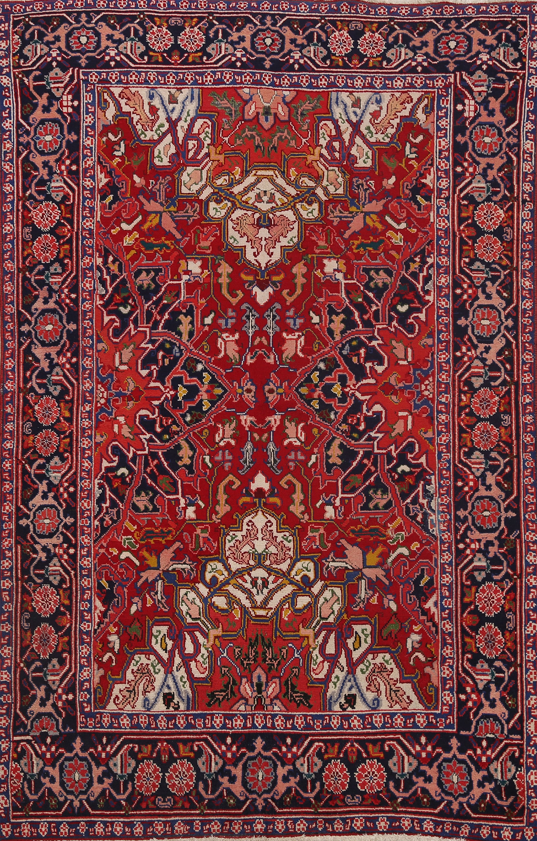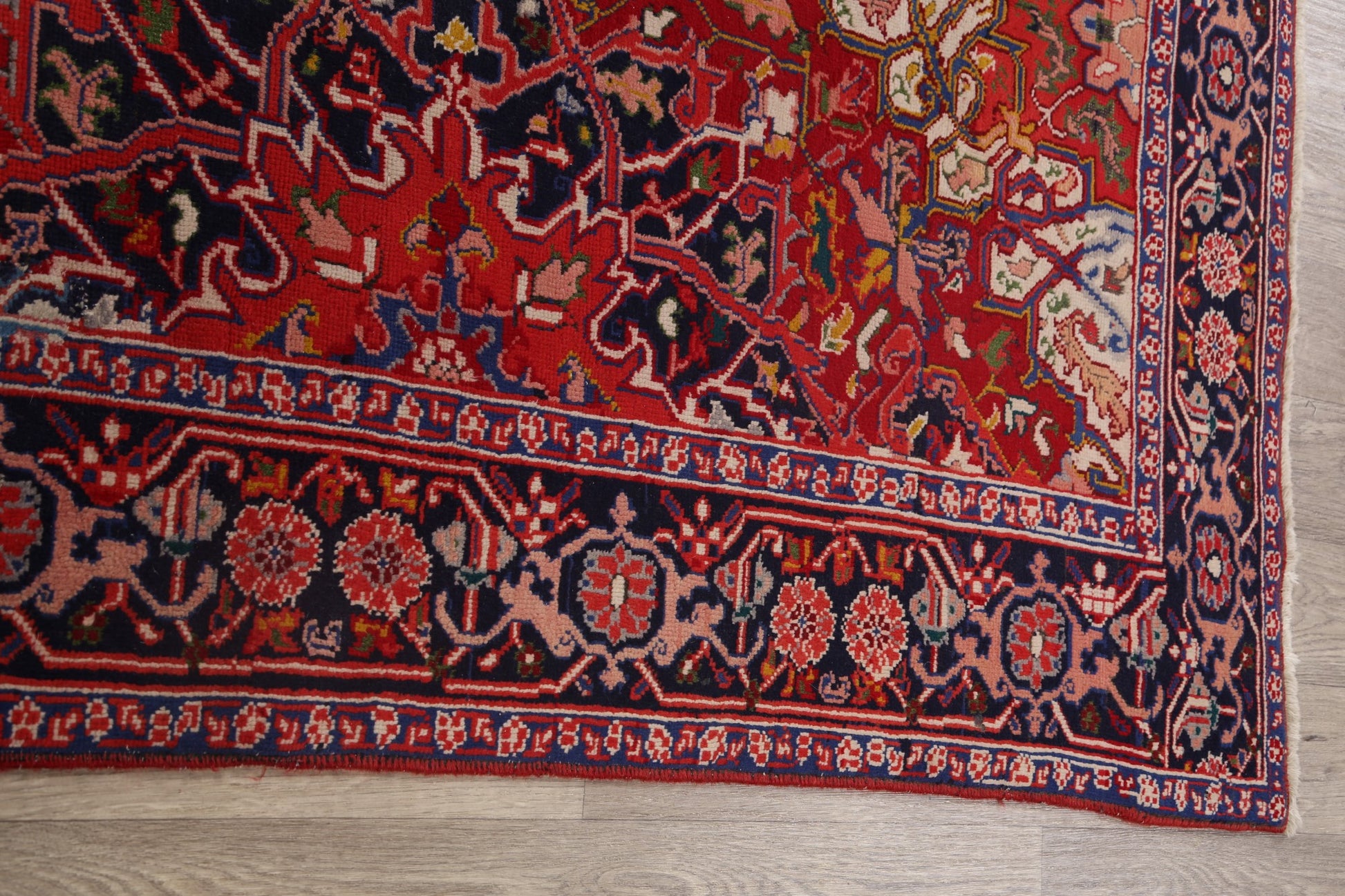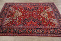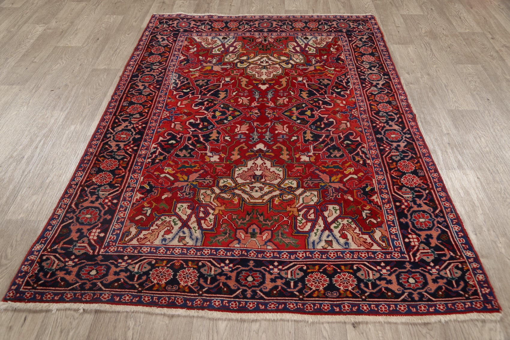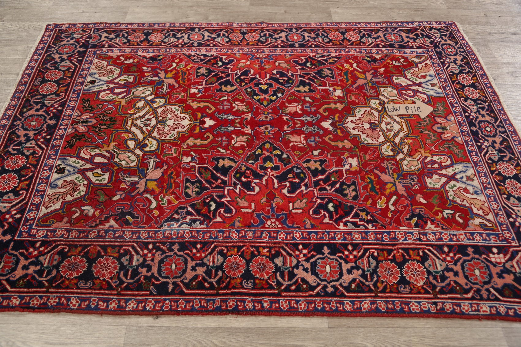 A Beautiful Genuine Persia ( Persia ) Heriz (serapi) rug is Hand Knotted by skillful weavers in Persia ( Persia ) with 100% Wool Material. This rug is in Very Good ( Low Pile ) condition. dimensions are 6' 4'' X 4' 6'' in foot and 193 X 137 in centimeter. the primary color is Red.