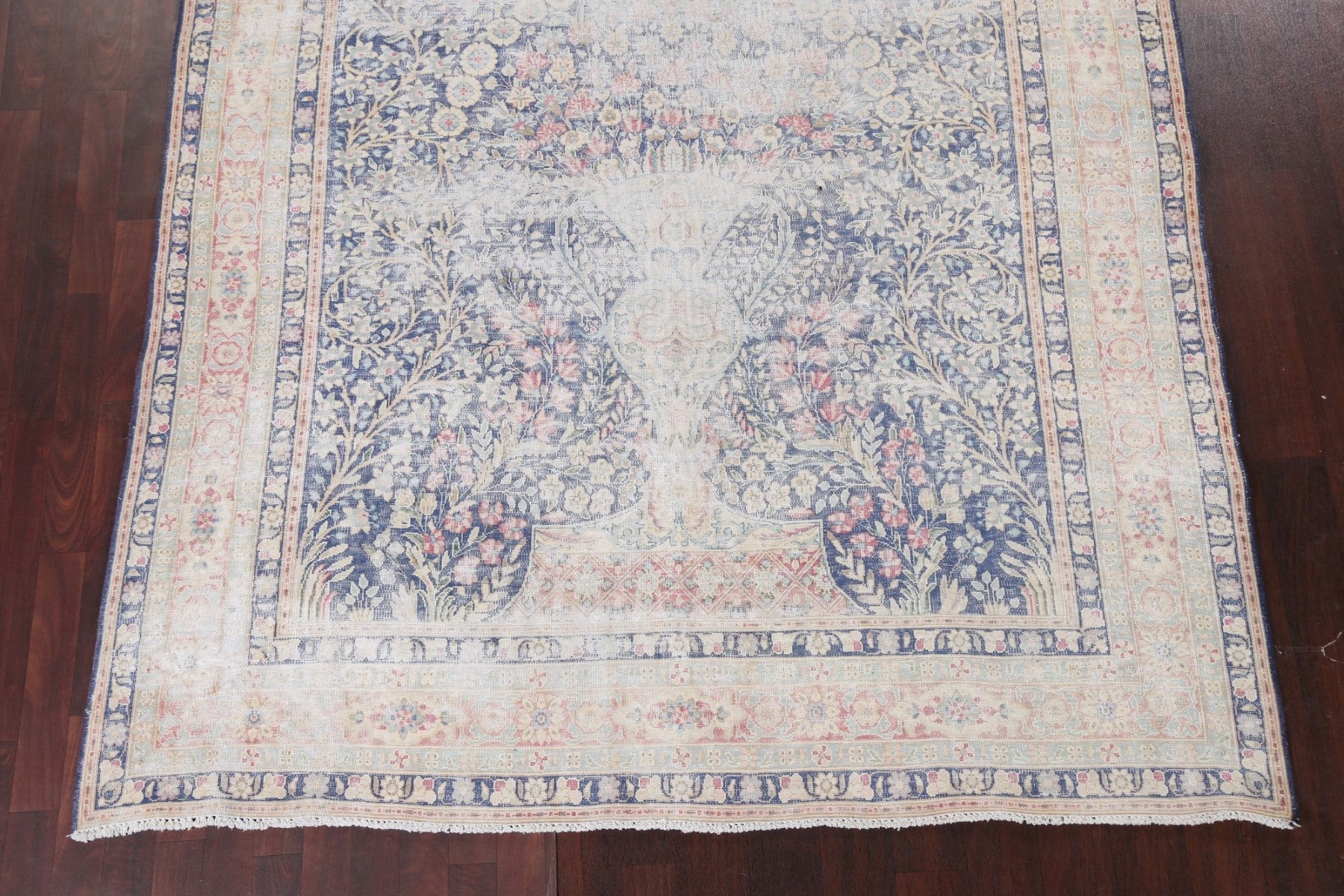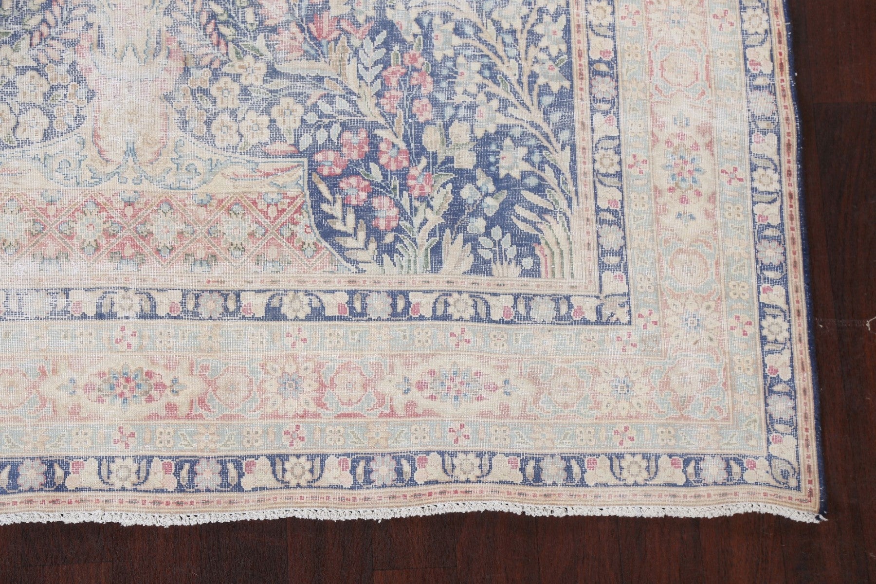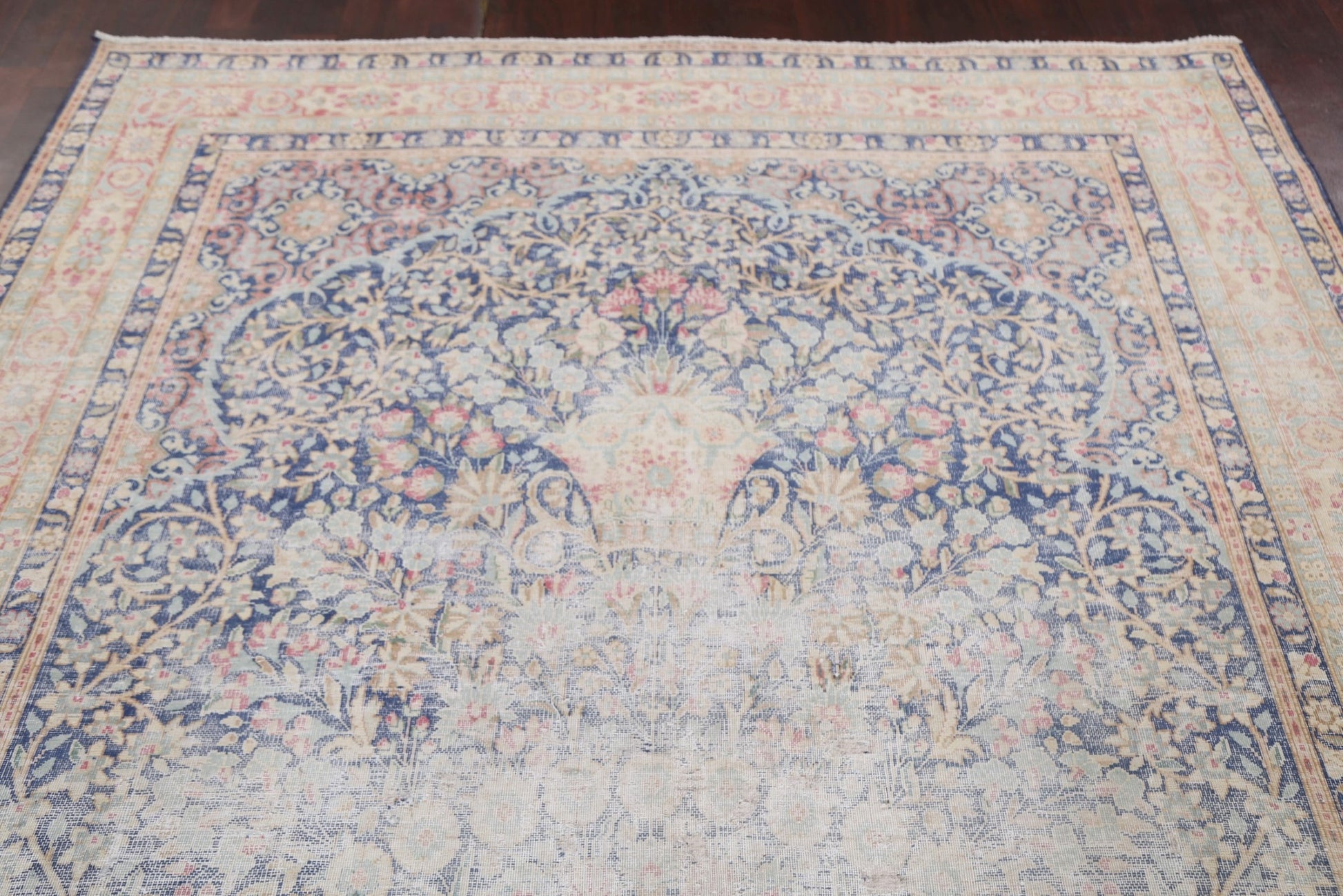 A Beautiful Genuine Persia ( Persia ) Kerman rug is Hand Knotted by skillful weavers in Persia ( Persia ) with 100% Wool Material. This rug is in Very Good (Evenly Low Pile) condition. dimensions are 10' 10'' X 6' 11'' in foot and 330 X 211 in centimeter. the primary color is Navy Blue & Blues.