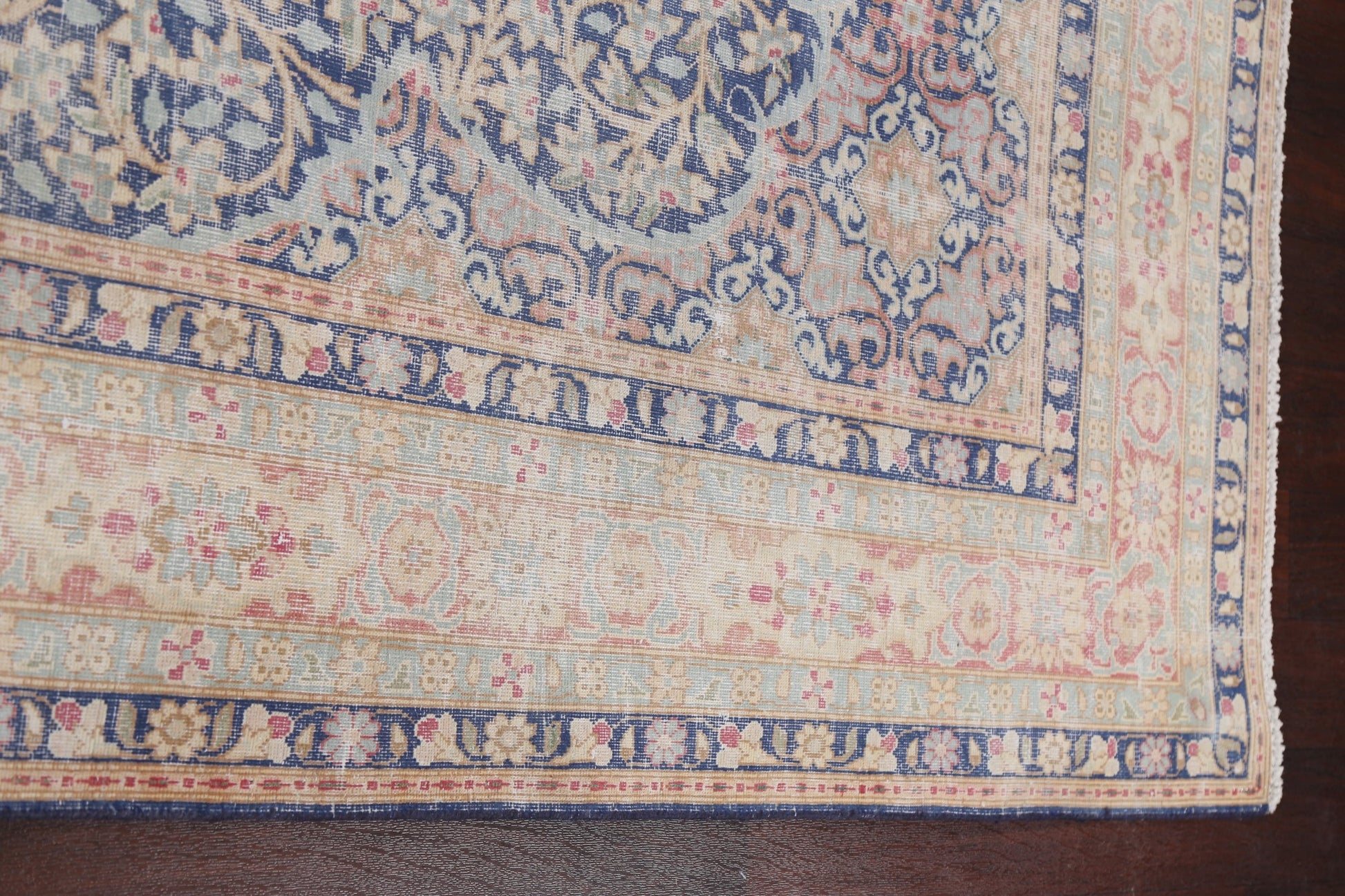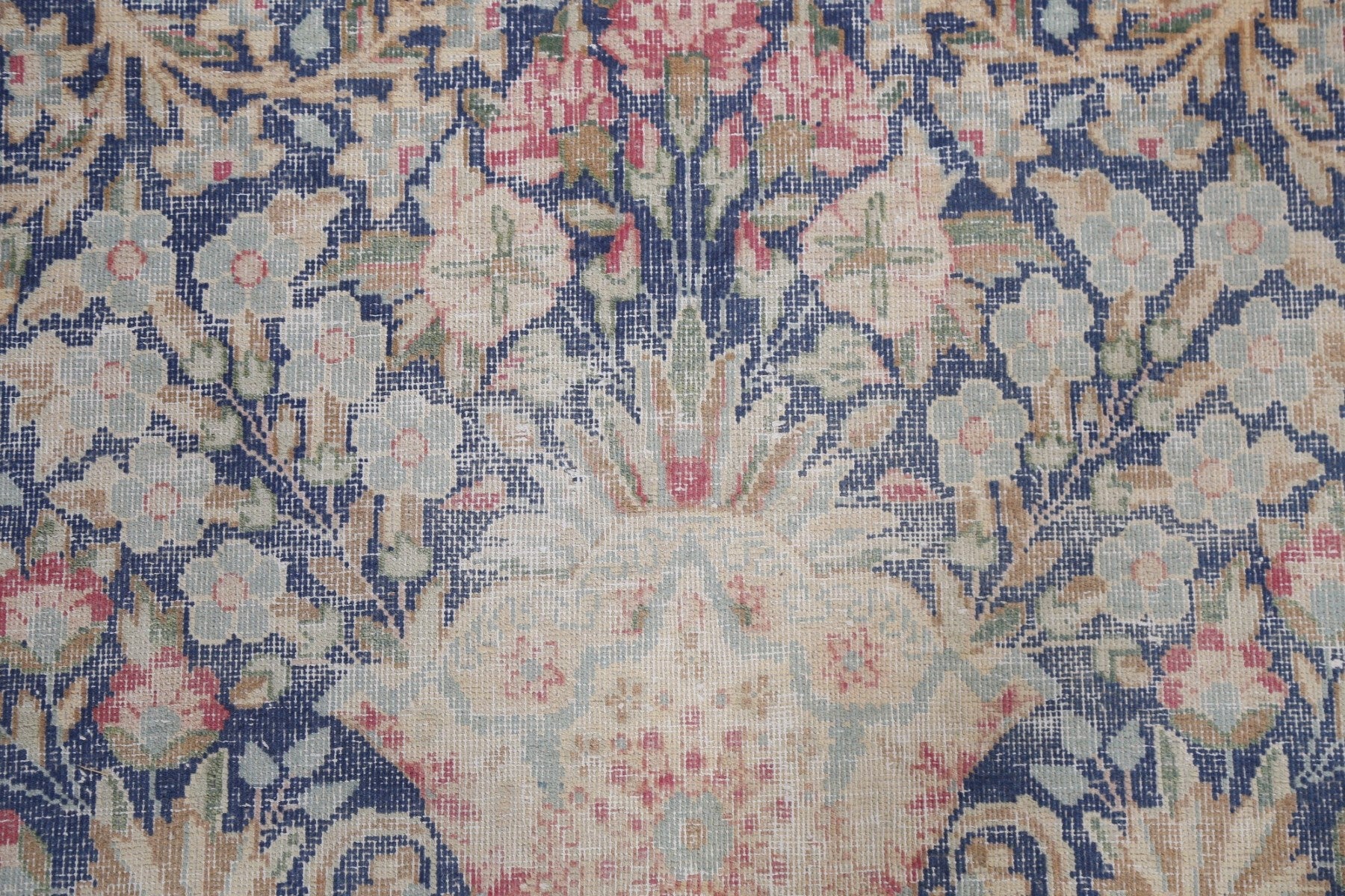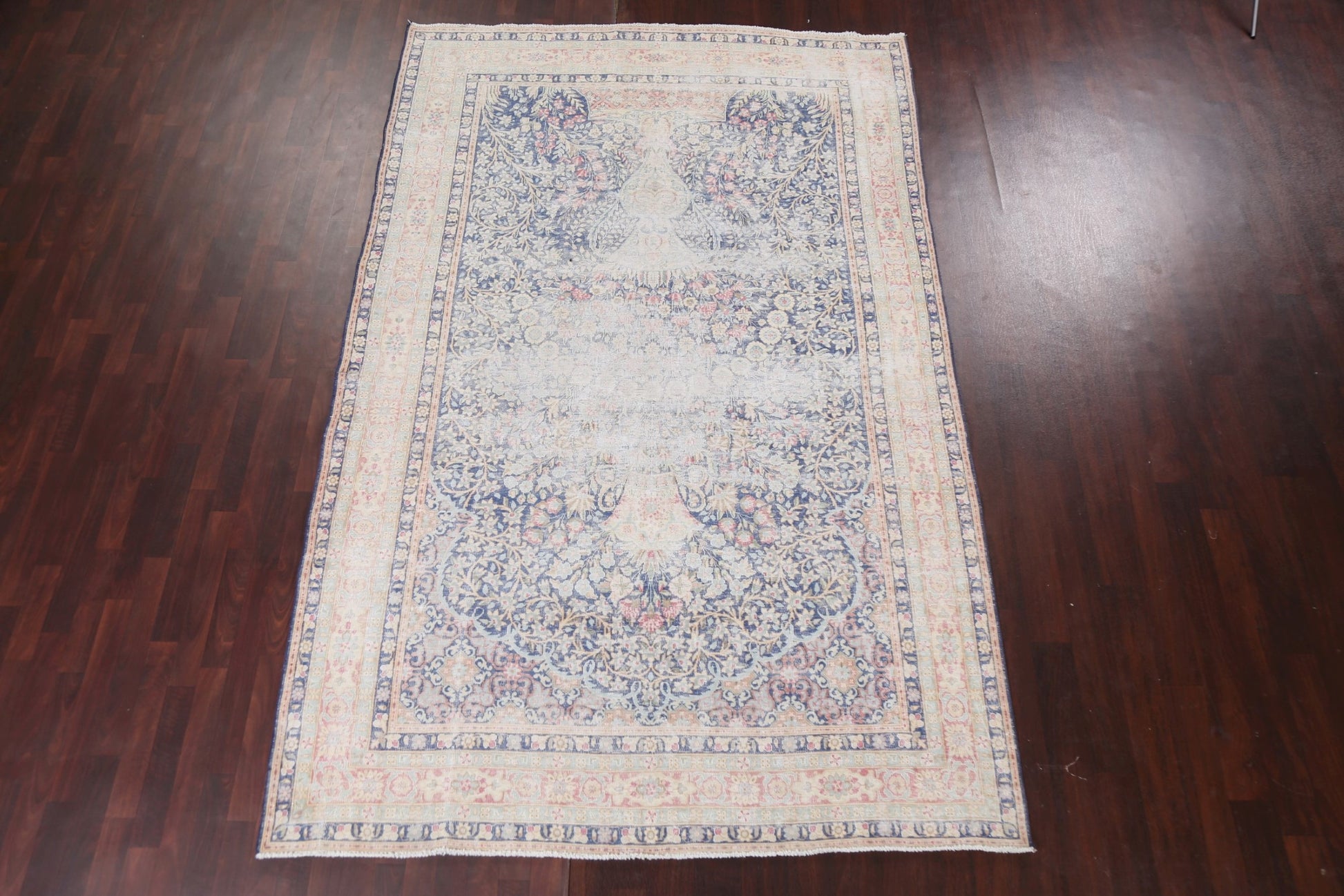 A Beautiful Genuine Persia ( Persia ) Kerman rug is Hand Knotted by skillful weavers in Persia ( Persia ) with 100% Wool Material. This rug is in Very Good (Evenly Low Pile) condition. dimensions are 10' 10'' X 6' 11'' in foot and 330 X 211 in centimeter. the primary color is Navy Blue & Blues.