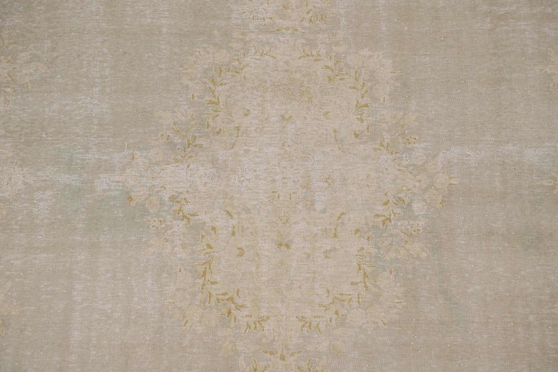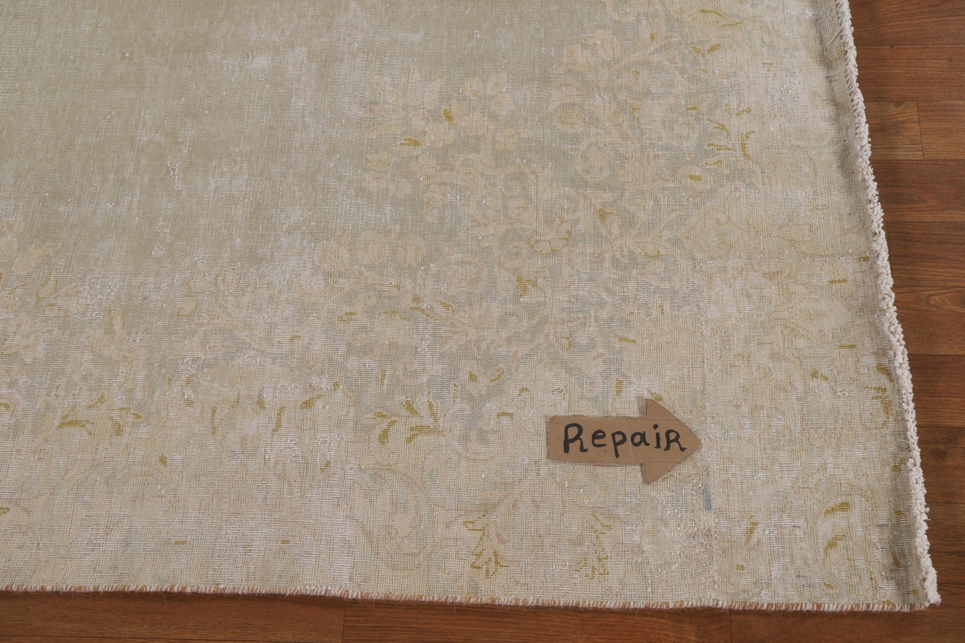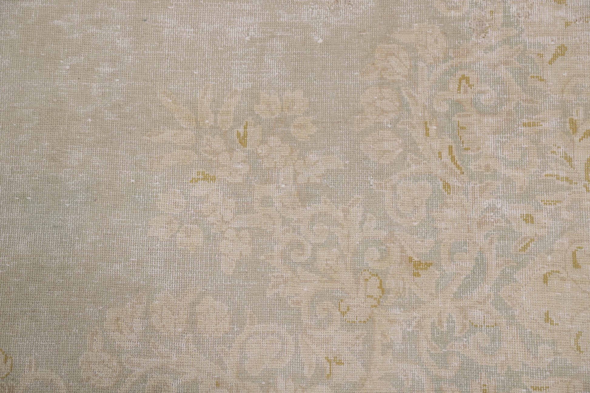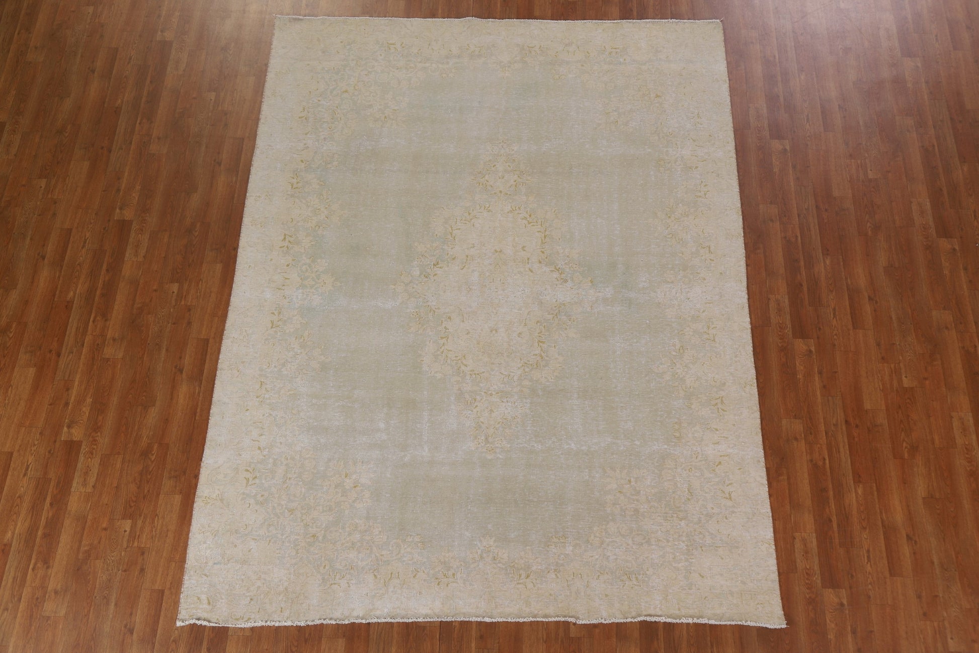 A Beautiful Genuine Persia ( Persia ) Kerman rug is Hand Knotted by skillful weavers in Persia ( Persia ) with 100% Wool Material. This rug is in Good (Evenly Low Pile-Repair) condition. dimensions are 9' 3'' X 7' 1'' in foot and 282 X 216 in centimeter. the primary color is Green.