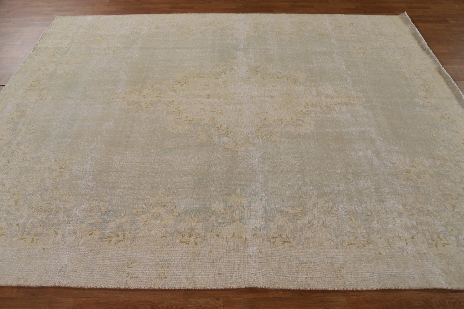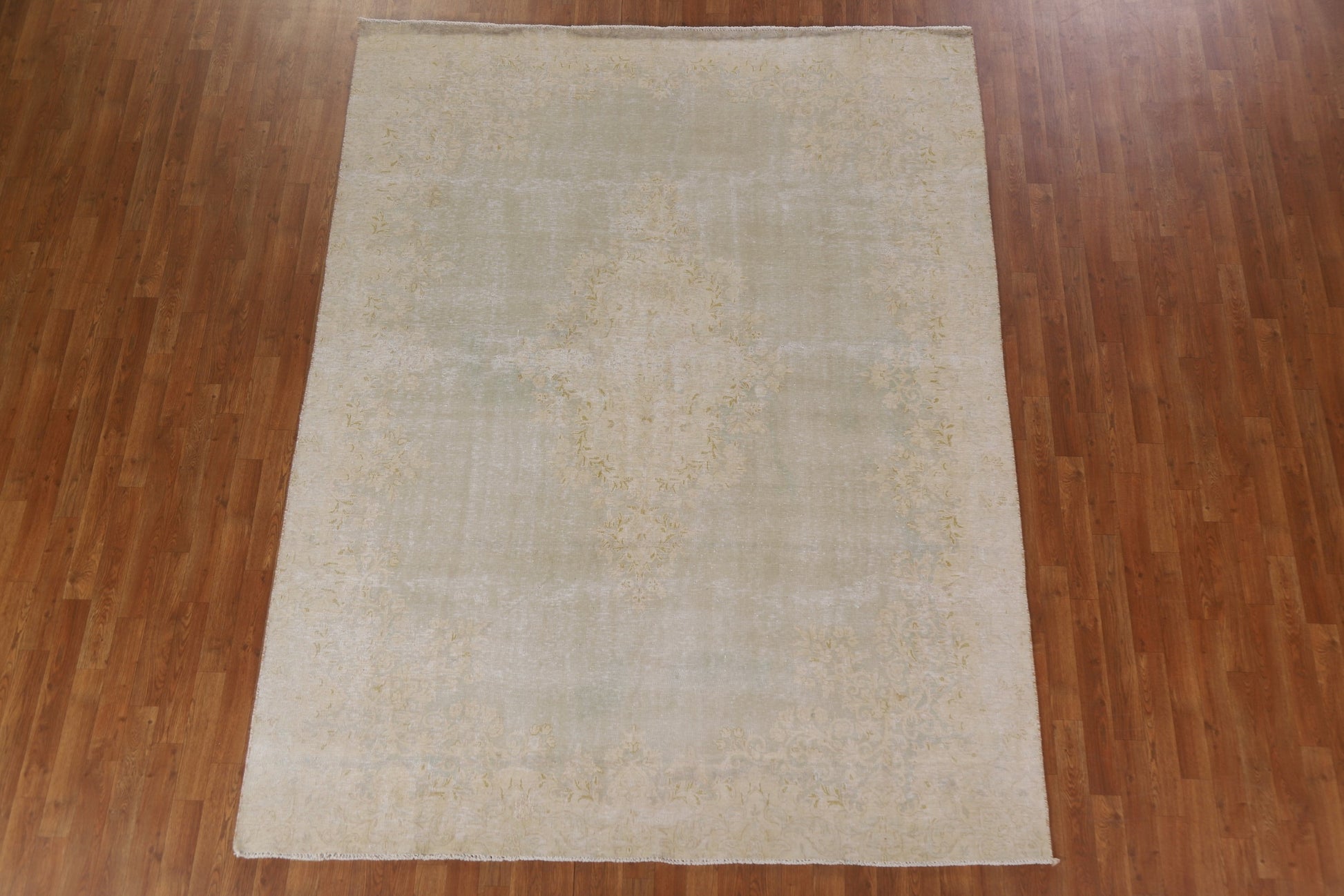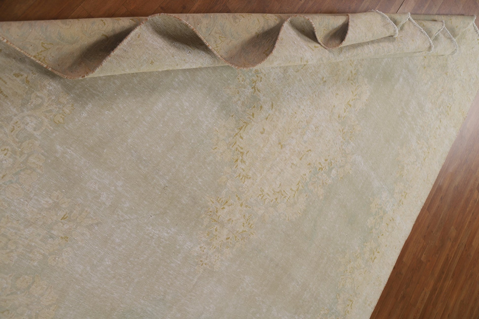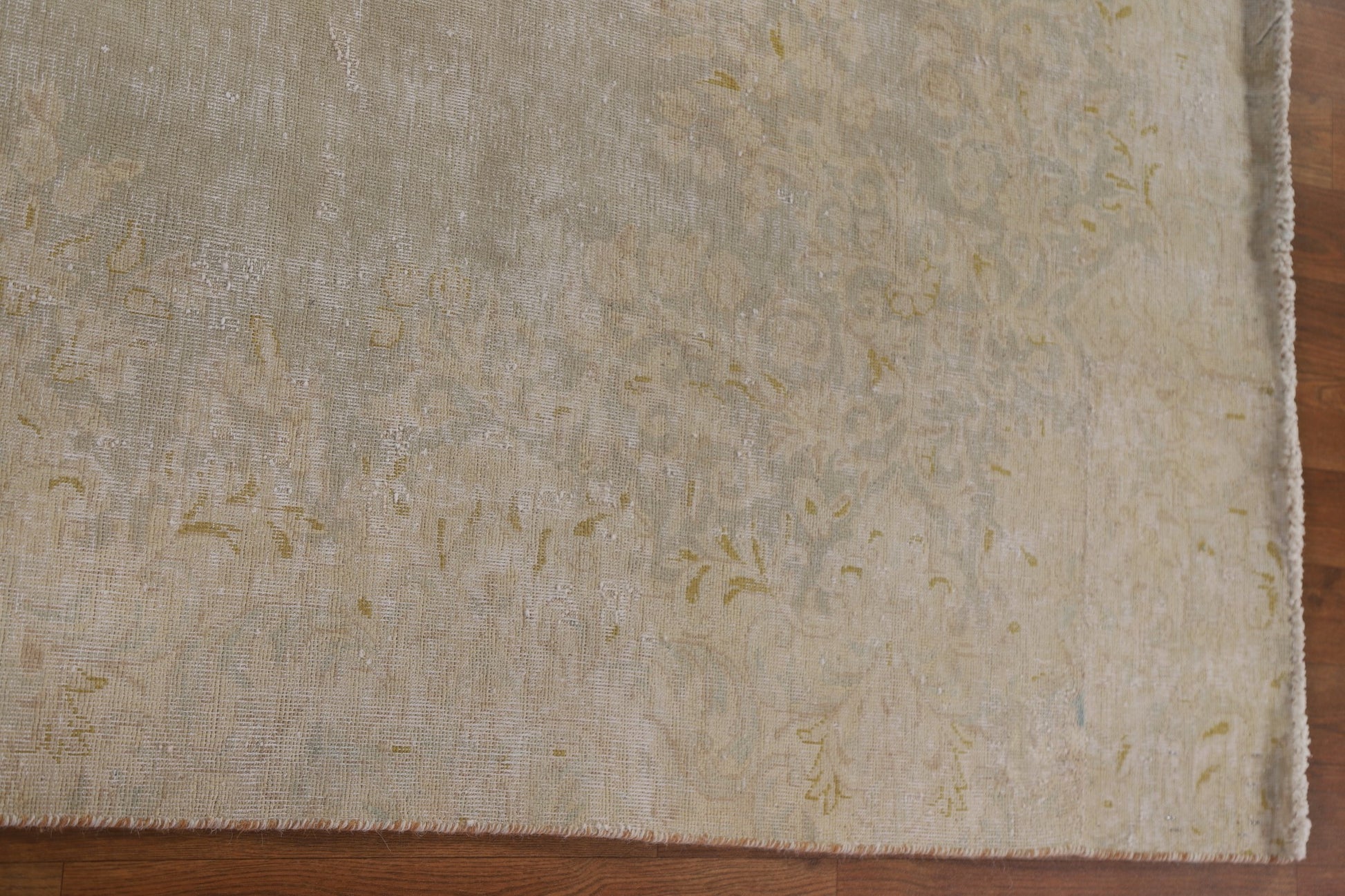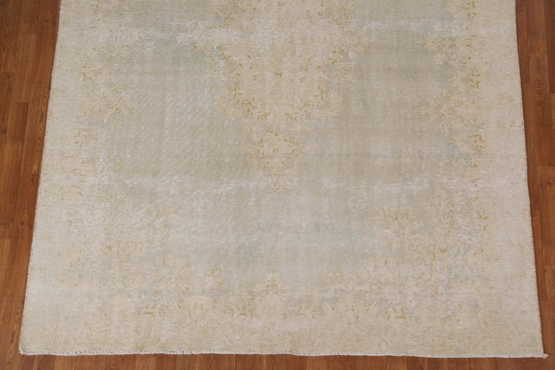 A Beautiful Genuine Persia ( Persia ) Kerman rug is Hand Knotted by skillful weavers in Persia ( Persia ) with 100% Wool Material. This rug is in Good (Evenly Low Pile-Repair) condition. dimensions are 9' 3'' X 7' 1'' in foot and 282 X 216 in centimeter. the primary color is Green.
