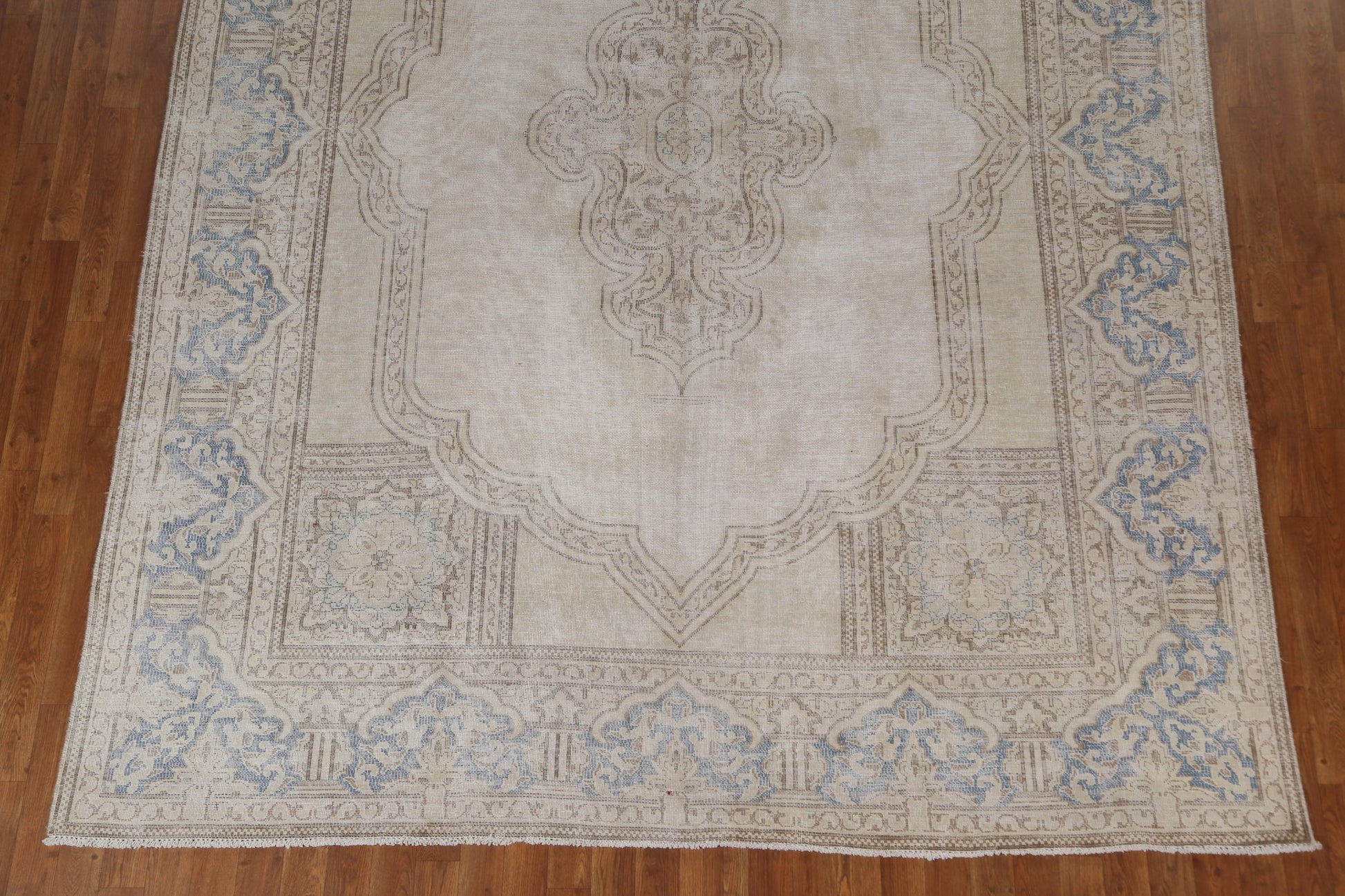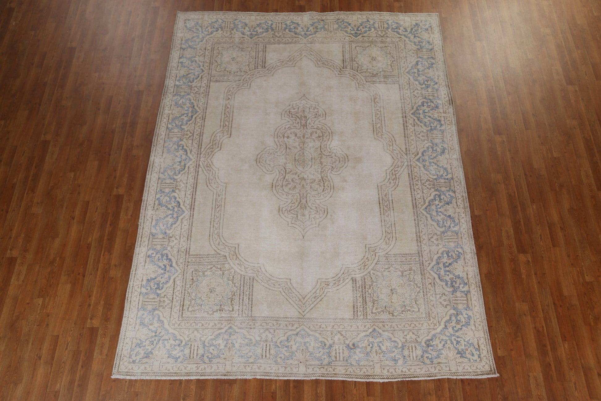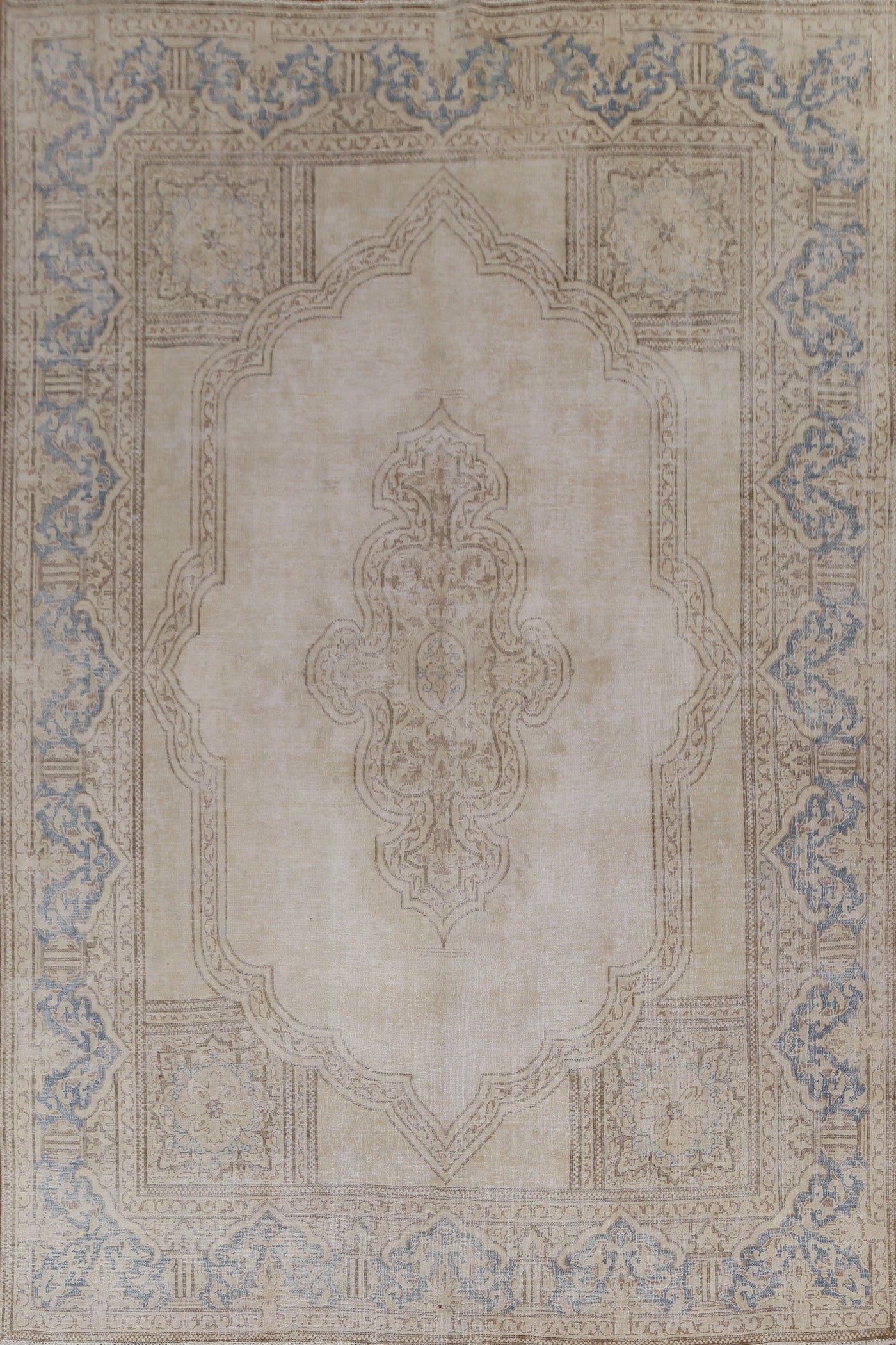 A Beautiful Genuine Persia ( Persia ) Kerman rug is Hand Knotted by skillful weavers in Persia ( Persia ) with 100% Wool Material. This rug is in Very Good (Evenly Low Pile) condition. dimensions are 10' 6'' X 7' 9'' in foot and 320 X 236 in centimeter. the primary color is Beige & Ivories.