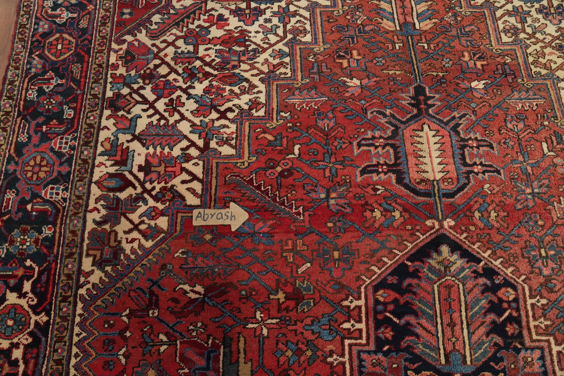 A Beautiful Genuine Persia ( Persia ) Heriz rug is Hand Knotted by skillful weavers in Persia ( Persia ) with 100% Wool Material. This rug is in Very Good (Abrash) condition. dimensions are 19' 4'' X 10' 3'' in foot and 589 X 312 in centimeter. the primary color is Red.