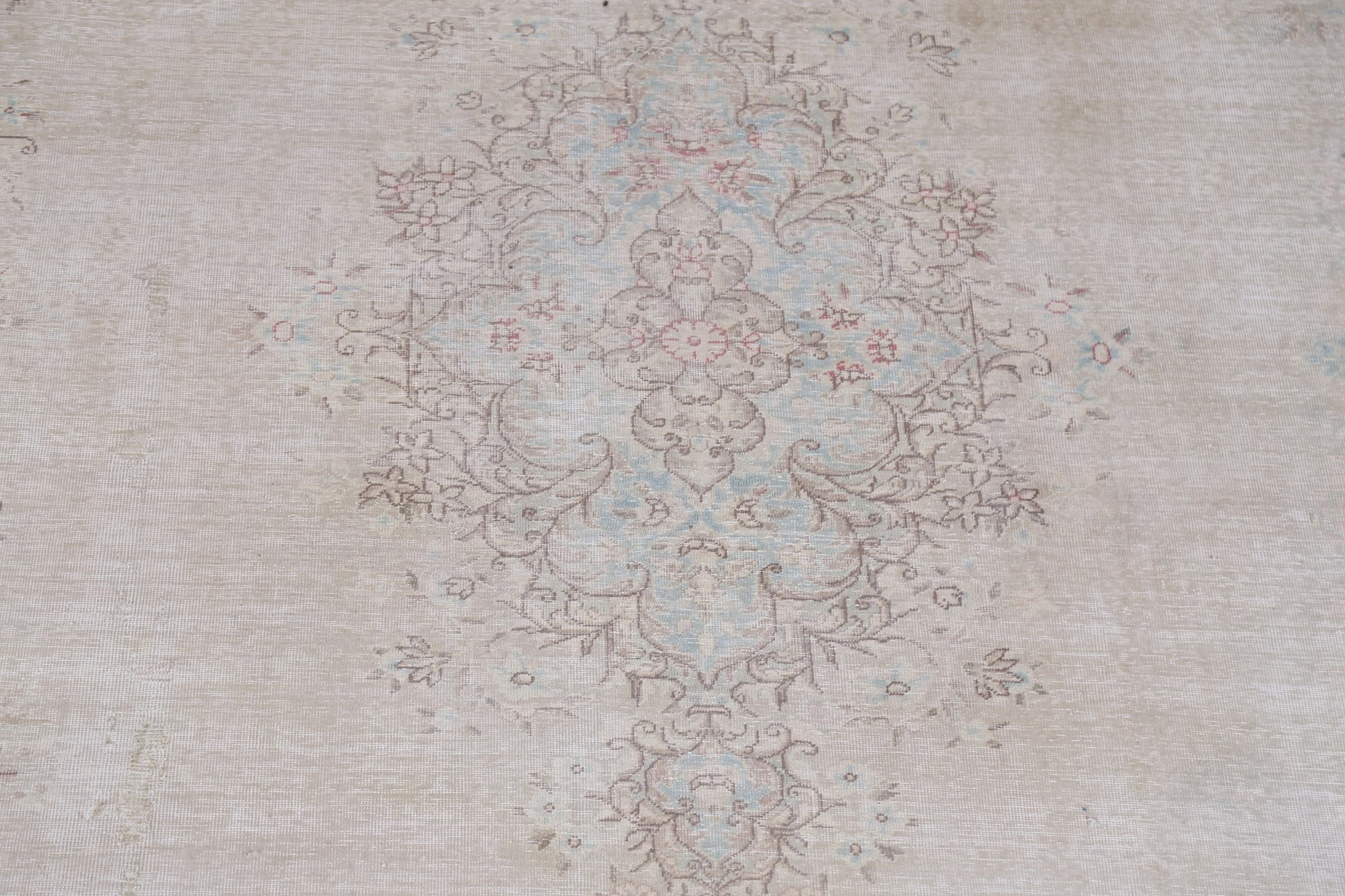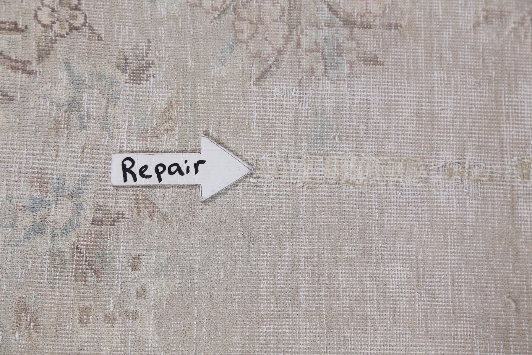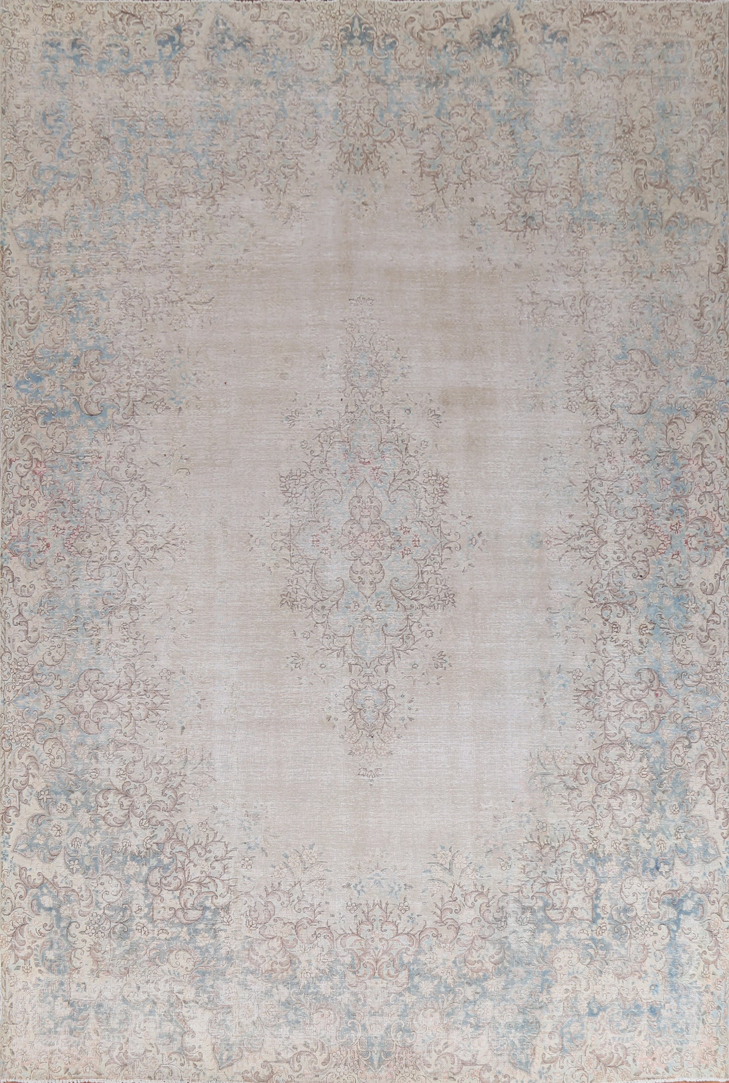 A Beautiful Genuine Persia ( Persia ) Kerman rug is Hand Knotted by skillful weavers in Persia ( Persia ) with 100% Wool Material. This rug is in Very Good (Evenly Low Pile-Repair) condition. dimensions are 12' 11'' X 9' 7'' in foot and 394 X 292 in centimeter. the primary color is Beige & Ivories.