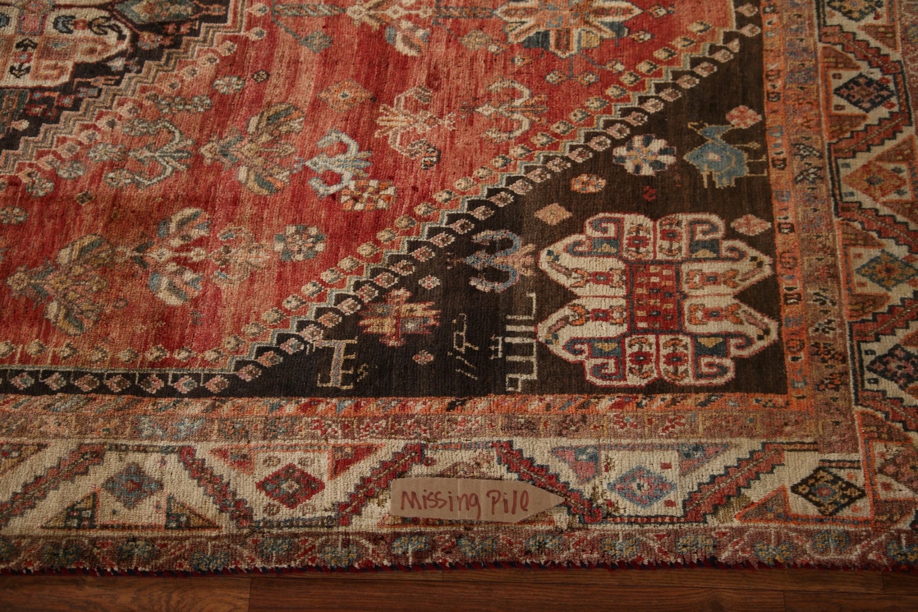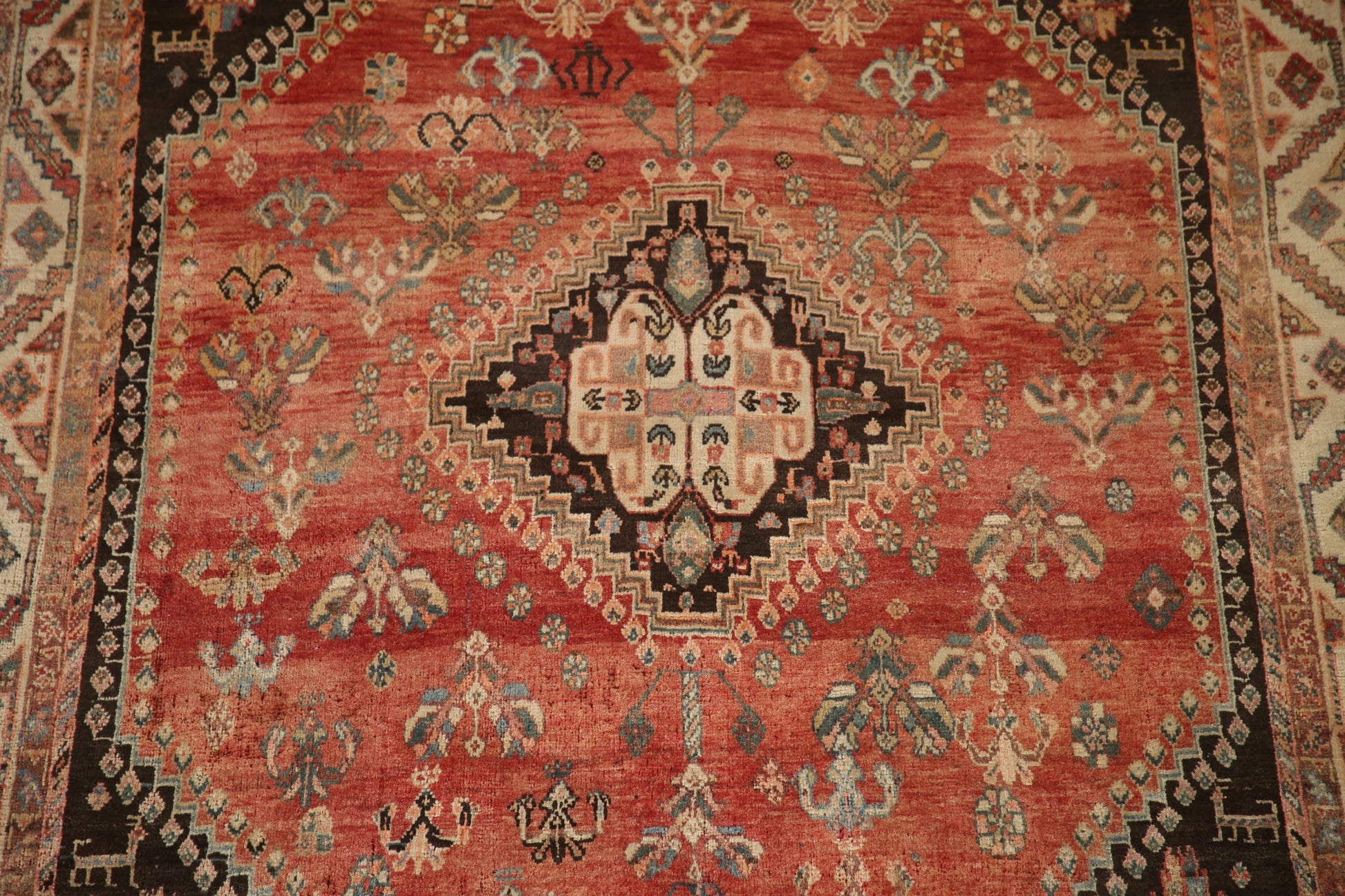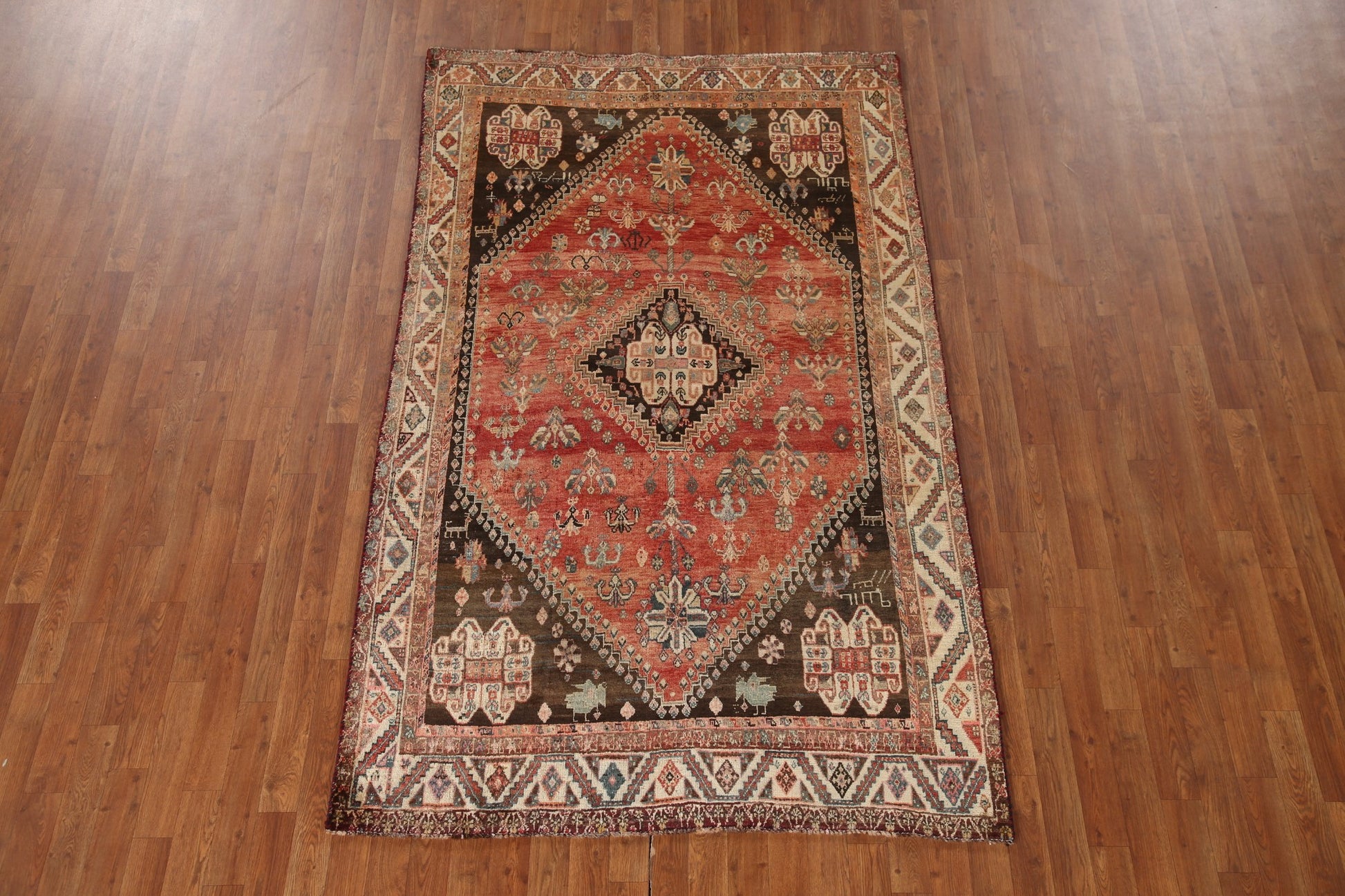 A Beautiful Genuine Persia ( Persia ) Shiraz rug is Hand Knotted by skillful weavers in Persia ( Persia ) with 100% Wool Material. This rug is in Very Good (Missing Pile- Abrash) condition. dimensions are 7' 10'' X 4' 10'' in foot and 239 X 147 in centimeter. the primary color is Oranges & Rust.