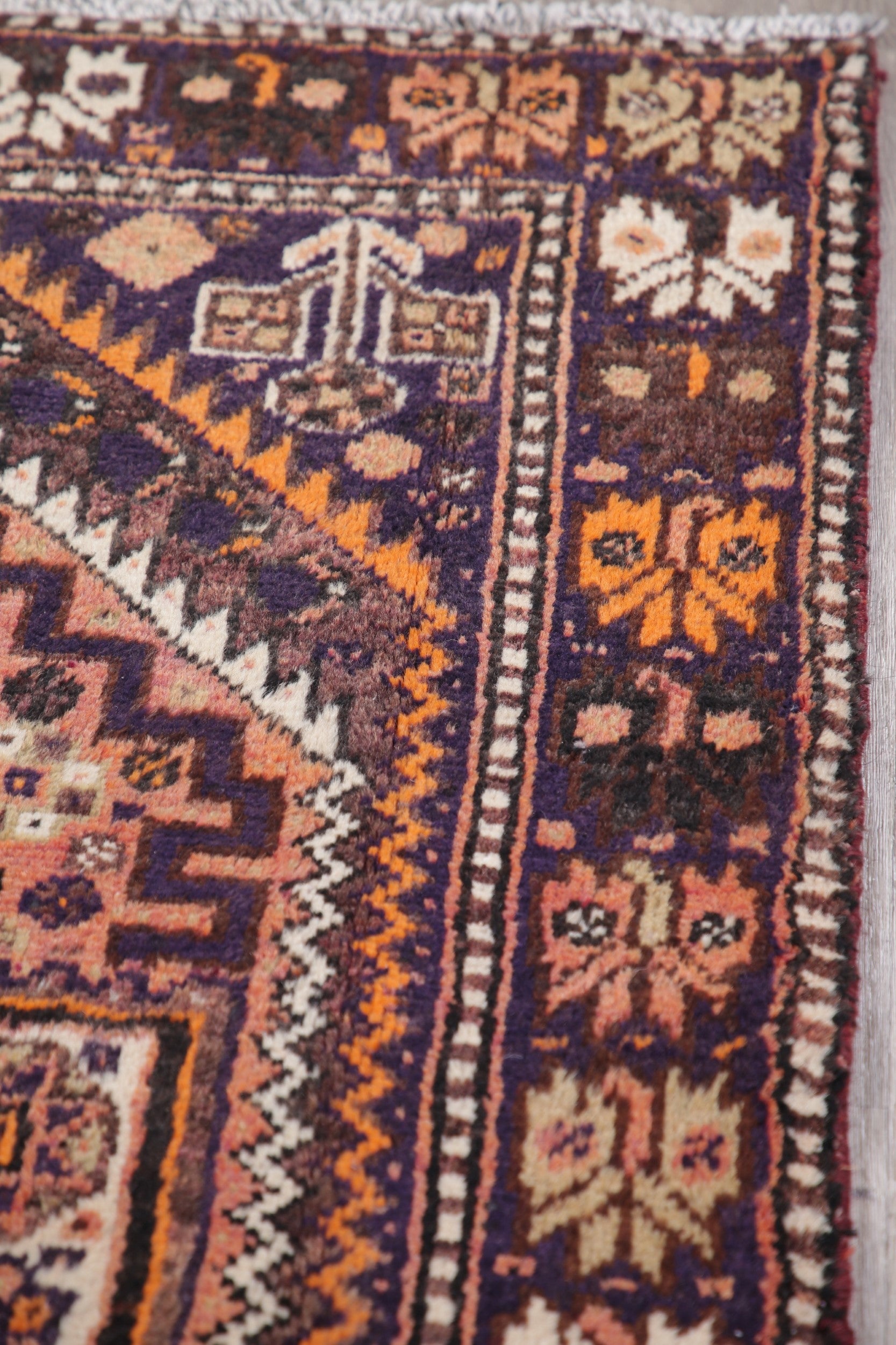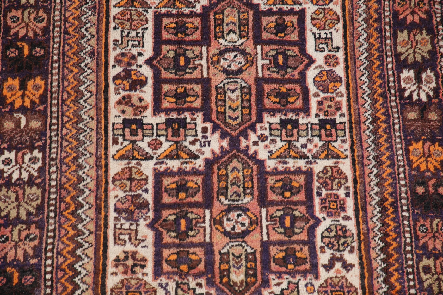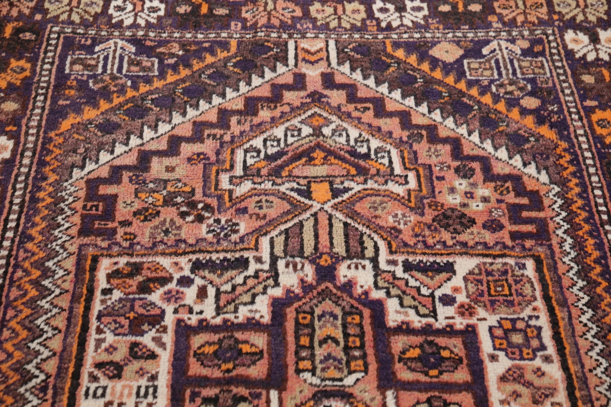 A Beautiful Genuine Persia ( Persia ) Shiraz rug is Hand Knotted by skillful weavers in Persia ( Persia ) with 100% Wool Material. This rug is in Very Good ( Low Pile ) condition. dimensions are 8' 10'' X 3' 11'' in foot and 269 X 119 in centimeter. the primary color is Beige & Ivories.